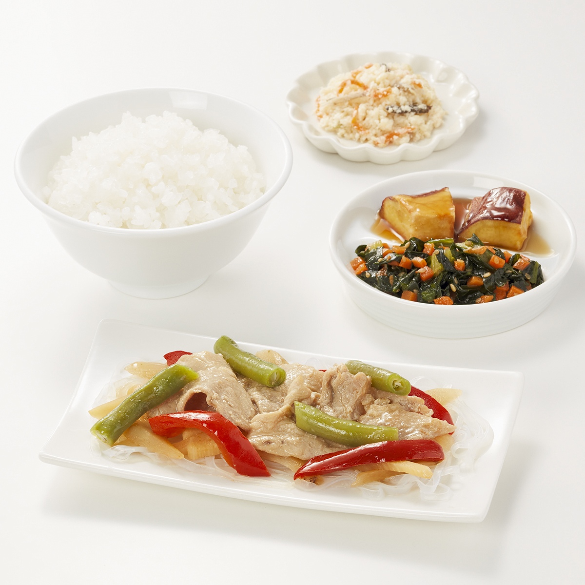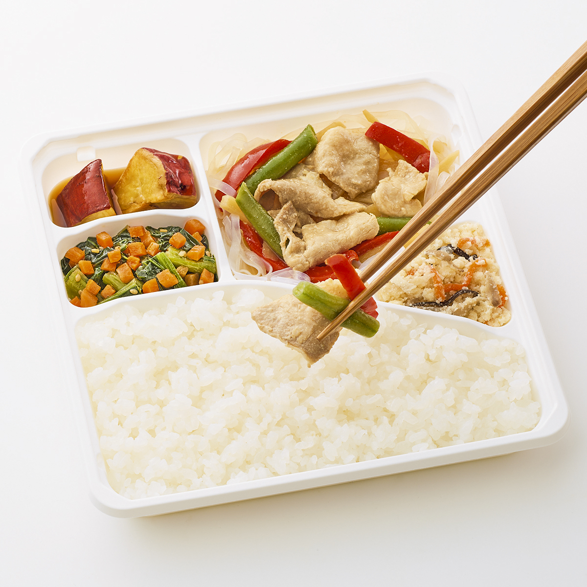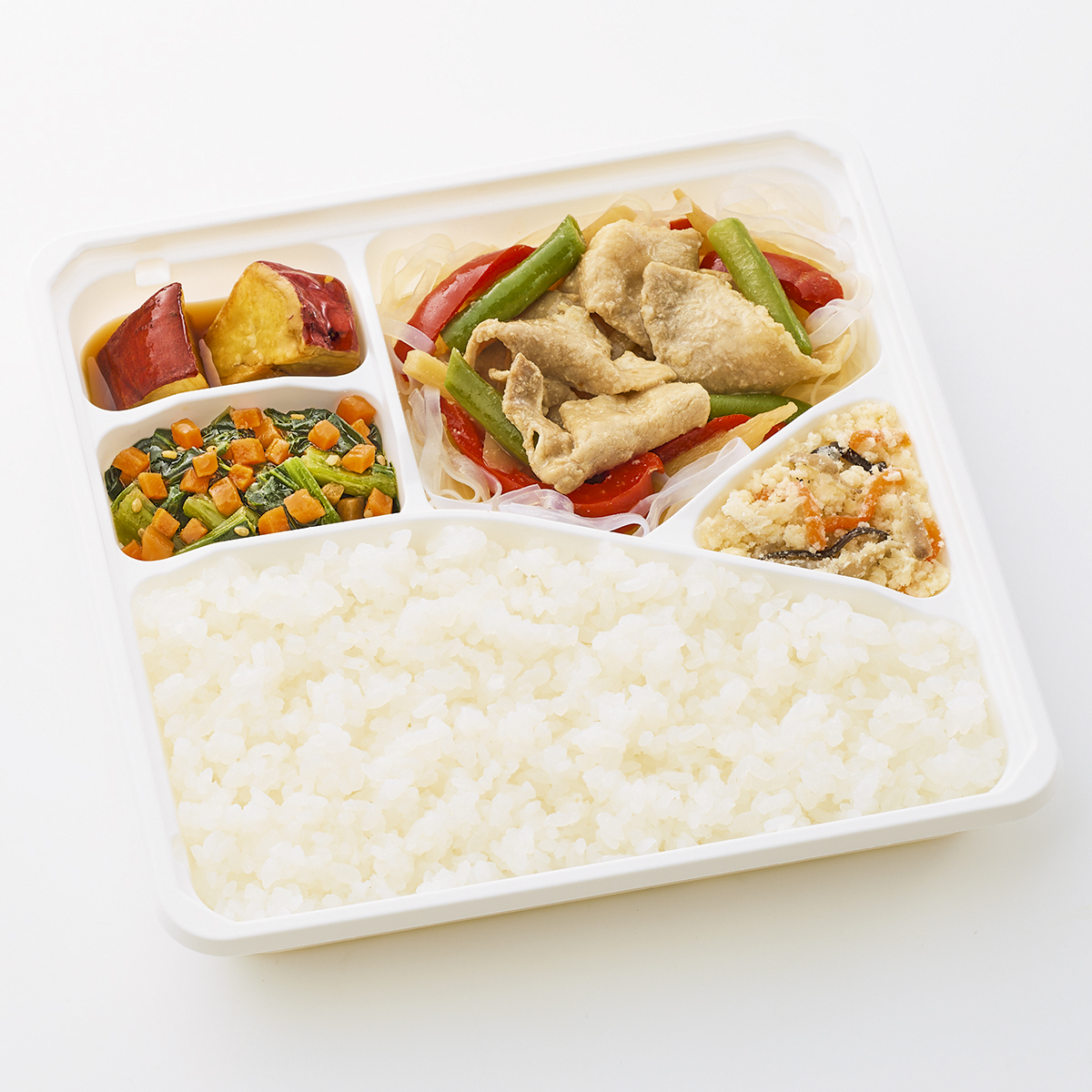 | 原材料名 | 加工米、豚肉、さつまいも、小松菜、卯の花(おから、なたね油、人参、ねぎ、その他)、赤ピーマン、植物油、いんげん、醤油、ごぼう、たけのこ水煮、砂糖、人参、みりん、春雨、ごま、鶏がら調味料/安定剤(グァー分解物)、加工デンプン、ソルビット、調味料(アミノ酸等)、酸味料、pH調整剤、甘味料(カンゾウ)、(一部に小麦、ごま、大豆、鶏肉、豚肉を含む) | ||
