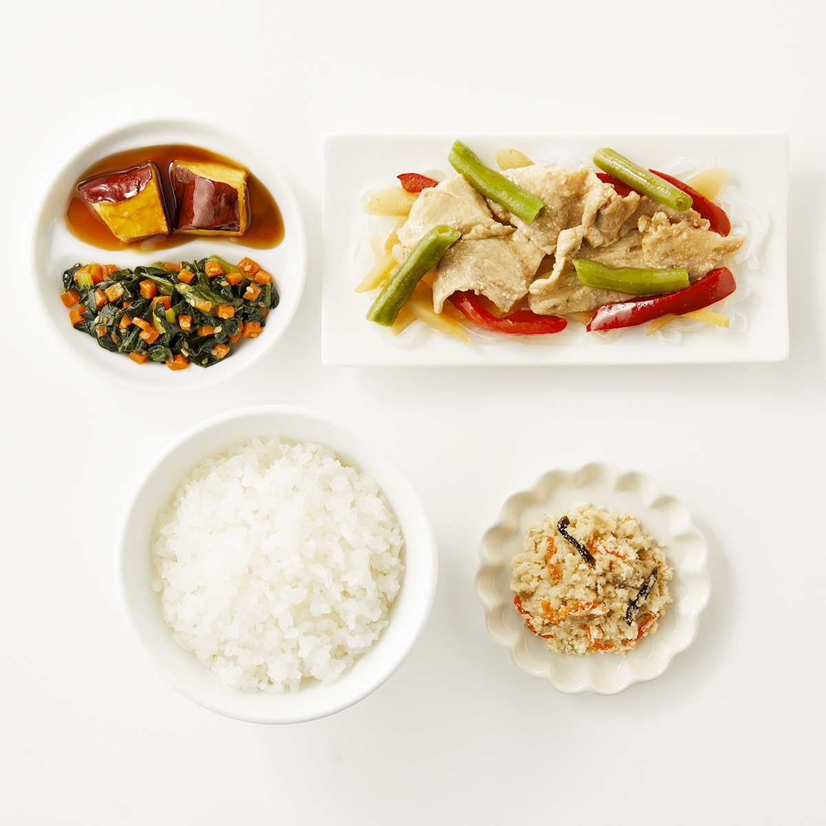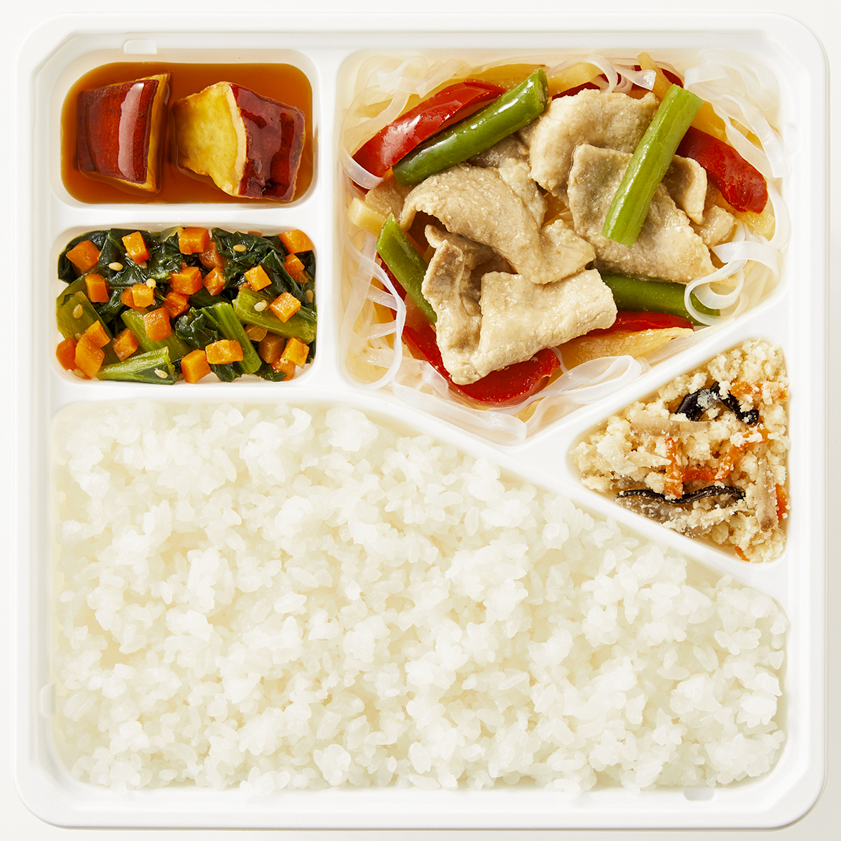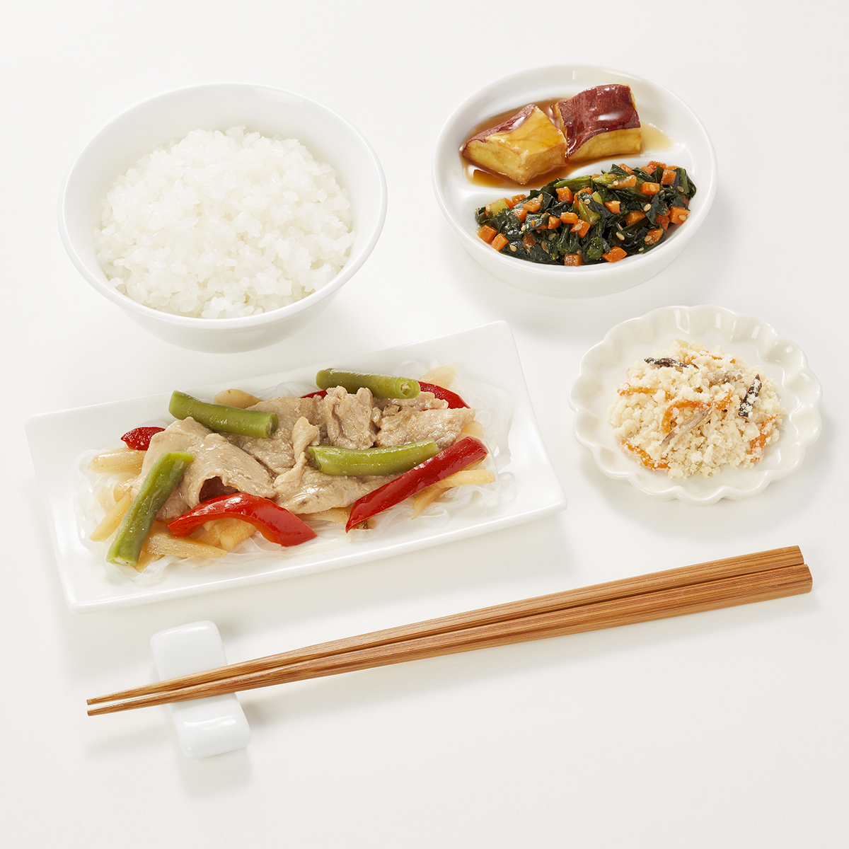 | 原材料名 | 加工米、豚肉、さつまいも、小松菜、卯の花(おから、なたね油、人参、ねぎ、その他)、赤ピーマン、植物油、いんげん、醤油、ごぼう、たけのこ水煮、砂糖、人参、みりん、春雨、ごま、鶏がら調味料/安定剤(グァー分解物)、加工デンプン、ソルビット、調味料(アミノ酸等)、酸味料、pH調整剤、甘味料(カンゾウ)、(一部に小麦、ごま、大豆、鶏肉、豚肉を含む) | ||
