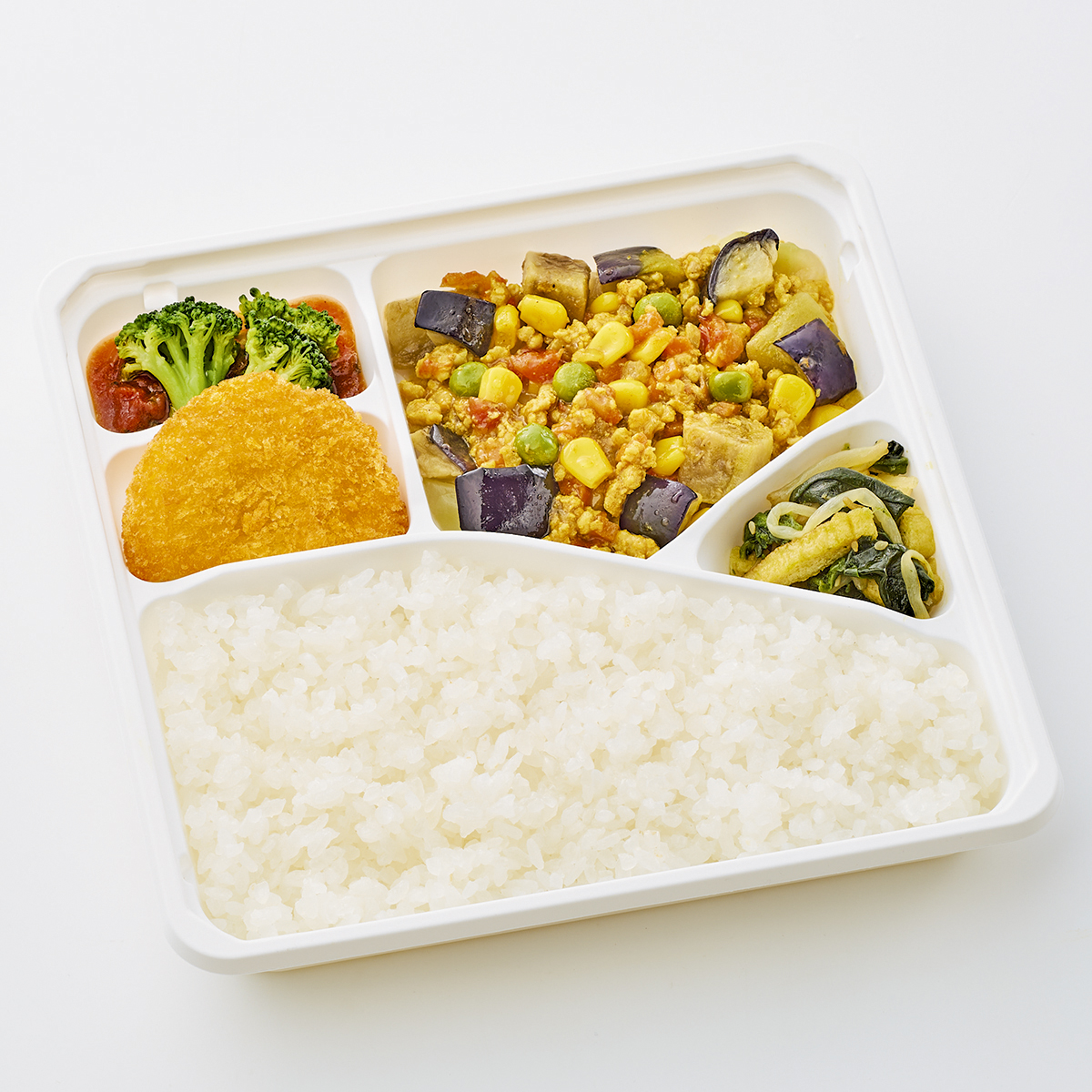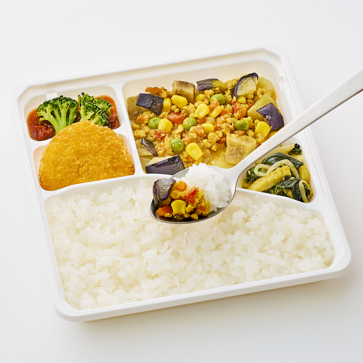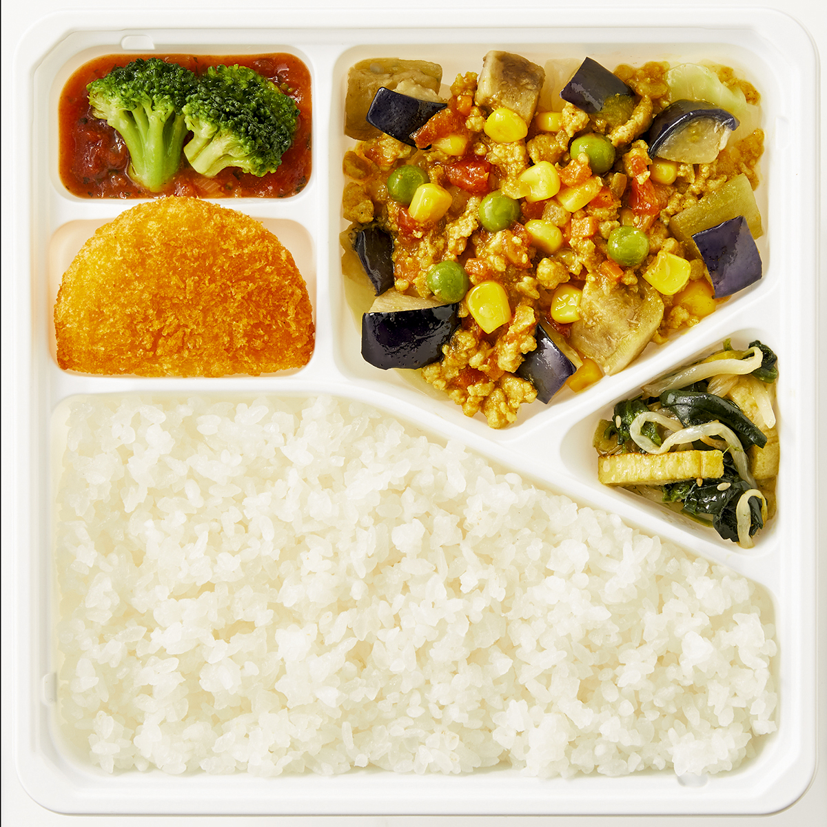 | 原材料名 | 加工米、じゃがいもコロッケ、揚げなす、トマト加工品、キャベツ、豚挽肉、植物油、ほうれん草、緑豆もやし、ブロッコリー、玉ねぎ、コーン、グリーンピース、人参、油揚げ、コンソメ、おろしにんにく、ねぎ、カレー粉、醤油、砂糖、かつお節調味料、ごま、パセリ/糊料(グァー分解物、グァー)、加工デンプン、調味料(アミノ酸等)、pH調整剤、着色料(カラメル、カロチノイド)、酸味料、乳化剤、(一部に小麦・乳成分・牛肉・ごま・大豆・鶏肉・豚肉を含む) | ||