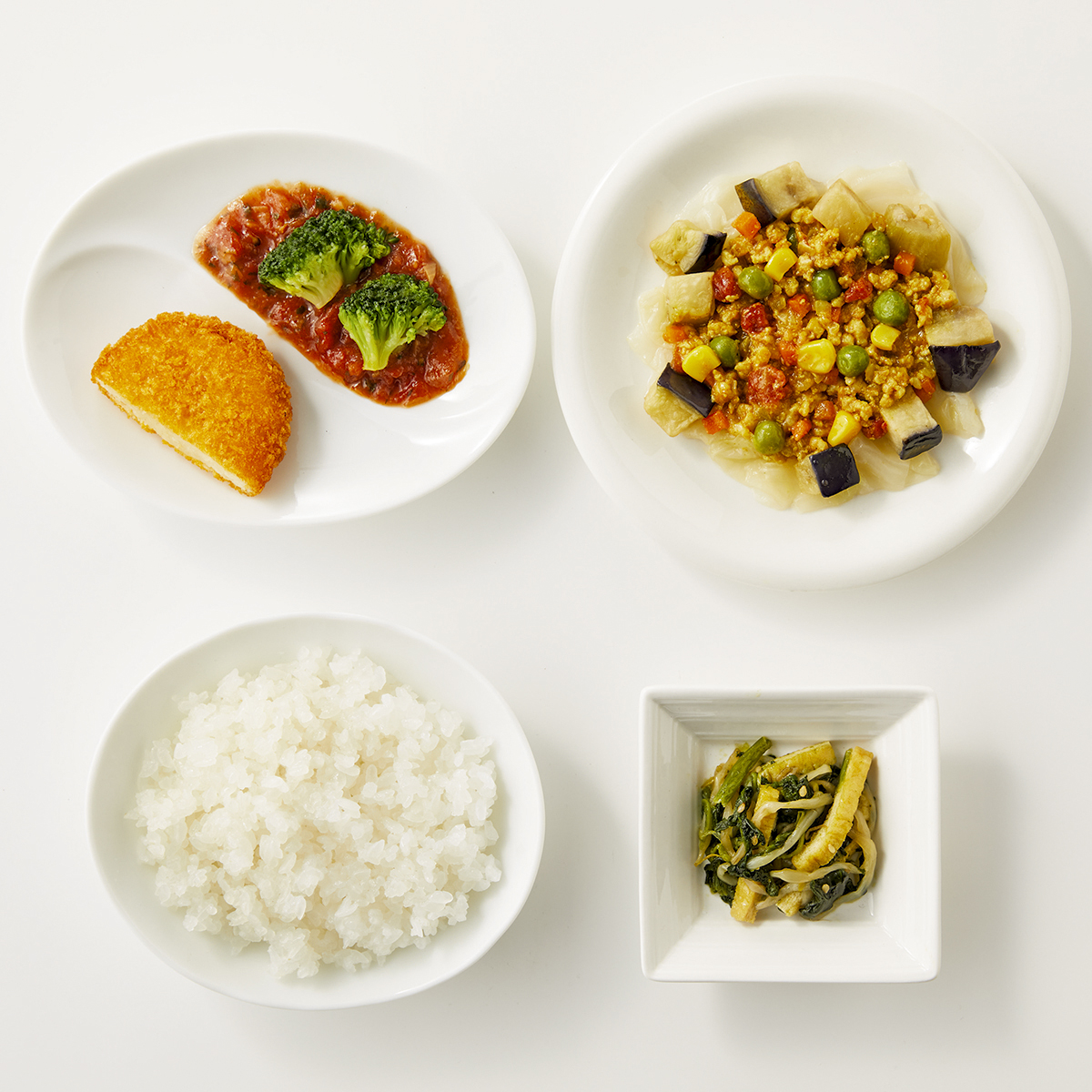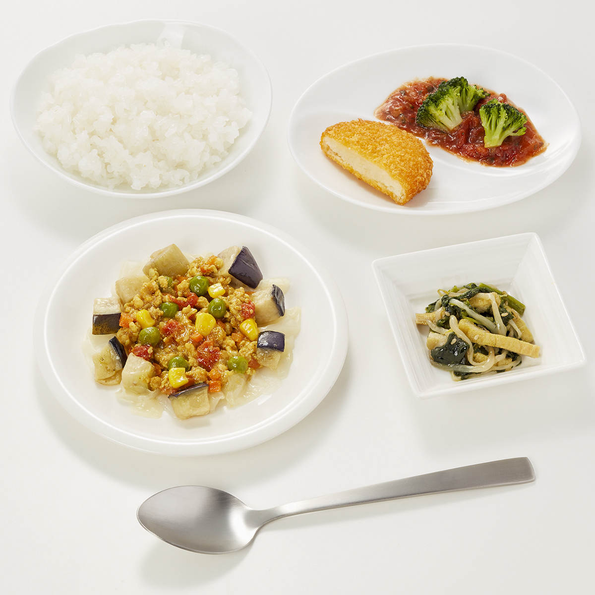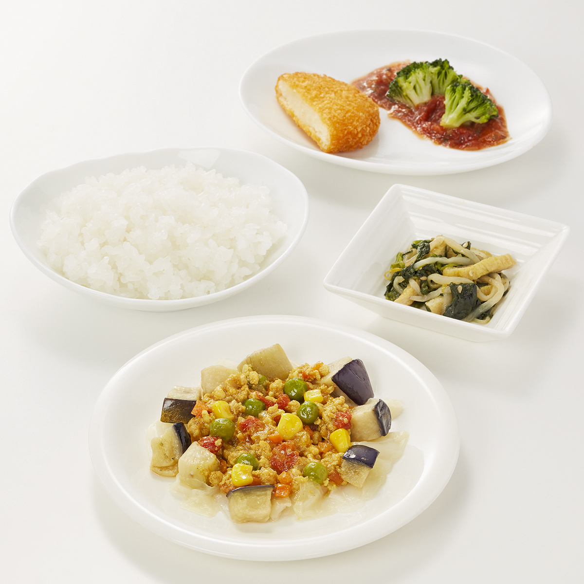 | 原材料名 | 加工米、じゃがいもコロッケ、揚げなす、トマト加工品、キャベツ、豚挽肉、植物油、ほうれん草、緑豆もやし、ブロッコリー、玉ねぎ、コーン、グリーンピース、人参、油揚げ、コンソメ、おろしにんにく、ねぎ、カレー粉、醤油、砂糖、かつお節調味料、ごま、パセリ/糊料(グァー分解物、グァー)、加工デンプン、調味料(アミノ酸等)、pH調整剤、着色料(カラメル、カロチノイド)、酸味料、乳化剤、(一部に小麦・乳成分・牛肉・ごま・大豆・鶏肉・豚肉を含む) | ||