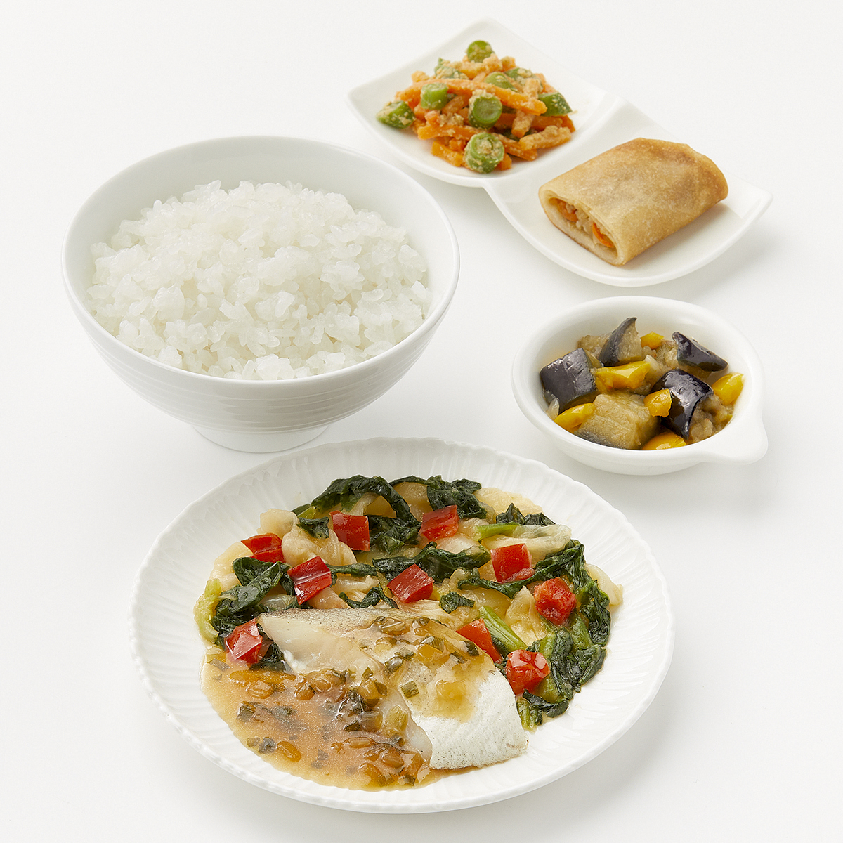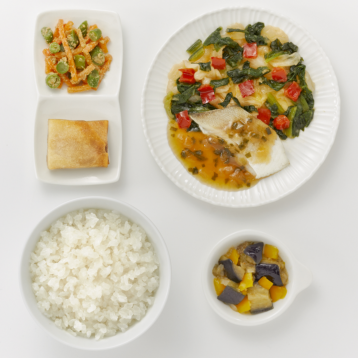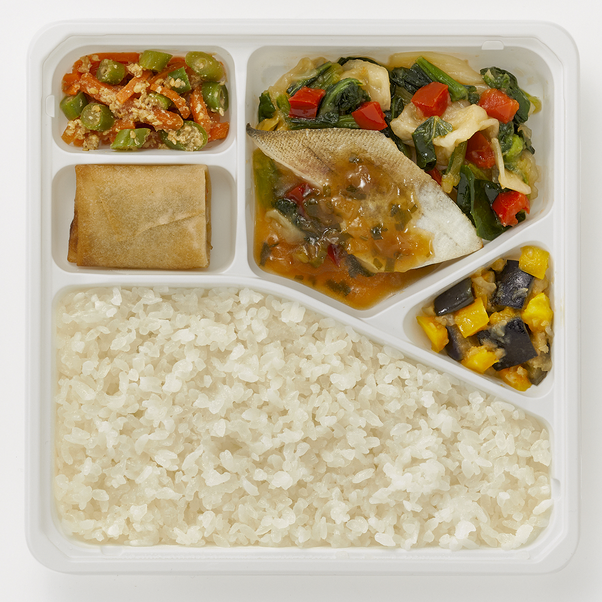 | 原材料名 | 加工米、助宗たら、キャベツ、春巻(キャベツ、小麦粉、人参、その他)、植物油、玉ねぎ、揚げなす、小松菜、赤ピーマン、人参、黄ピーマン、ポン酢醤油、いんげん、清酒風調味料、ねぎ、砂糖、みりん、ごま、醤油、かつお節調味料、ごま油、おろししょうが、食塩、ゼラチン、鶏がら調味料、白だし、トウバンジャン/加工デンプン、安定剤(グァー分解物)、調味料(アミノ酸等)、酸味料、pH調整剤、香料、酒精、酸化防止剤(V.C)、(一部に小麦・ごま・大豆・鶏肉・ゼラチンを含む) | ||