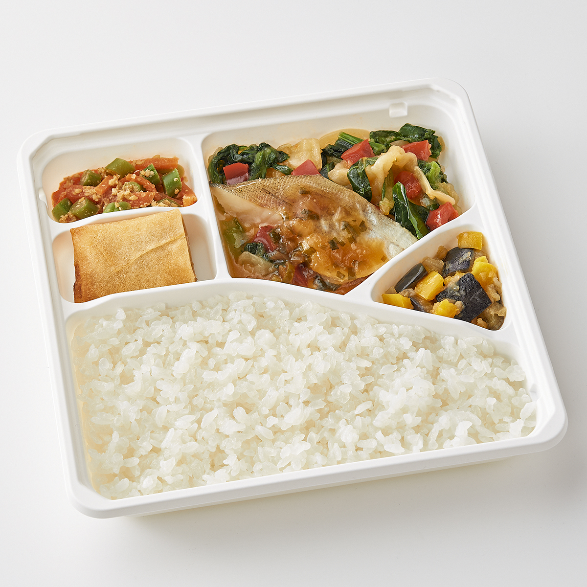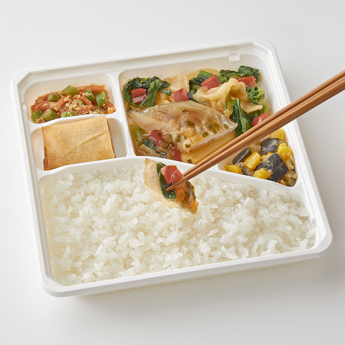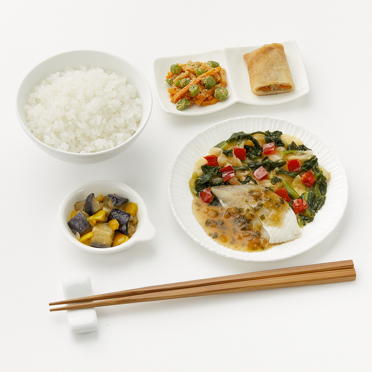 | 原材料名 | 加工米、助宗たら、キャベツ、春巻(キャベツ、小麦粉、人参、その他)、植物油、玉ねぎ、揚げなす、小松菜、赤ピーマン、人参、黄ピーマン、ポン酢醤油、いんげん、清酒風調味料、ねぎ、砂糖、みりん、ごま、醤油、かつお節調味料、ごま油、おろししょうが、食塩、ゼラチン、鶏がら調味料、白だし、トウバンジャン/加工デンプン、安定剤(グァー分解物)、調味料(アミノ酸等)、酸味料、pH調整剤、香料、酒精、酸化防止剤(V.C)、(一部に小麦・ごま・大豆・鶏肉・ゼラチンを含む) | ||