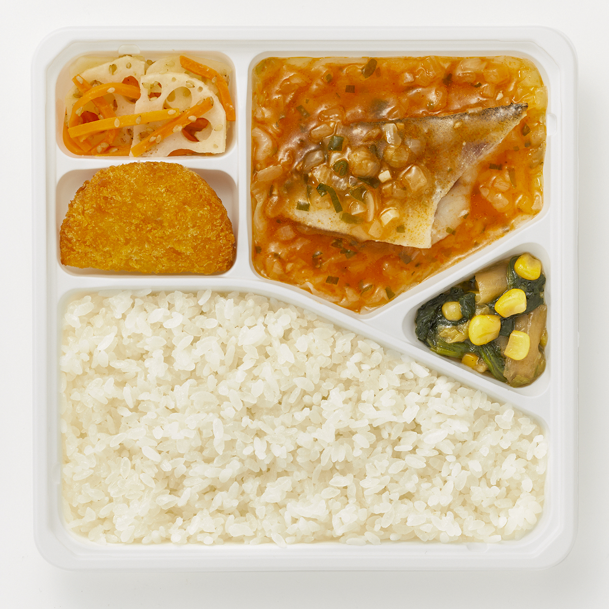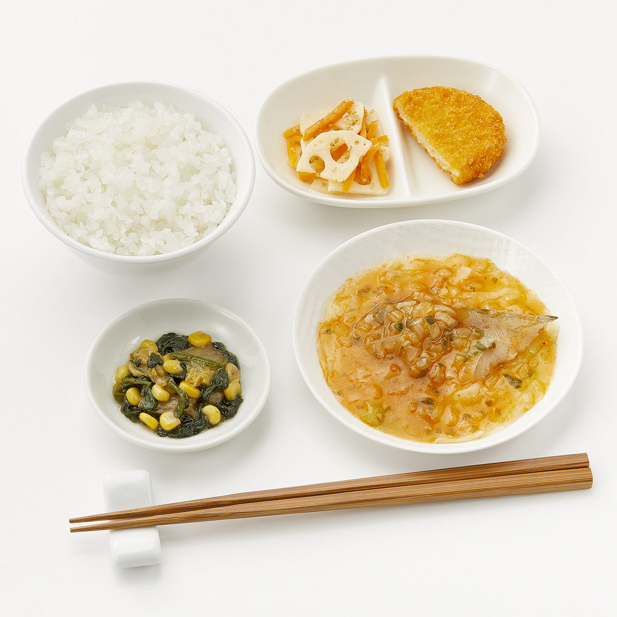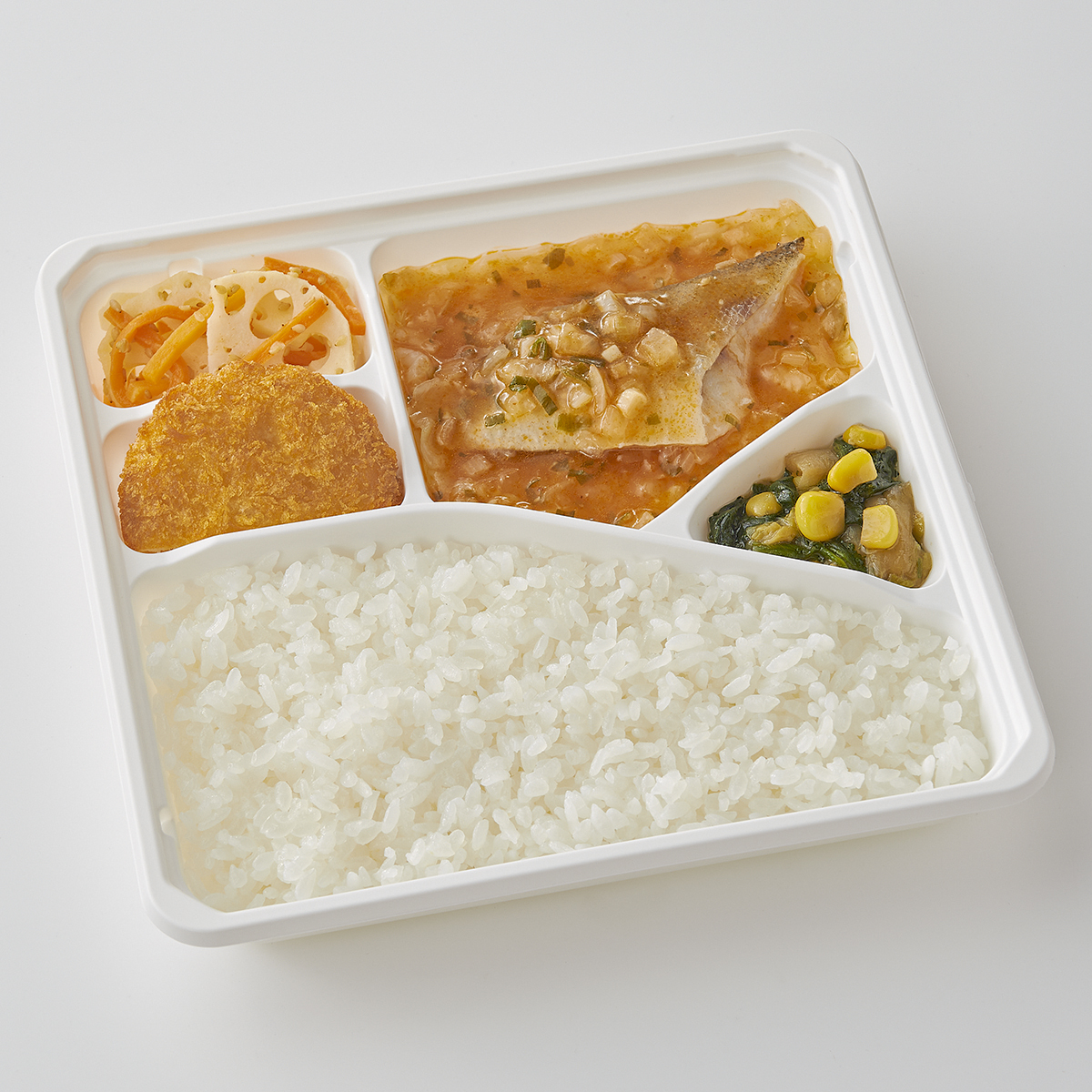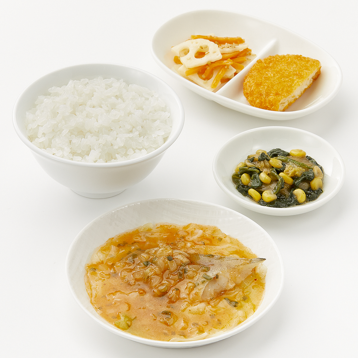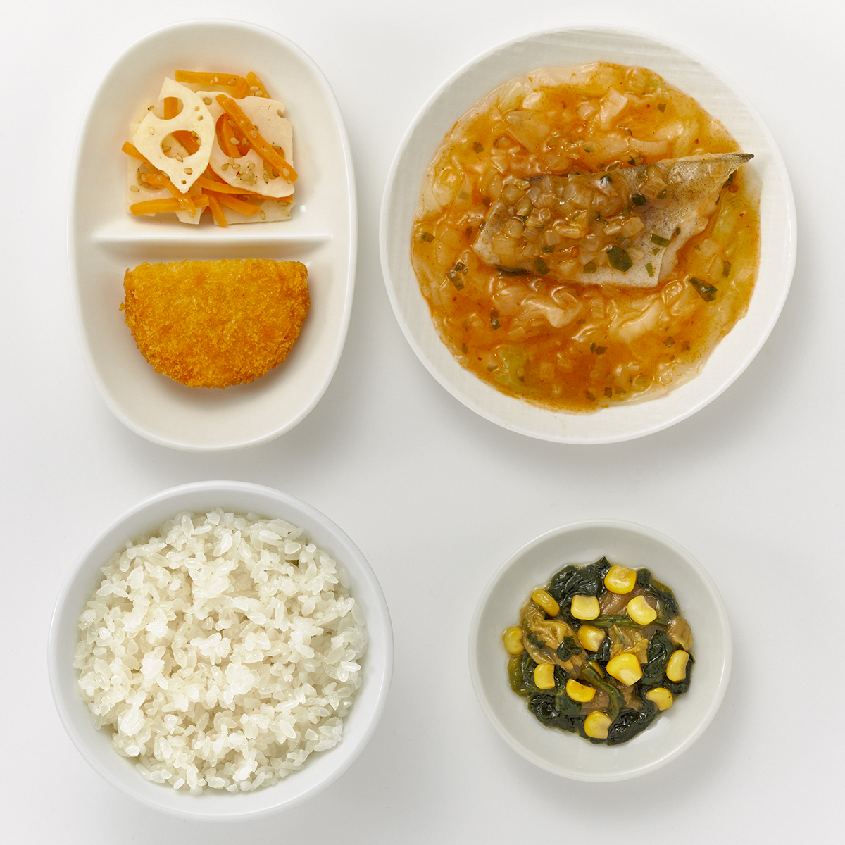 | 原材料名 | 加工米、助宗たら、キャベツ、ポテトコロッケ、植物油、白菜、れんこん水煮、ほうれん草、チリソース、玉ねぎ、人参、コーン、ねぎ、清酒風調味料、ごま油、オイスターソース、ケチャップ、鶏がら調味料、醤油、ごま、にんにく加工品、食塩、刻みしょうが/糊料(グァー分解物、加工デンプン、増粘多糖類)、加工デンプン、調味料(アミノ酸等)、pH調整剤、酸化防止剤(V.C)、メタリン酸Na、カロチノイド色素、酸味料、漂白剤(次亜硫酸Na)、ミョウバン、乳化剤、(一部に小麦・乳成分・ごま・大豆・鶏肉・りんごを含む) | ||