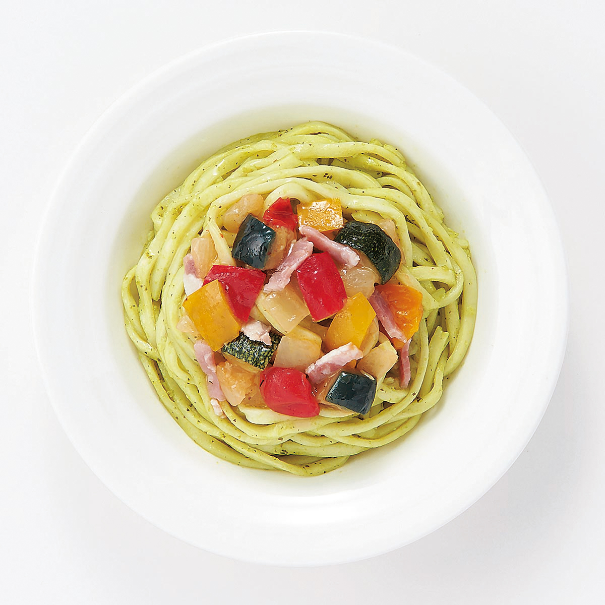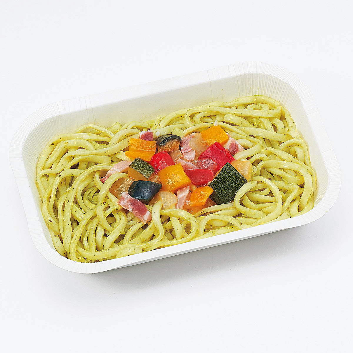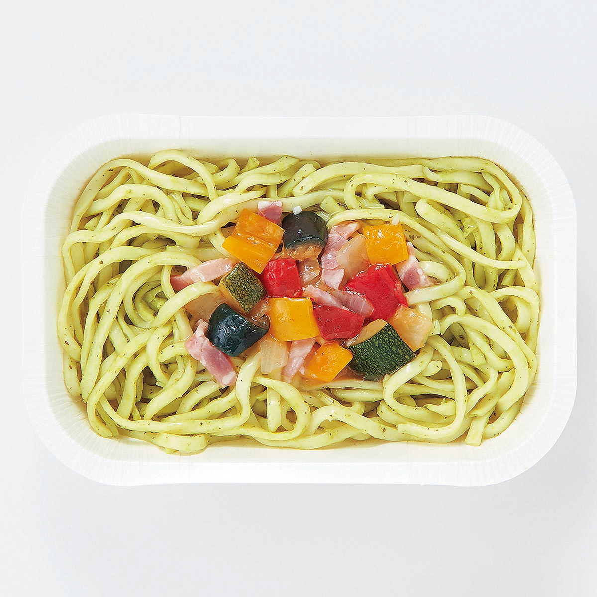 | 原材料名 | めん(小麦粉(国内製造)、でん粉、粉末卵白、粉末卵黄、食塩/増粘剤(加工でん粉)、着色料(クチナシ))、加熱済野菜ミックス(ズッキーニ、なす、赤パプリカ、黄パプリカ、バーム油、食塩)、なたね油、野菜(玉ねぎ、にんにく)、バジルソース、ベーコン、ほうれん草ピューレー、食用油脂、顆粒洋風だし、チーズ、食塩、ゼラチン、こしょう/増粘剤(加工でん粉)、乳化剤、調味料(アミノ酸)、リン酸塩(Na)、香辛料、酸味料、酸化防止剤(V.C)、発色剤(亜硝酸Na)、着色料(カルミン酸)、(一部に小麦・卵・乳成分・大豆・鶏肉・豚肉・ゼラチンを含む) | ||