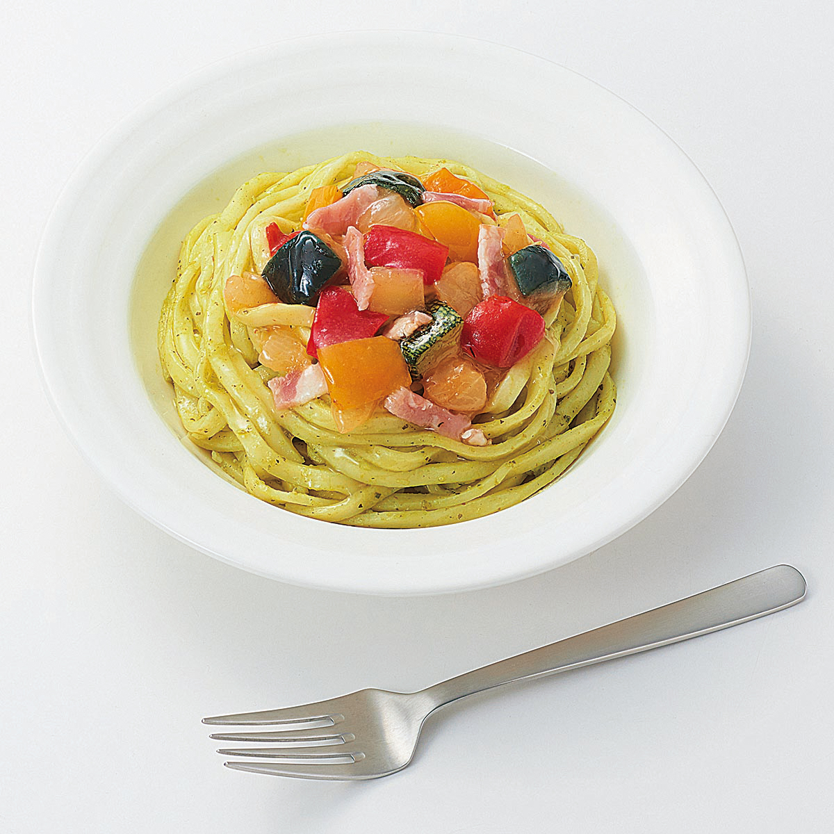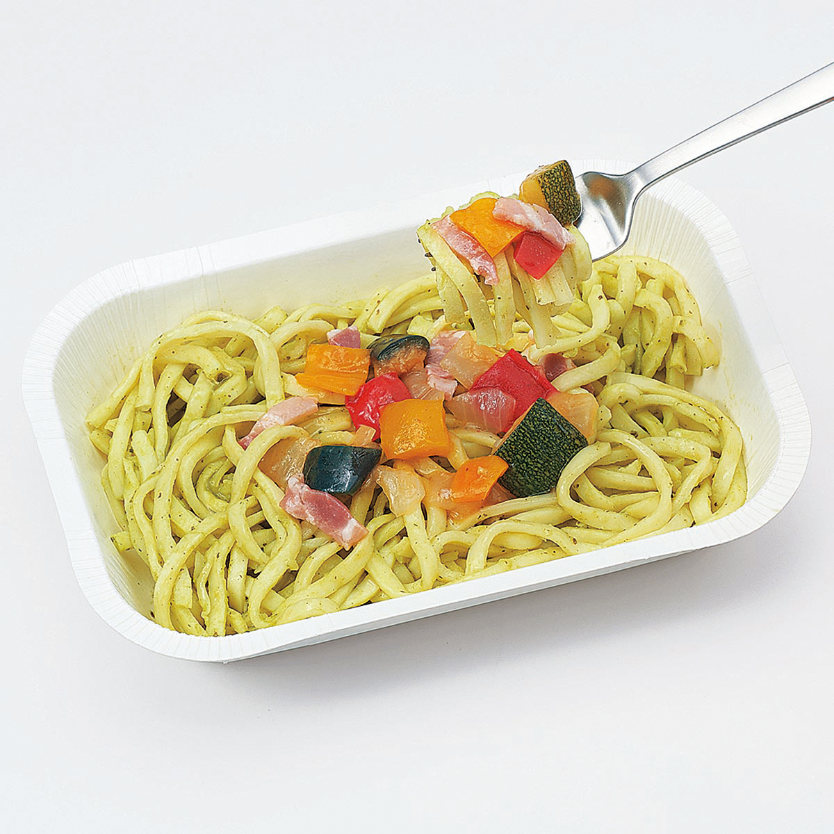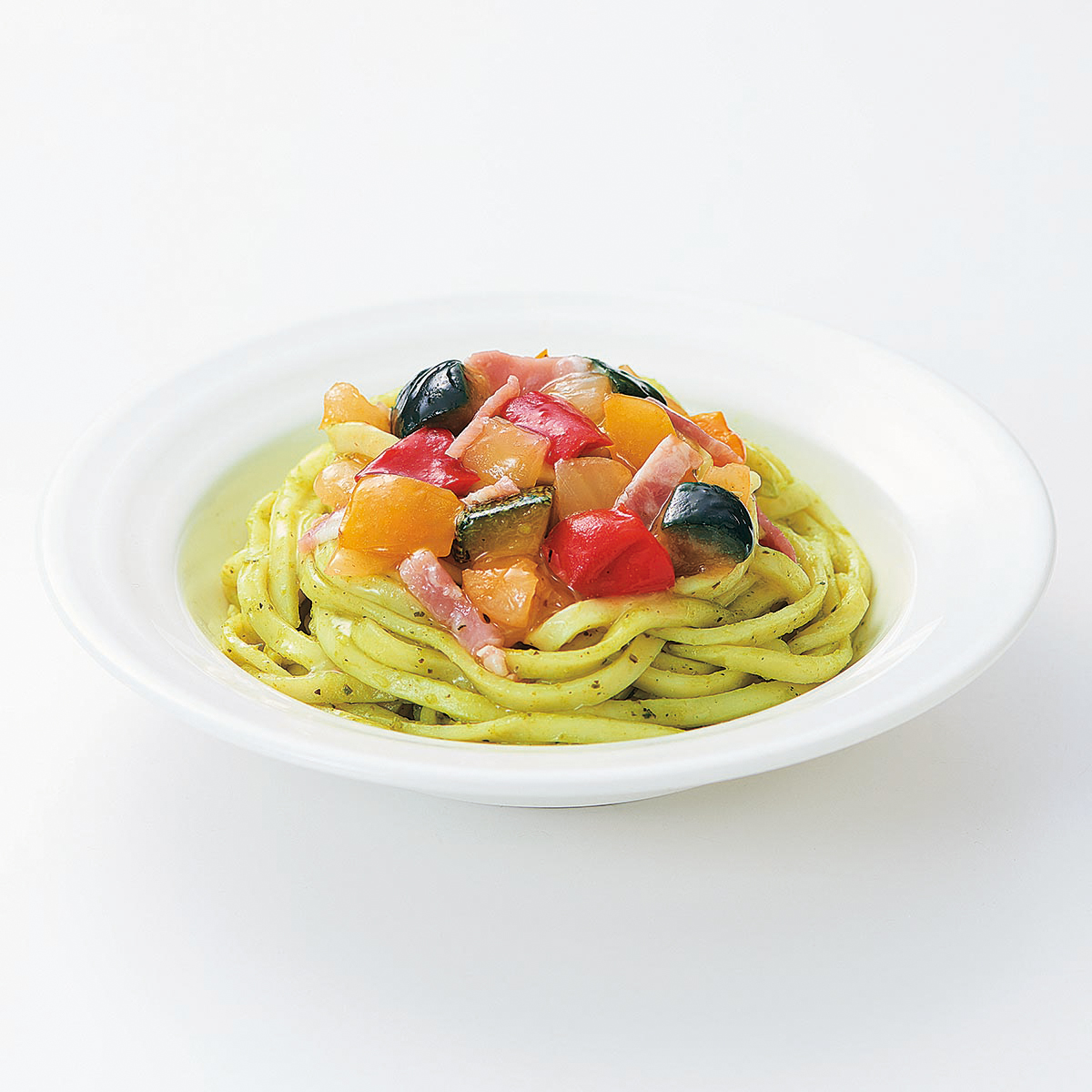 | 原材料名 | めん(小麦粉(国内製造)、でん粉、粉末卵白、粉末卵黄、食塩/増粘剤(加工でん粉)、着色料(クチナシ))、加熱済野菜ミックス(ズッキーニ、なす、赤パプリカ、黄パプリカ、バーム油、食塩)、なたね油、野菜(玉ねぎ、にんにく)、バジルソース、ベーコン、ほうれん草ピューレー、食用油脂、顆粒洋風だし、チーズ、食塩、ゼラチン、こしょう/増粘剤(加工でん粉)、乳化剤、調味料(アミノ酸)、リン酸塩(Na)、香辛料、酸味料、酸化防止剤(V.C)、発色剤(亜硝酸Na)、着色料(カルミン酸)、(一部に小麦・卵・乳成分・大豆・鶏肉・豚肉・ゼラチンを含む) | ||