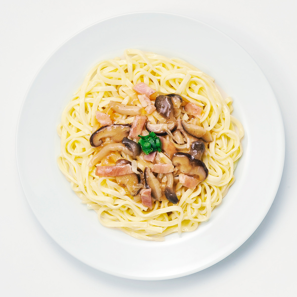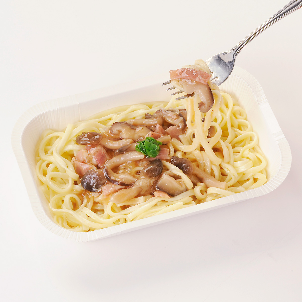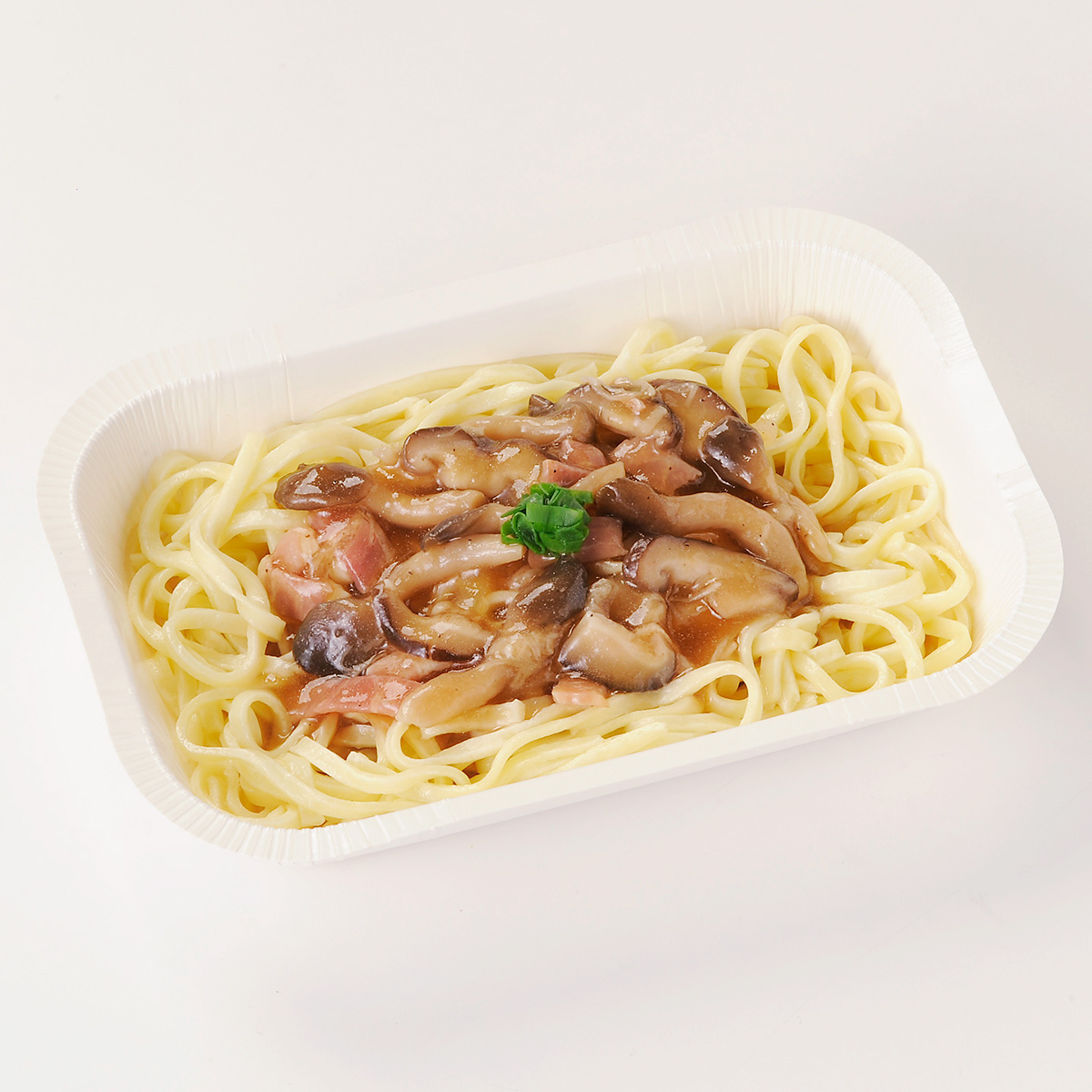 | 原材料名 | めん[小麦粉、でん粉、粉末卵白、粉末卵黄、食塩/増粘剤(加工デンプン)、カロチノイド色素]、 野菜(ひらたけ、しいたけ、えのきたけ、玉ねぎ、ねぎ、にんにく)、なたね油、ベーコン、和風調味液[醤油、糖類(砂糖、果糖ぶどう糖液糖)、その他]、調理油、オリーブオイル、おろしにんにく、濃口醤油、ゼラチン、顆粒和風だし、黒こしょう、食塩/増粘剤(加工デンプン、カラギナン)、乳化剤、調味料(アミノ酸等)、リン酸塩(Na)、酸味料、酸化防止剤(V.C)、マンニット、発色剤(亜硝酸Na)、くん液、コチニール色素、香辛料、 (一部に小麦・卵・乳成分・さば・大豆・豚肉・ゼラチン・魚醤(魚介類)を含む) | ||