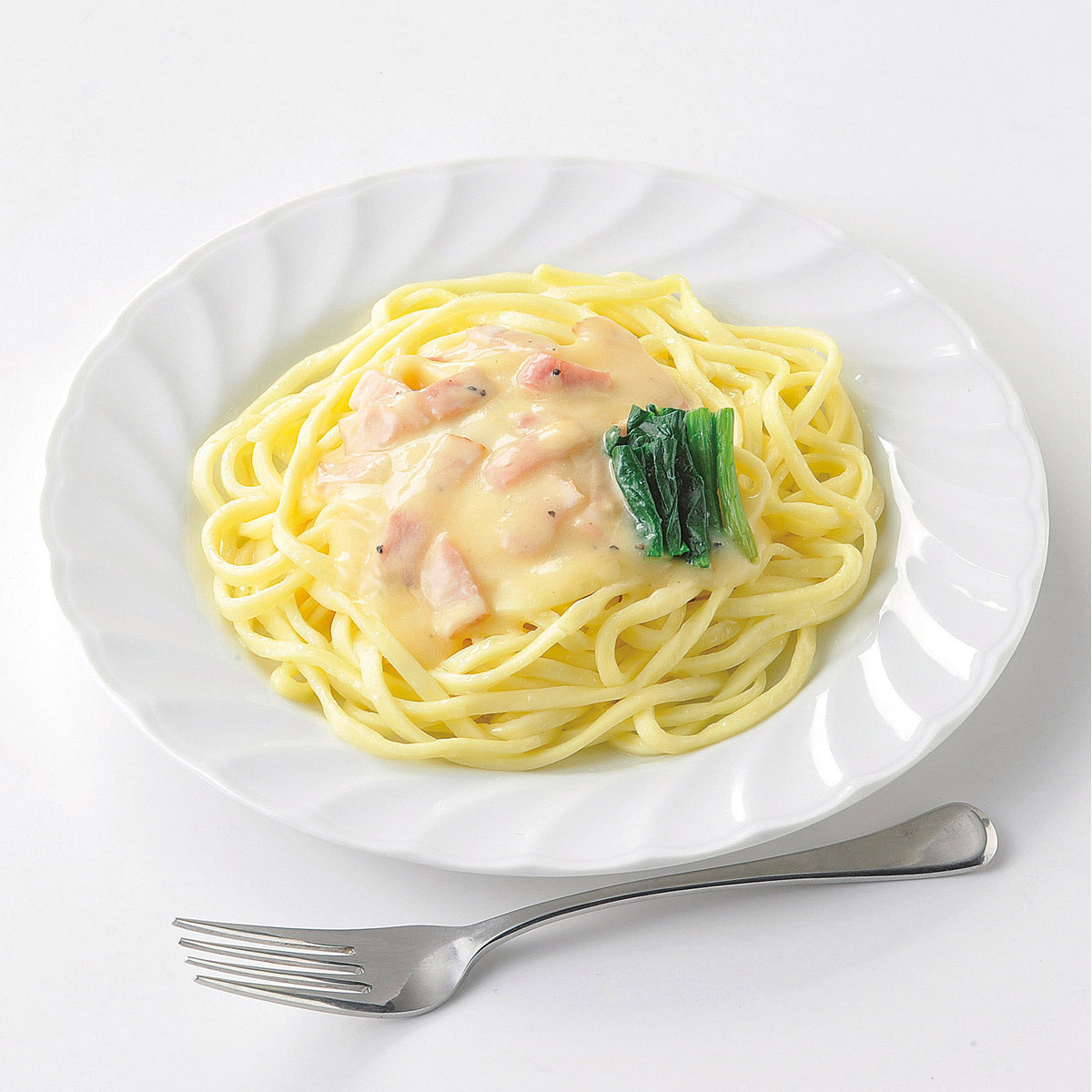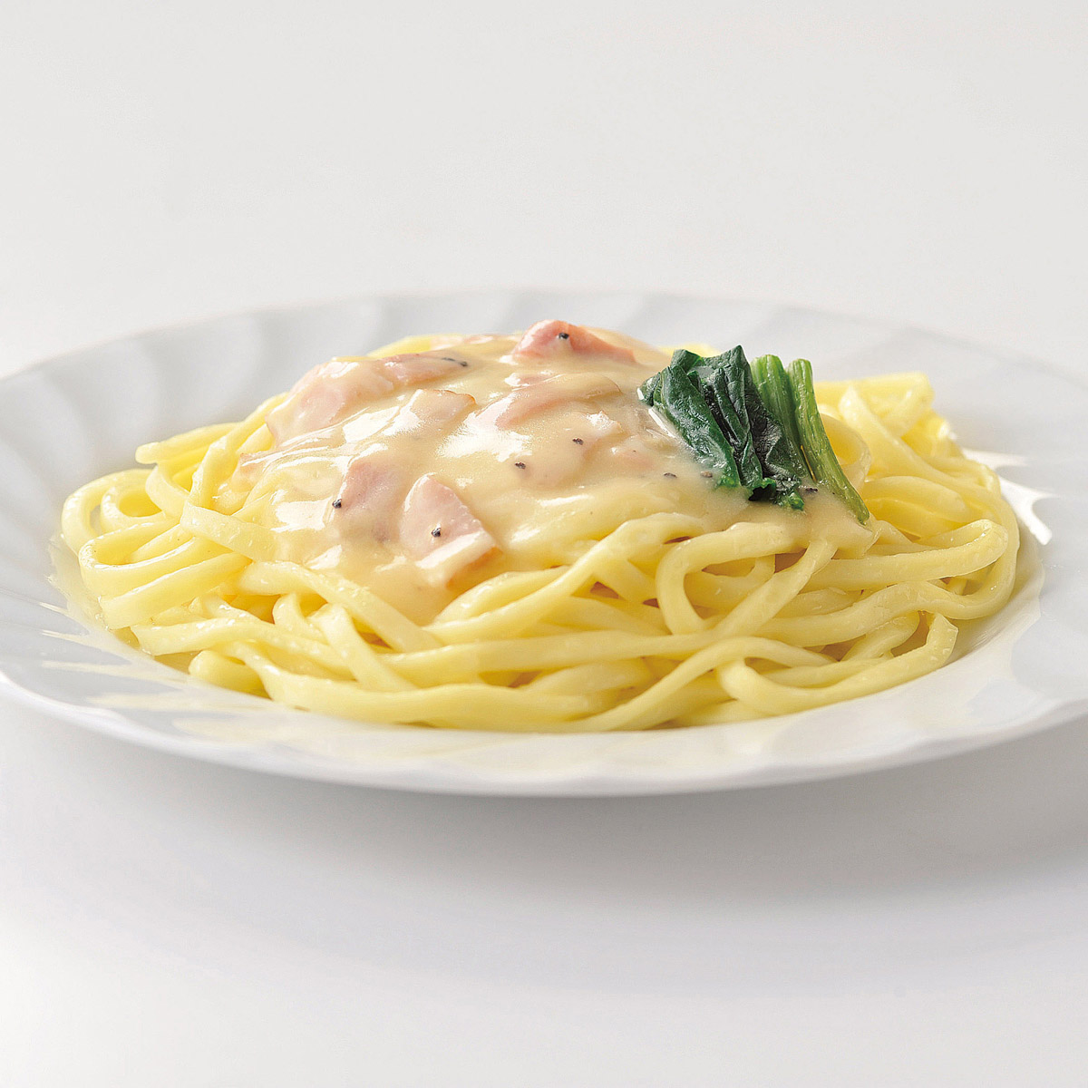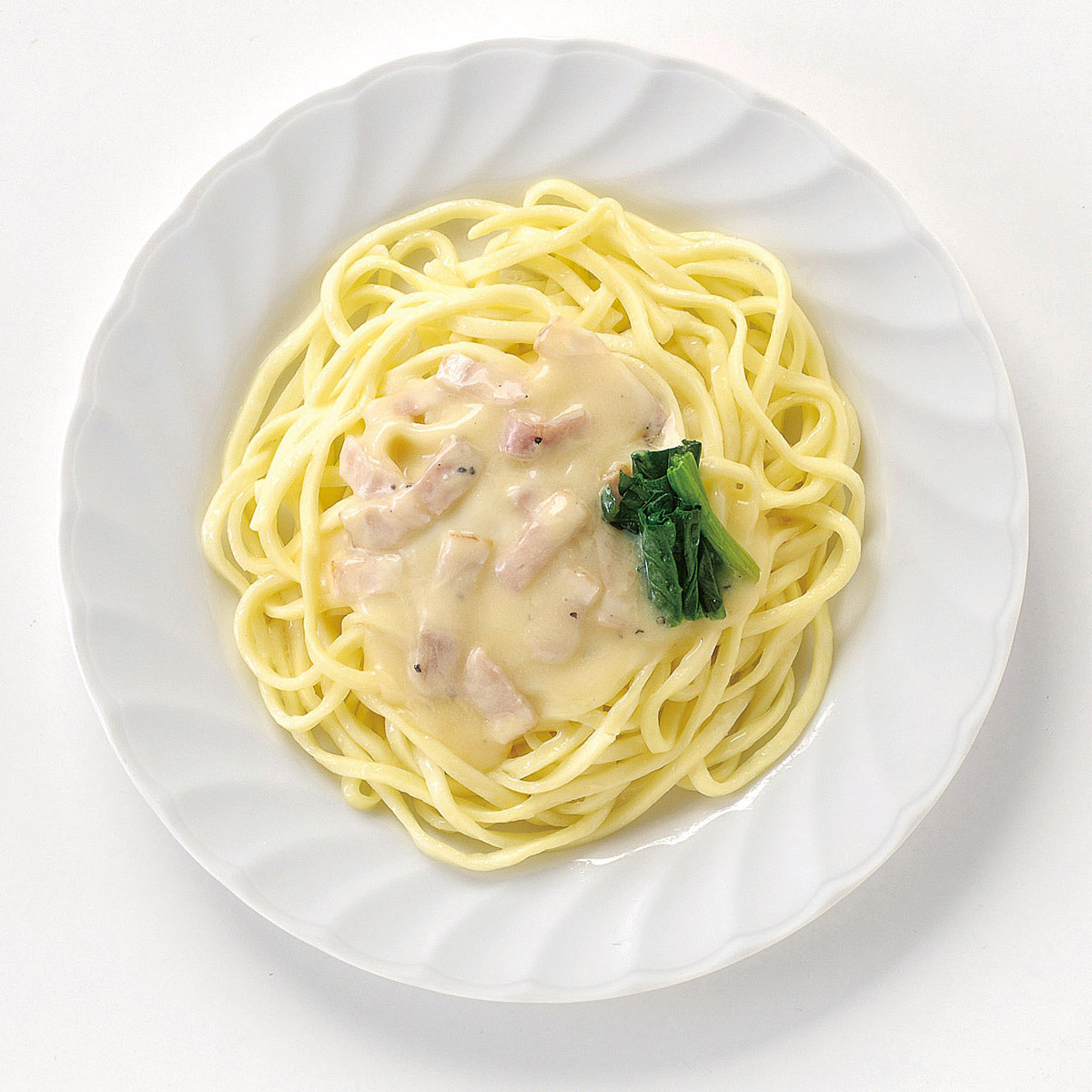 | 原材料名 | めん[小麦粉、でん粉、粉末卵白、粉末卵黄、食塩/増粘剤(加工デンプン)、クチナシ色素]、 牛乳、ほうれん草、乳等を主要原料とする食品、ベーコン、卵黄加工品(卵黄、還元水あめ、食塩)、なたね油、オリーブオイル、調理油、クリーム、顆粒洋風だし、ゼラチン、食塩、ナチュラルチーズ、おろしにんにく、黒こしょう/糊料(増粘多糖類)、乳化剤、調味料(アミノ酸等)、リン酸塩(Na)、カゼインNa、酸化防止剤(V.C)、pH調整剤、酸味料、香料、発色剤(亜硝酸Na)、くん液、着色料(コチニール、カラメル)、香辛料、 (一部に小麦・卵・乳成分・牛肉・大豆・鶏肉・豚肉・ゼラチンを含む) | ||