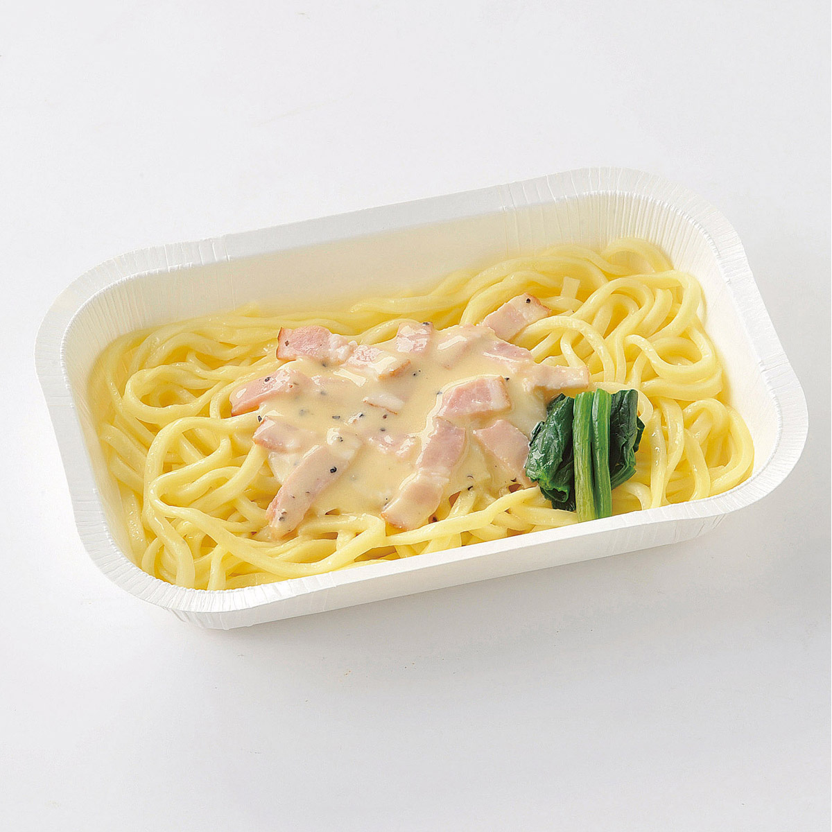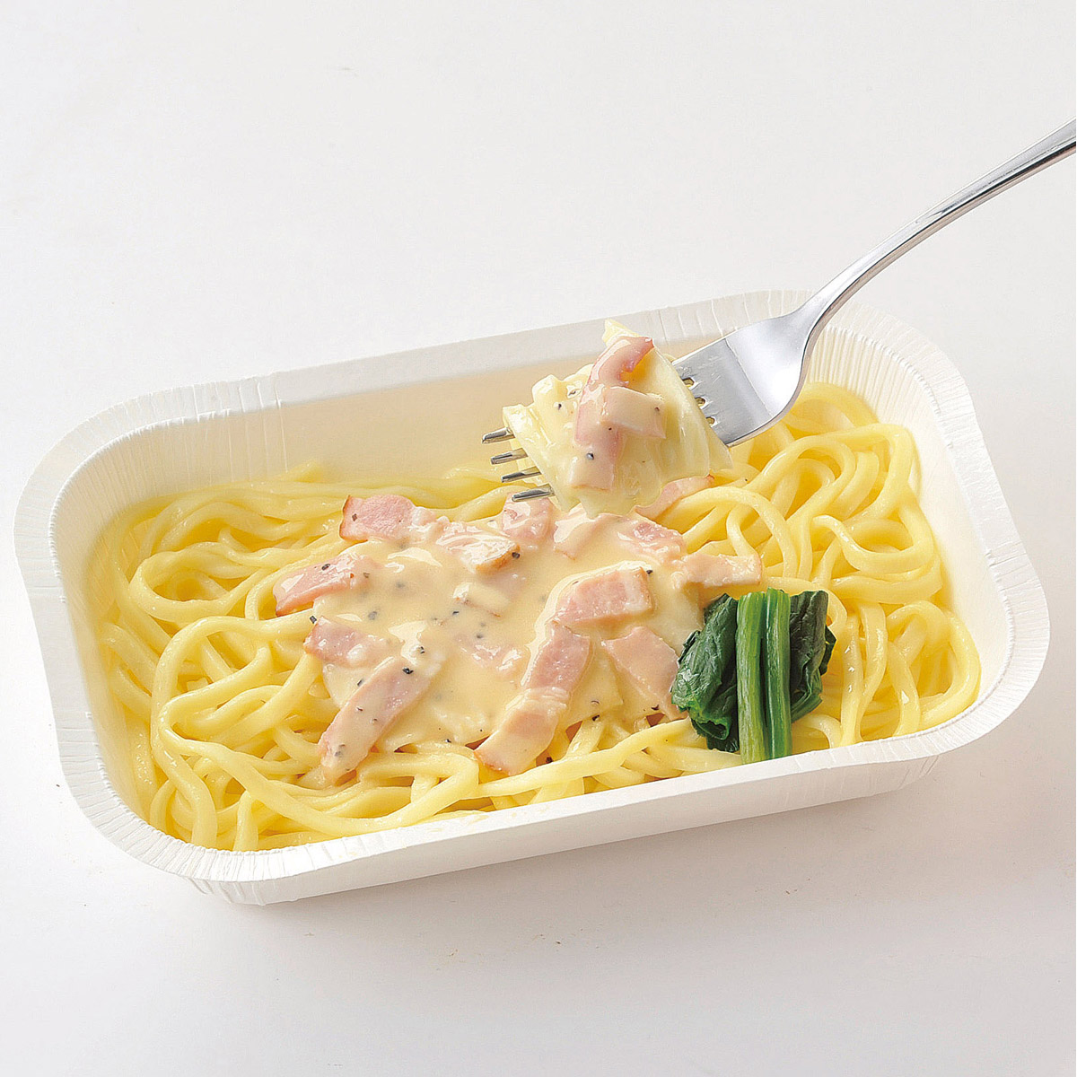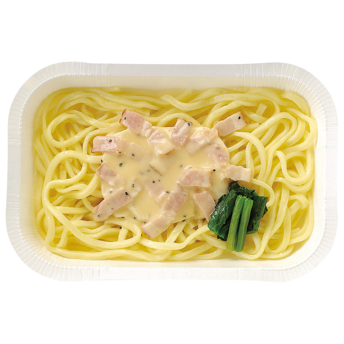 | 原材料名 | めん[小麦粉、でん粉、粉末卵白、粉末卵黄、食塩/増粘剤(加工デンプン)、クチナシ色素]、 牛乳、ほうれん草、乳等を主要原料とする食品、ベーコン、卵黄加工品(卵黄、還元水あめ、食塩)、なたね油、オリーブオイル、調理油、クリーム、顆粒洋風だし、ゼラチン、食塩、ナチュラルチーズ、おろしにんにく、黒こしょう/糊料(増粘多糖類)、乳化剤、調味料(アミノ酸等)、リン酸塩(Na)、カゼインNa、酸化防止剤(V.C)、pH調整剤、酸味料、香料、発色剤(亜硝酸Na)、くん液、着色料(コチニール、カラメル)、香辛料、 (一部に小麦・卵・乳成分・牛肉・大豆・鶏肉・豚肉・ゼラチンを含む) | ||