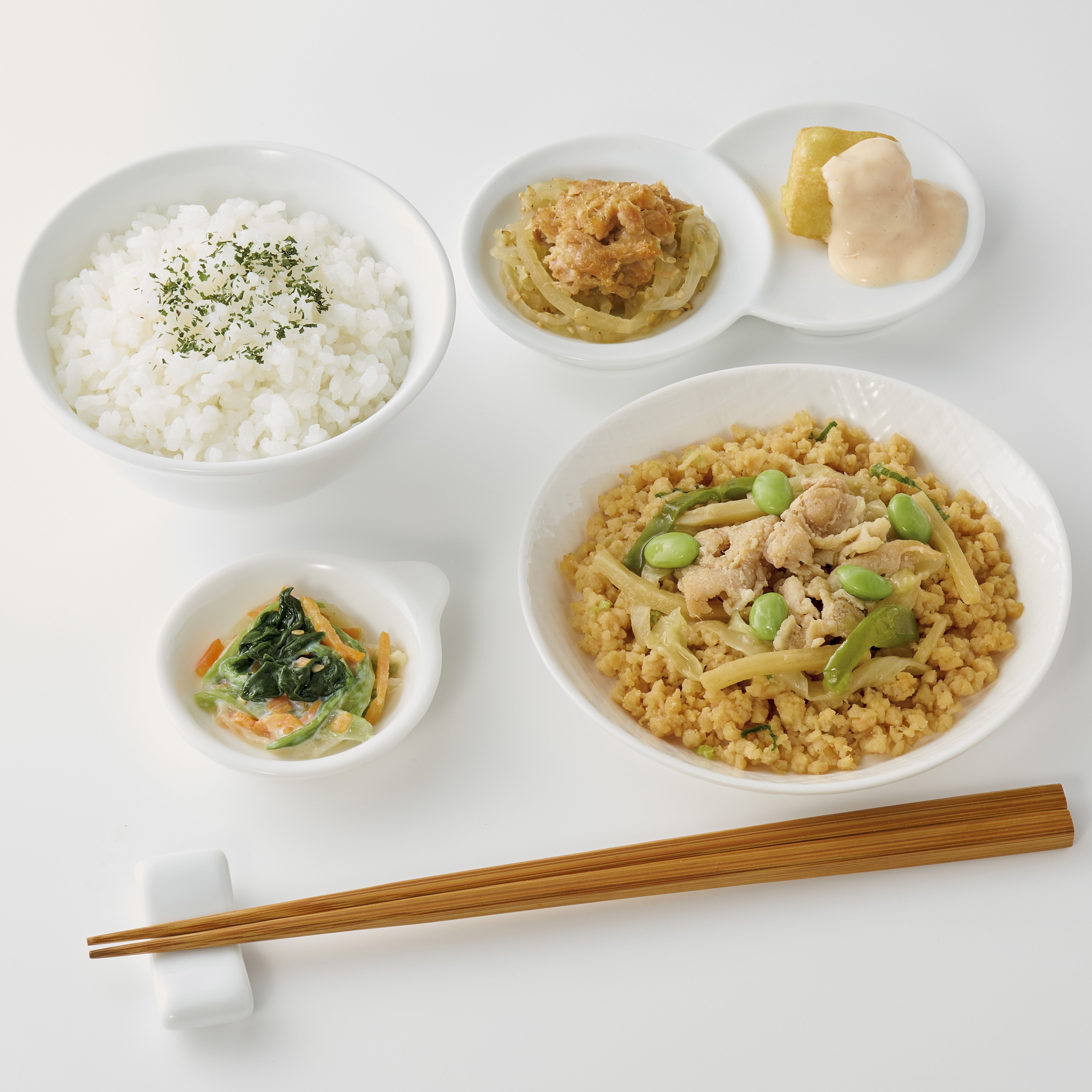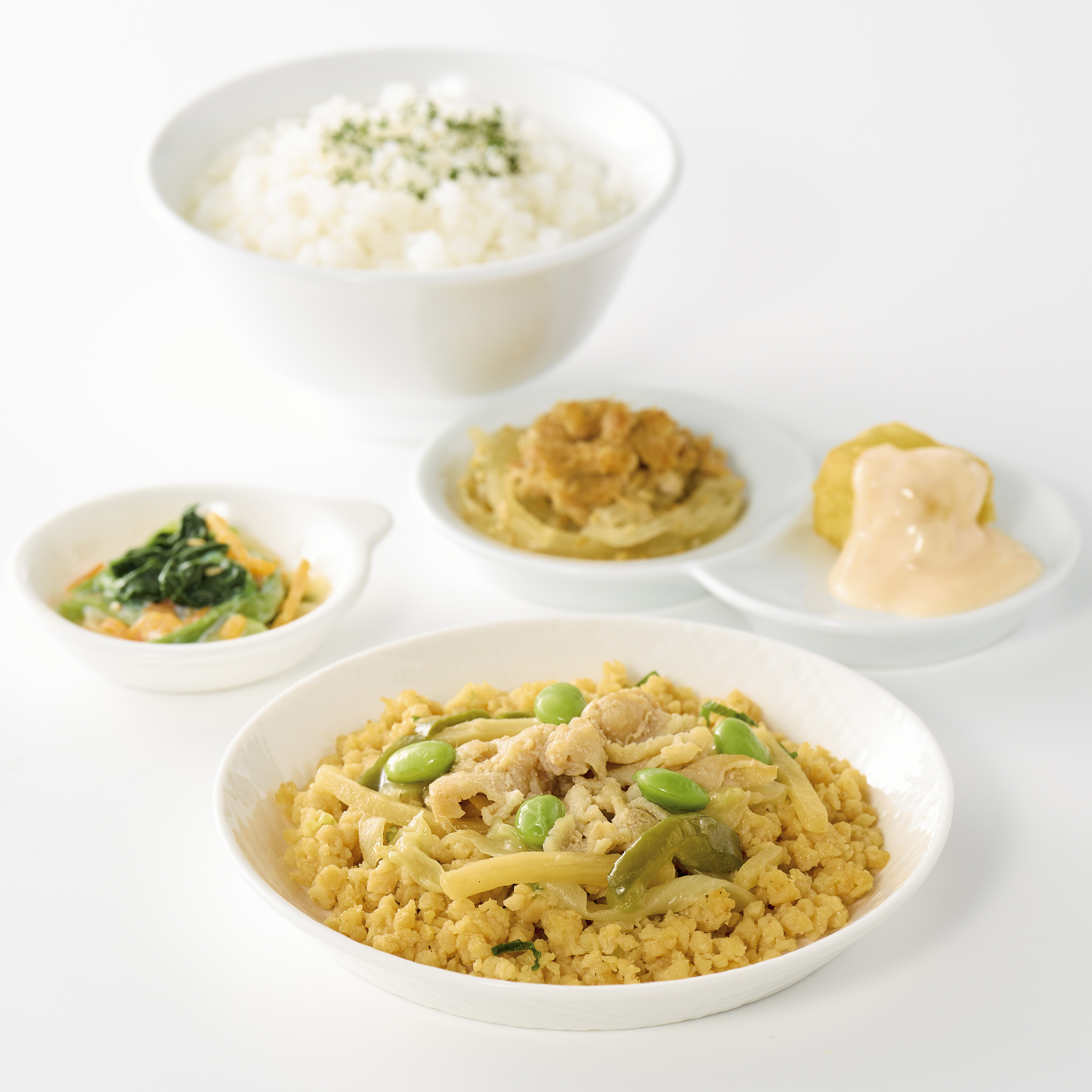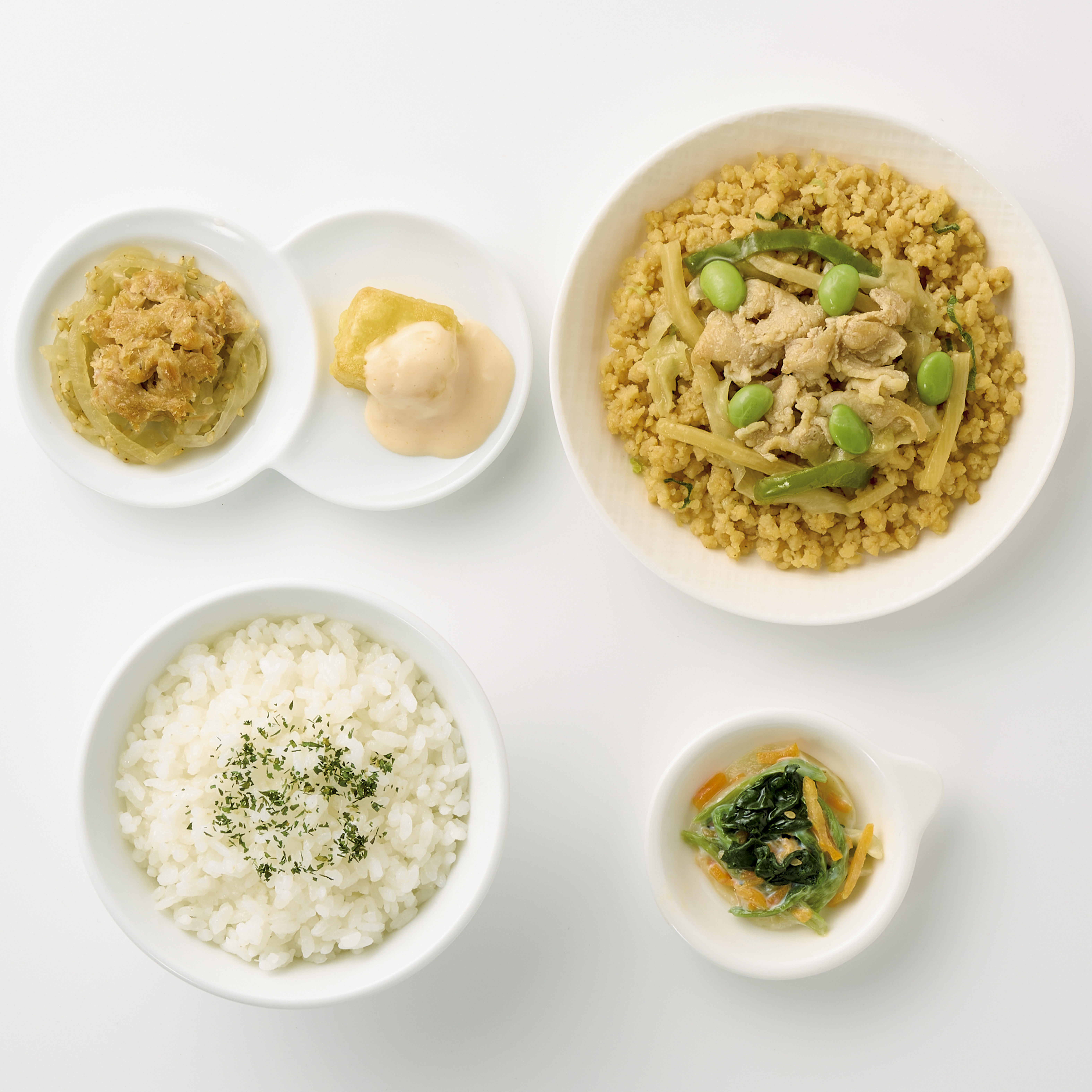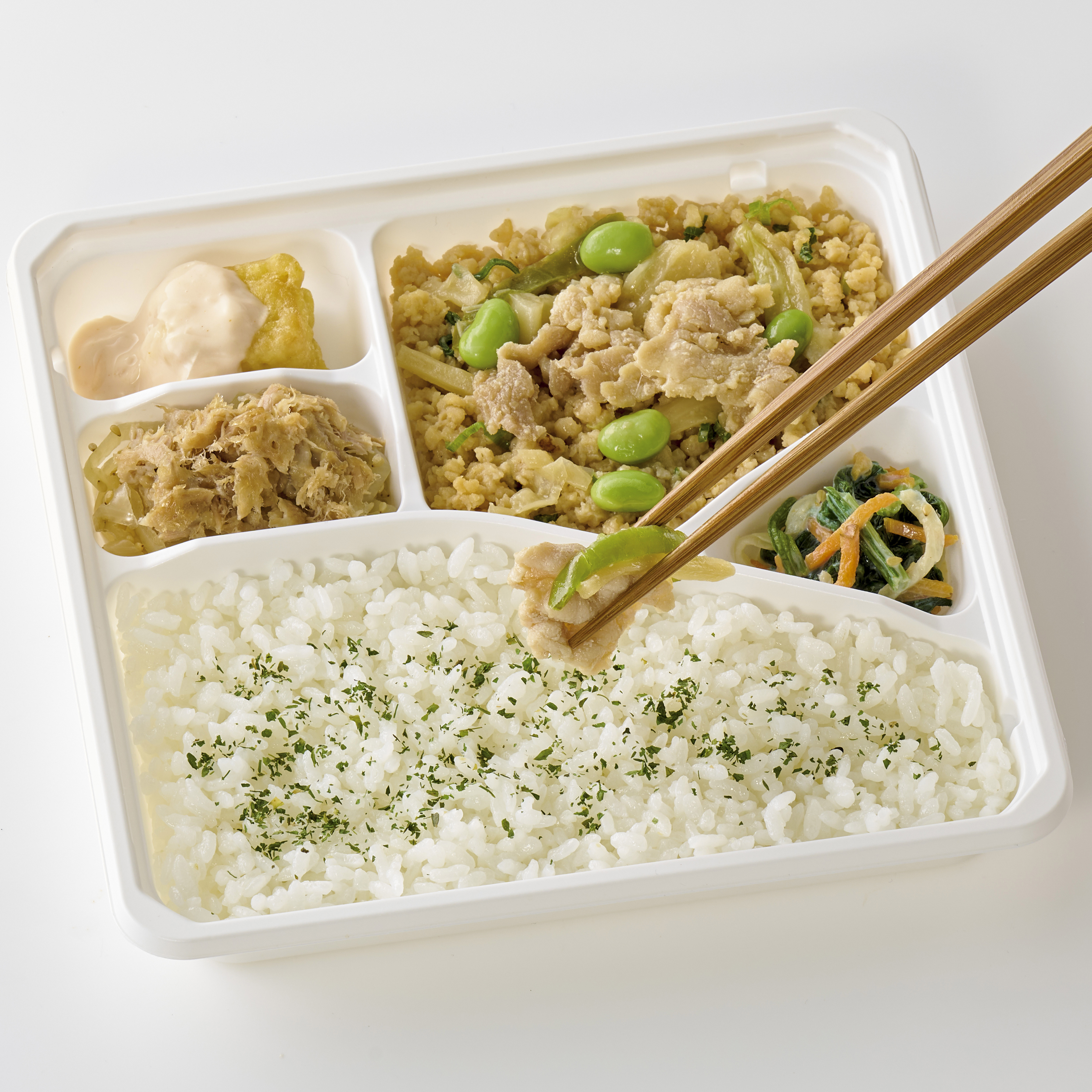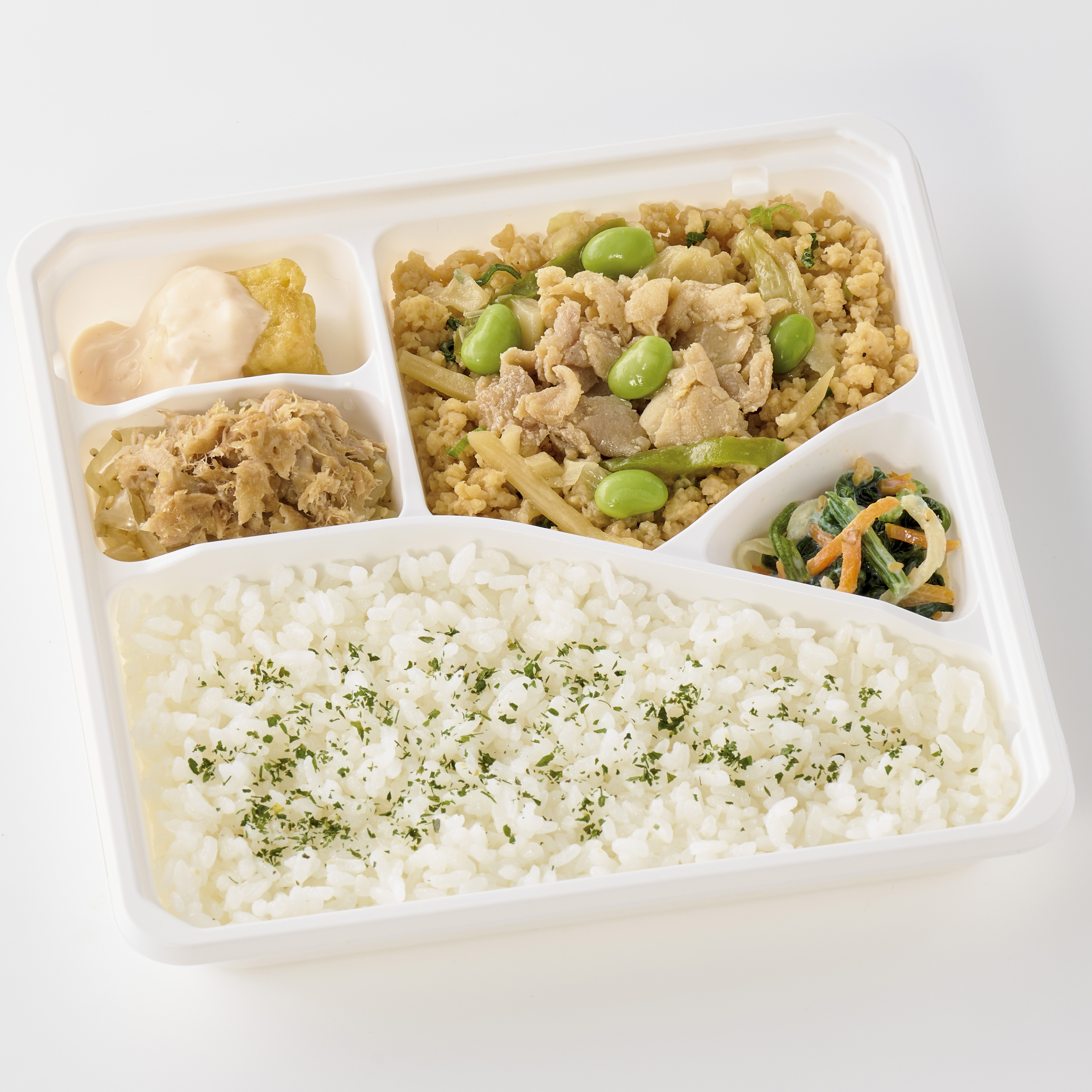 | 原材料名 | うるち米(国産)、豚肉(アメリカ産)、ツナフレーク、玉ねぎ、粒状植物性たん白、半固体状ドレッシング、人参、キャベツ、厚揚げ豆腐、ホエイたんぱく濃縮物、植物油、枝豆、醤油、ピーマン、発酵調味料、みりん風味調味料、乳清たん白濃縮物、乳化液状ドレッシング、ほうれん草、ねぎ、天ぷら粉、しょうが、にんにく、たけのこ、砂糖、加工酢、ごま、粉末調味料、オイスターソース、ケチャップ、ビタミン強化米、調合ごま油、パセリ/糊料(加工でん粉、増粘多糖類)、加工でん粉、調味料(アミノ酸等)、リン酸塩(Na)、凝固剤、膨張剤、酒精、pH調整剤、酸化防止剤(Ⅴ.C)、酸味料、乳化剤、香辛料、香料、着色料(カロチノイド)、(一部に小麦・卵・乳成分・牛肉・ごま・大豆・鶏肉・豚肉・りんご・ゼラチンを含む) | ||