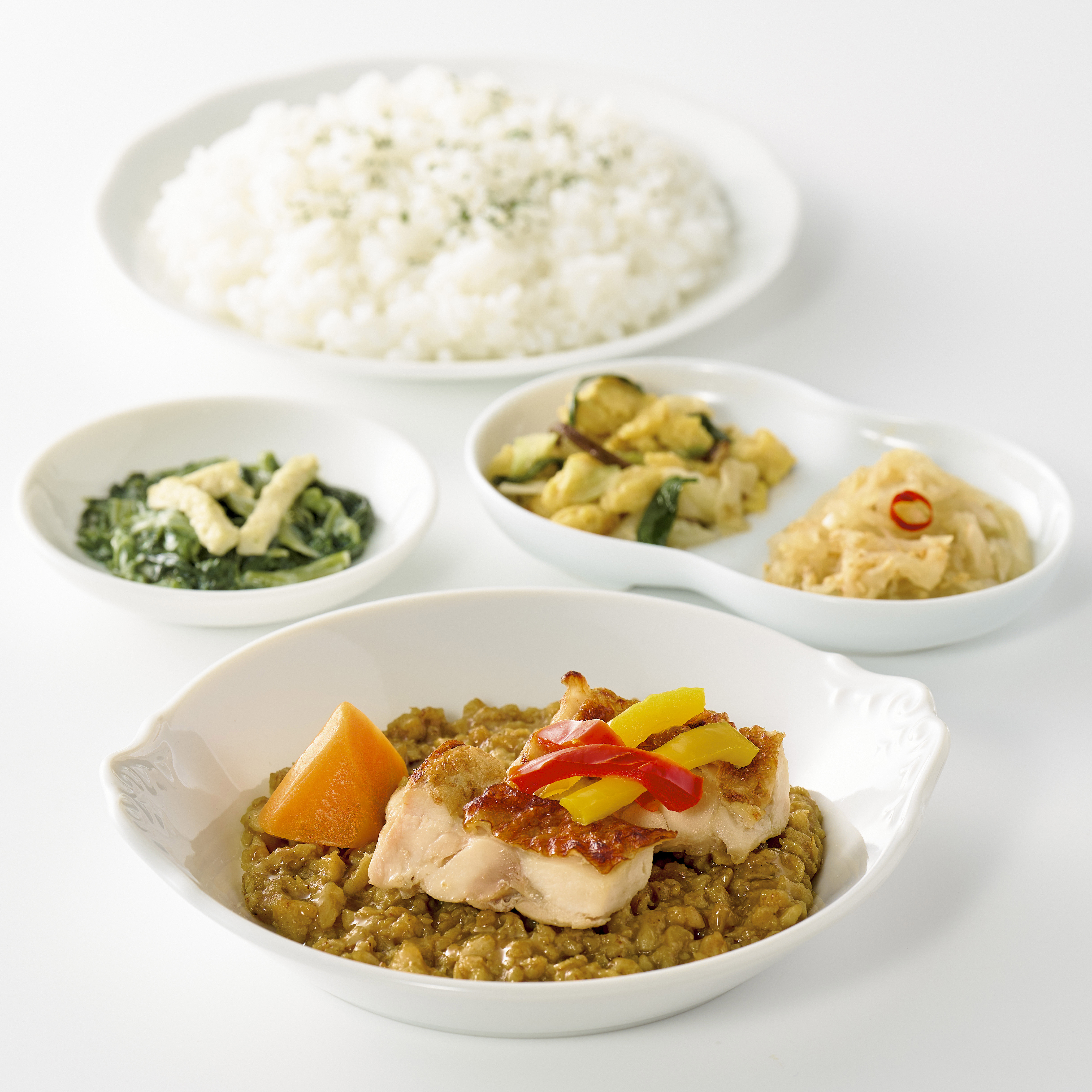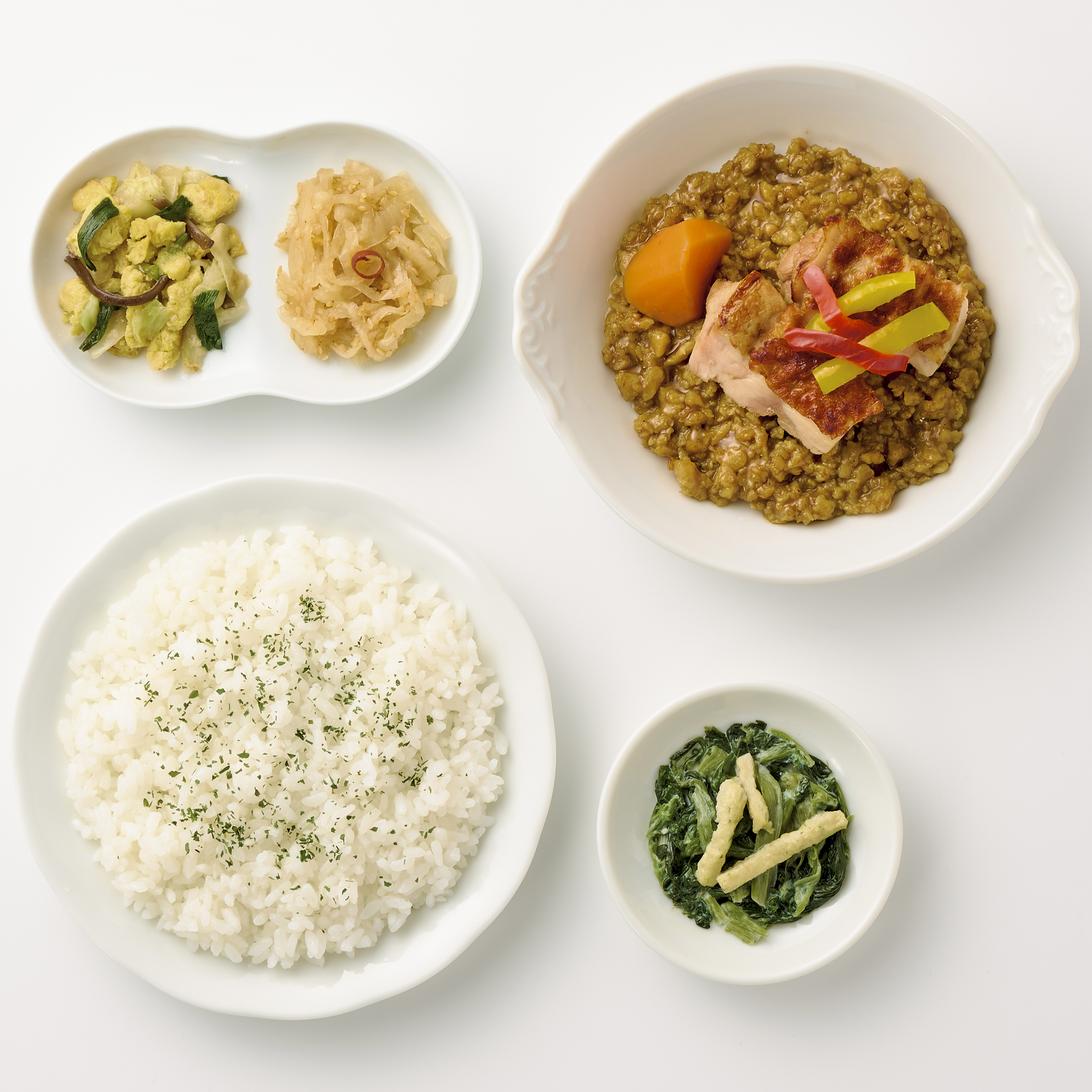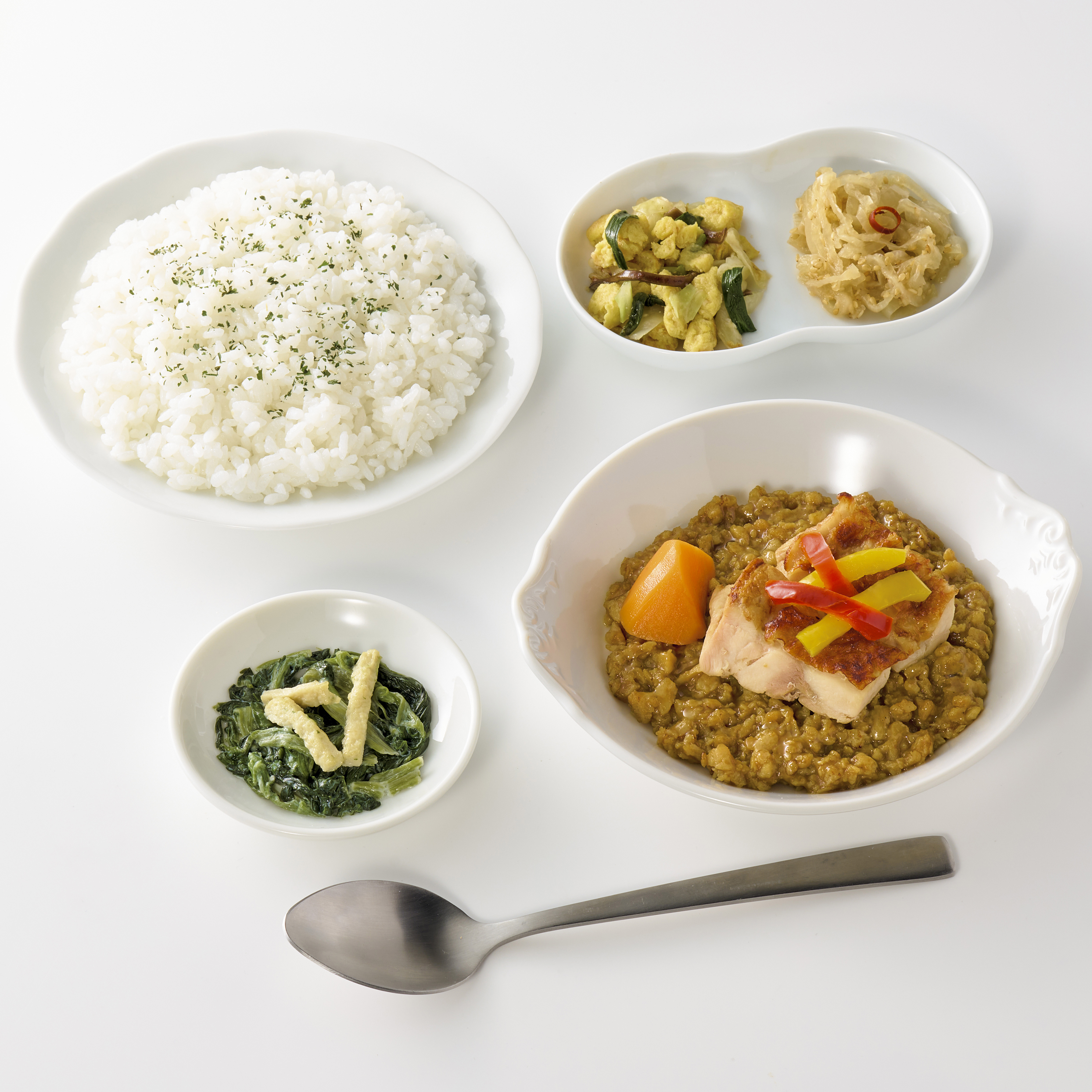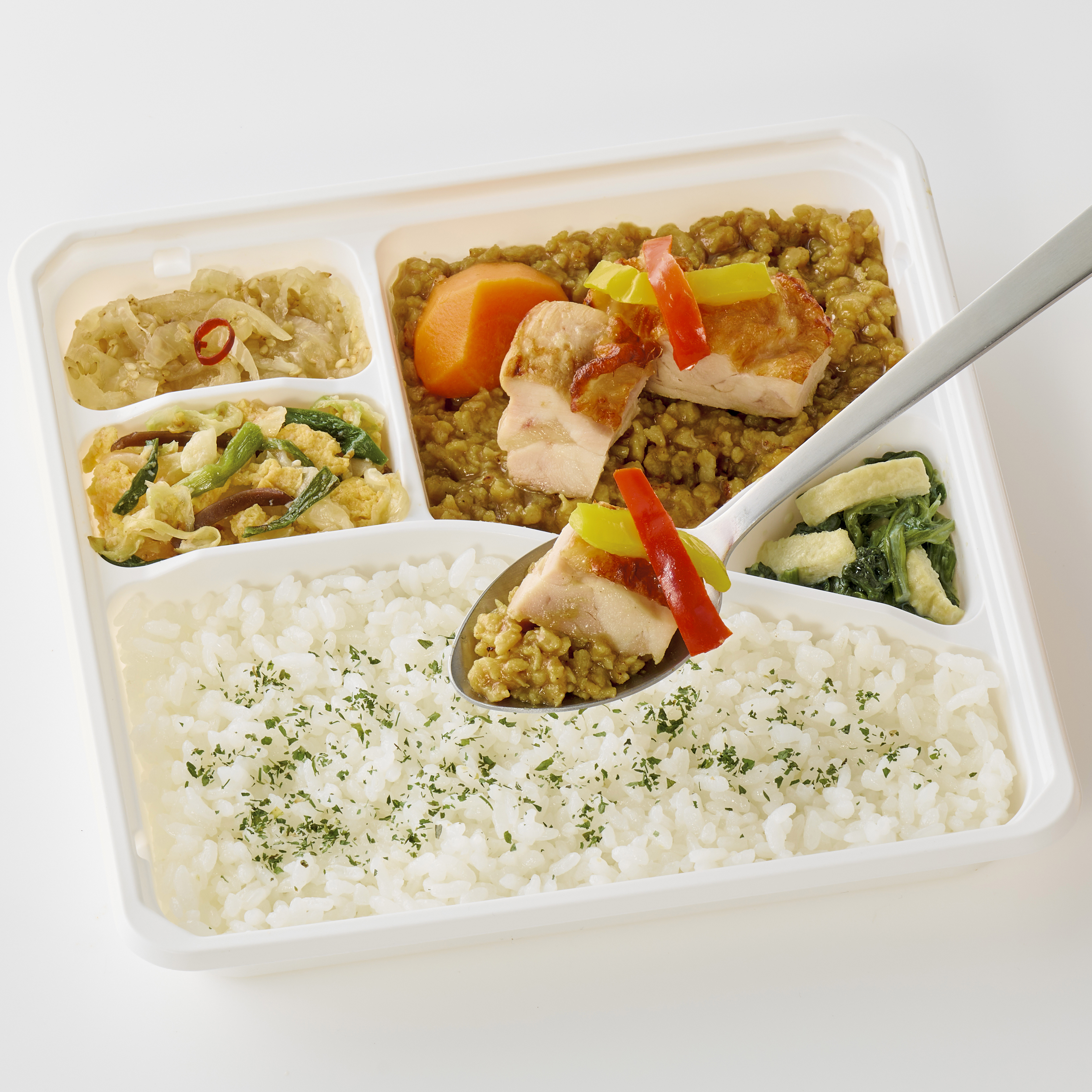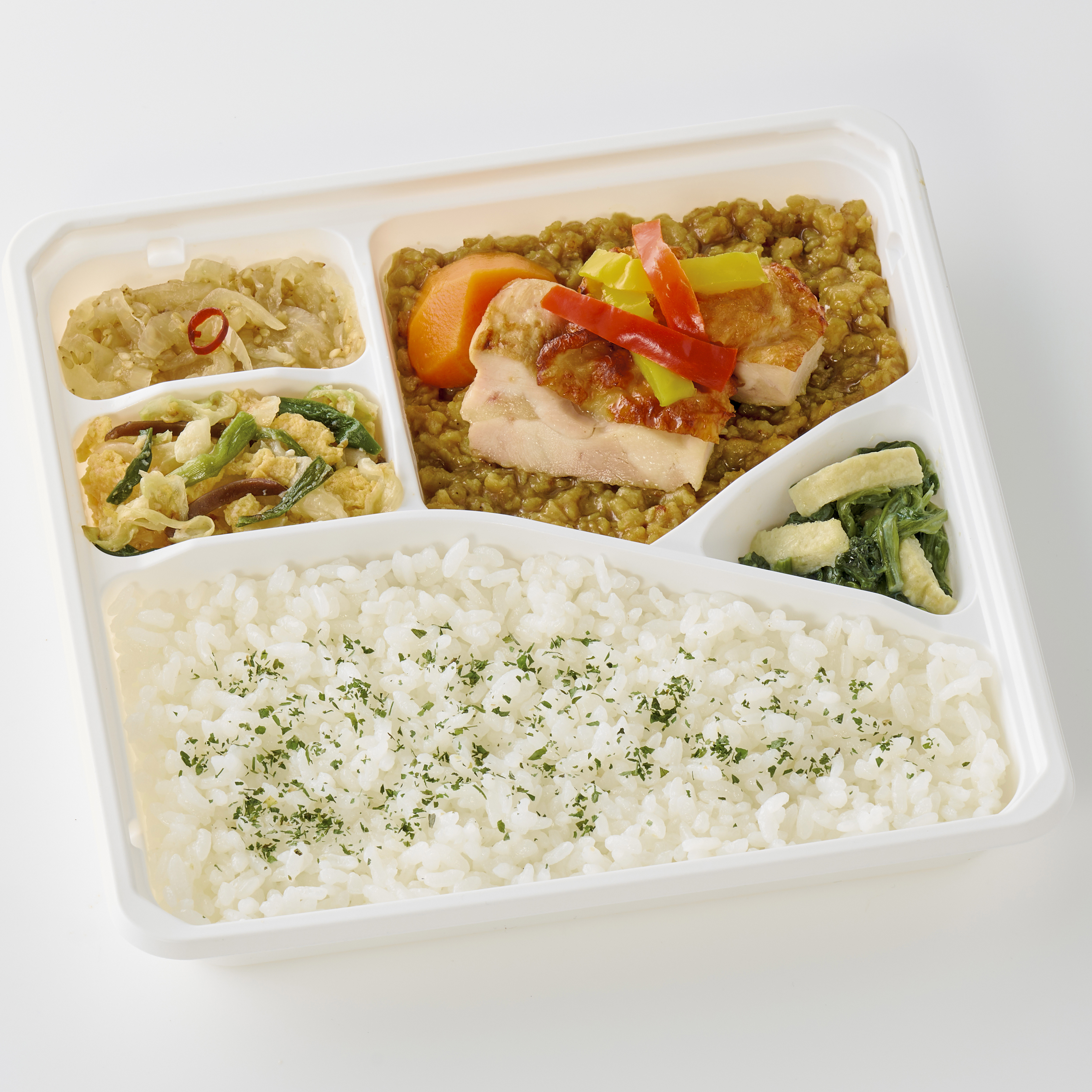 | 原材料名 | うるち米(国産)、鶏肉(ブラジル産)、ほうれん草(ミャンマー産)、キャベツ、卵、人参、玉ねぎ、粒状植物性たん白、カレーフレーク、ホエイたんぱく濃縮物、砂糖、ピーマン、植物油、油揚げ、醤油、発酵調味料、みりん風味調味料、ごま、ニラ、調合ごま油、粉末調味料、ビタミン強化米、きくらげ、ケチャップ、パセリ、唐辛子、にんにく、食塩、醬油だし、糊料(加工でん粉、増粘多糖類)、調味料(アミノ酸等)、着色料(カラメル)、pH調整剤、調味料、凝固剤、乳化剤、乳酸Ca、香料、酒精、(一部に小麦・卵・乳成分・オレンジ・牛肉・ごま・さば・大豆・鶏肉・豚肉・やまいも・ゼラチンを含む)原材料配合割合(仕込み時):鶏肉7%カレーフレーク1% | ||