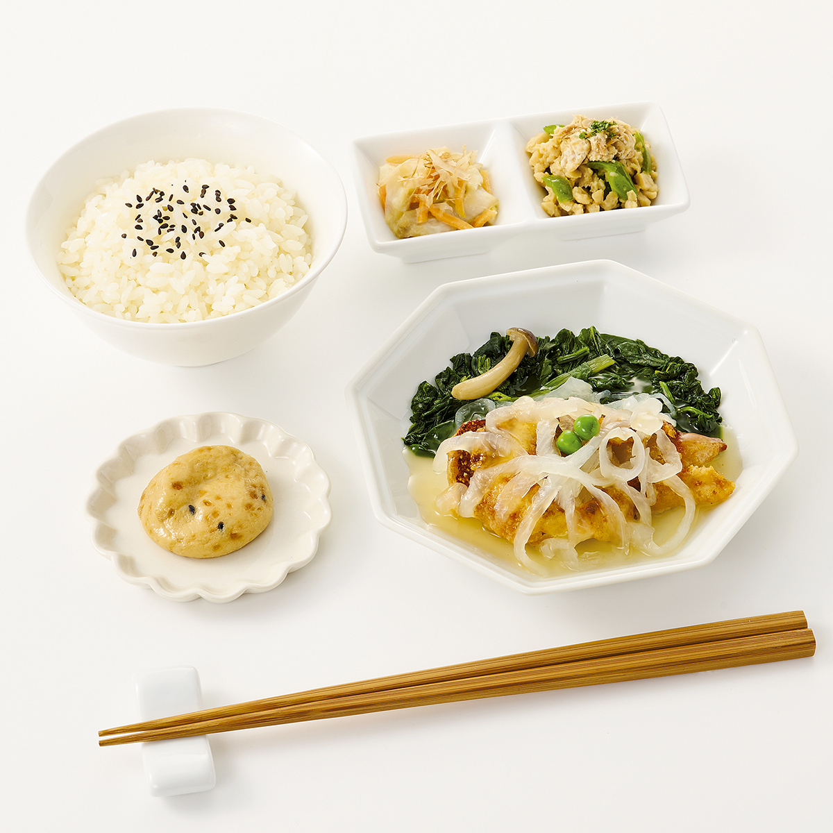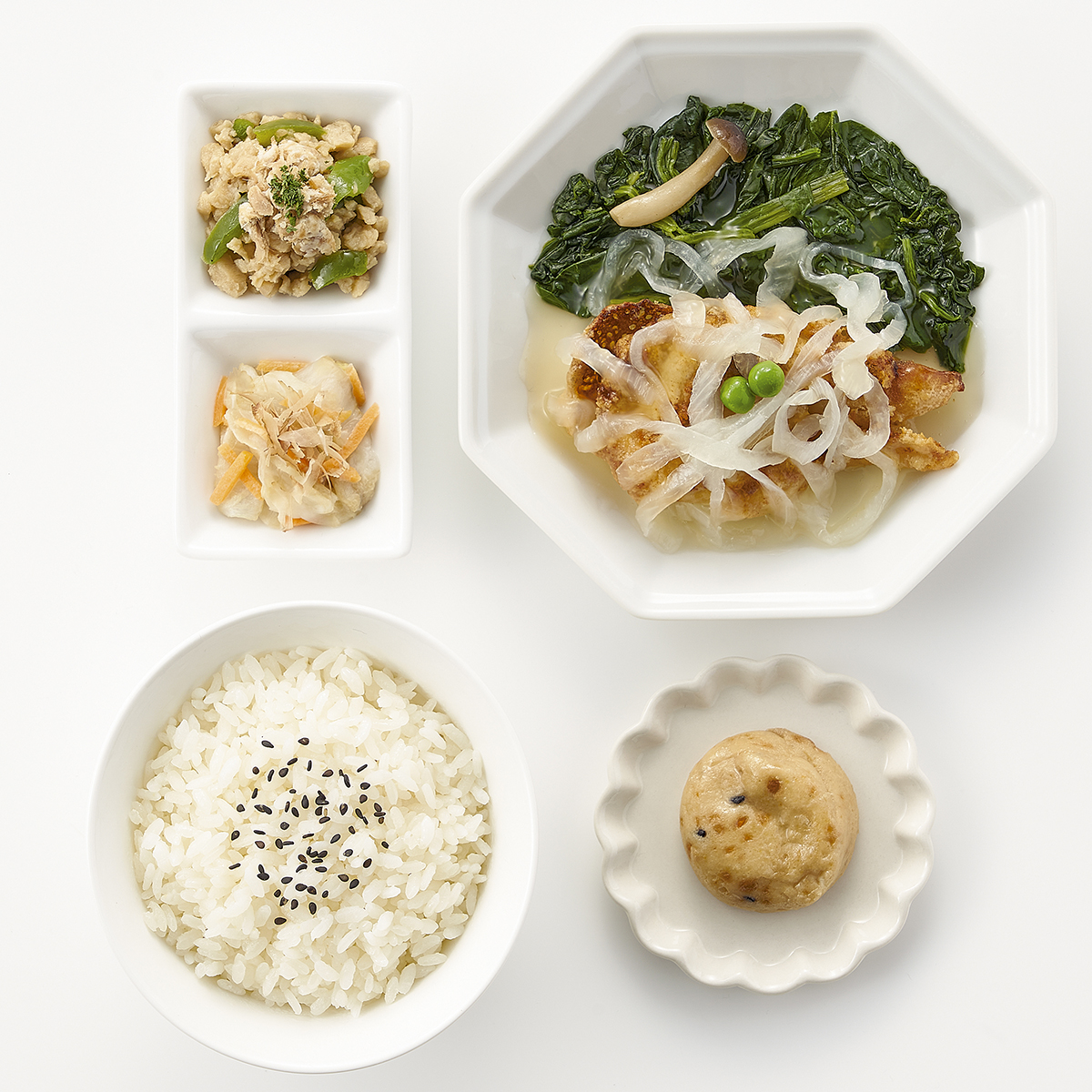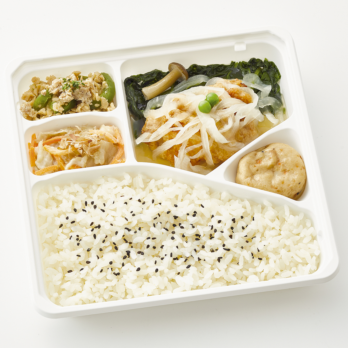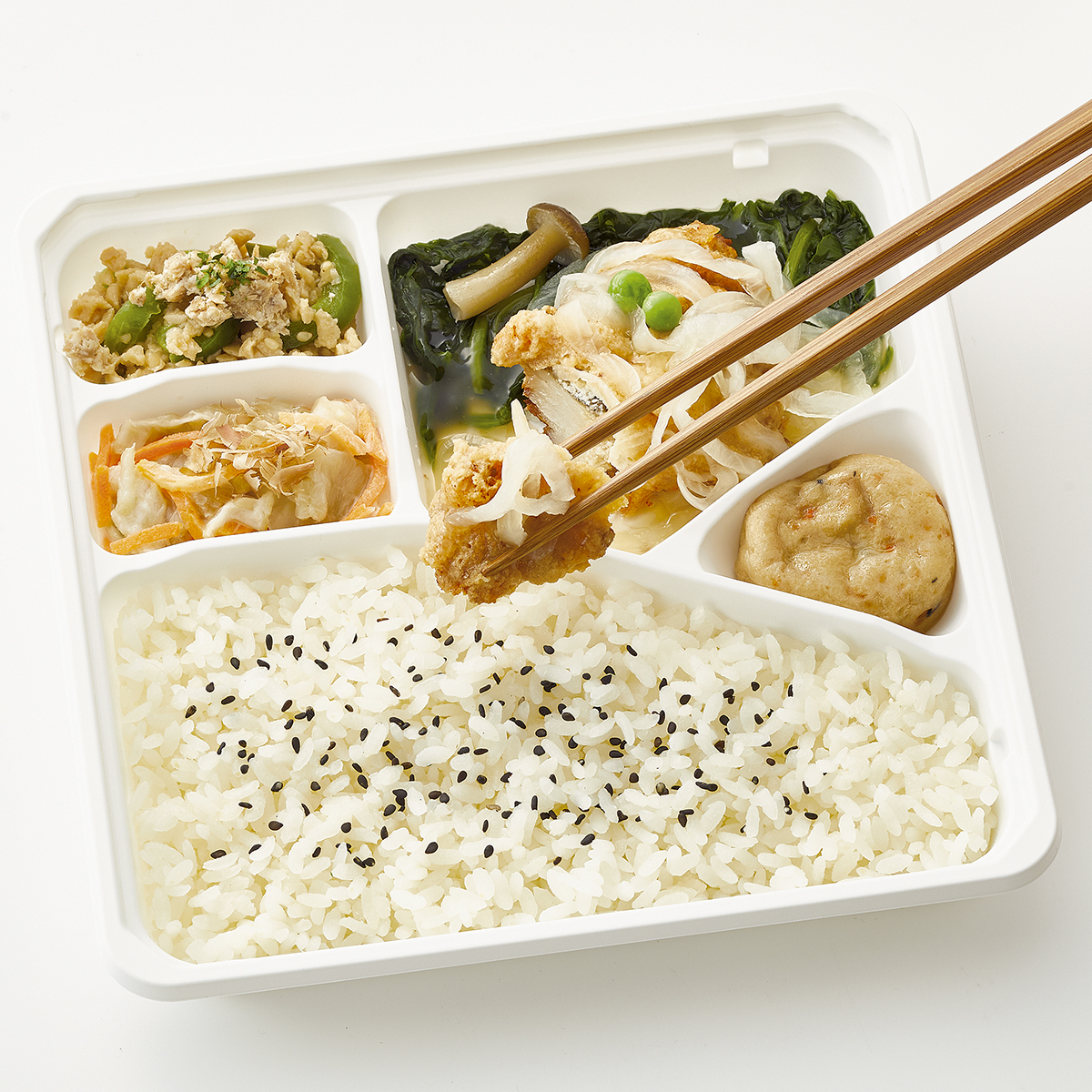 | 原材料名 | うるち米(日本産)、アブラガレイ(アメリカ産)、がんも、ホエイたんぱく濃縮物、人参、ピーマン、ほうれん草、ガラクトマンナン分解物、玉ねぎ、半固体状ドレッシング、醤油だし、植物油、砂糖、醤油、ツナフレーク、天ぷら粉、ぶなしめじ、粒状植物性たん白、みりん風調味料、グリーンピース、白菜、ごま、粉末調味料、パセリ、かつお削り節、発酵調味料、調合ごま油、しょうが/糊料(加工でん粉、増粘多糖類)、加工でん粉、調味料(アミノ酸等)、膨脹剤、pH調整剤、酒精、乳化剤、着色料(カロチノイド)、酸化防止剤(V.C)、香料、酸味料、香辛料、(一部に小麦・卵・乳成分・牛肉・ごま・さば・大豆・鶏肉・豚肉・りんご・ゼラチンを含む) 原材料配合割合(仕込み時):アブラガレイ7%人参3%ピーマン3%ほうれん草2%玉ねぎ1%グリーンピース0.2%白菜0.2% | ||