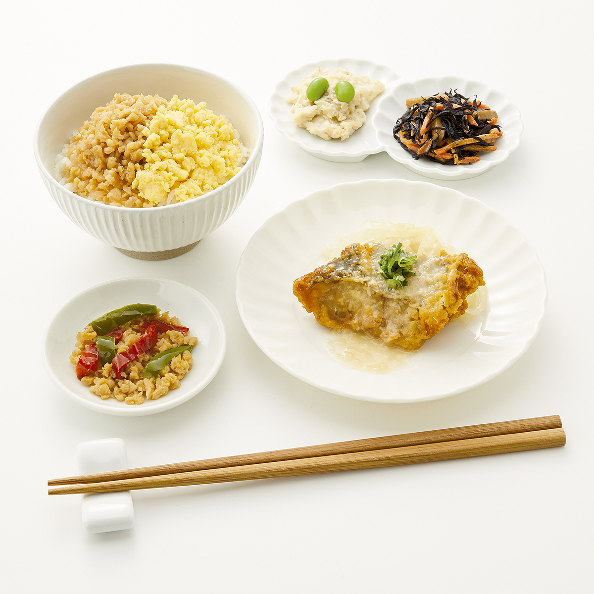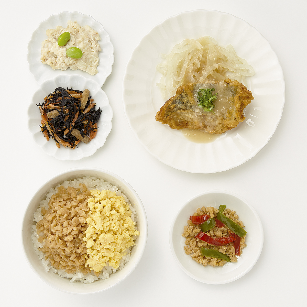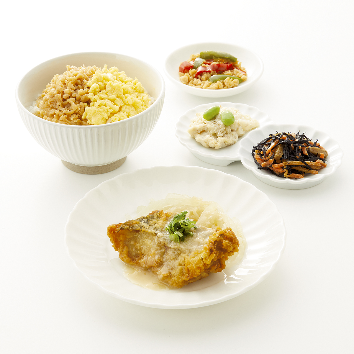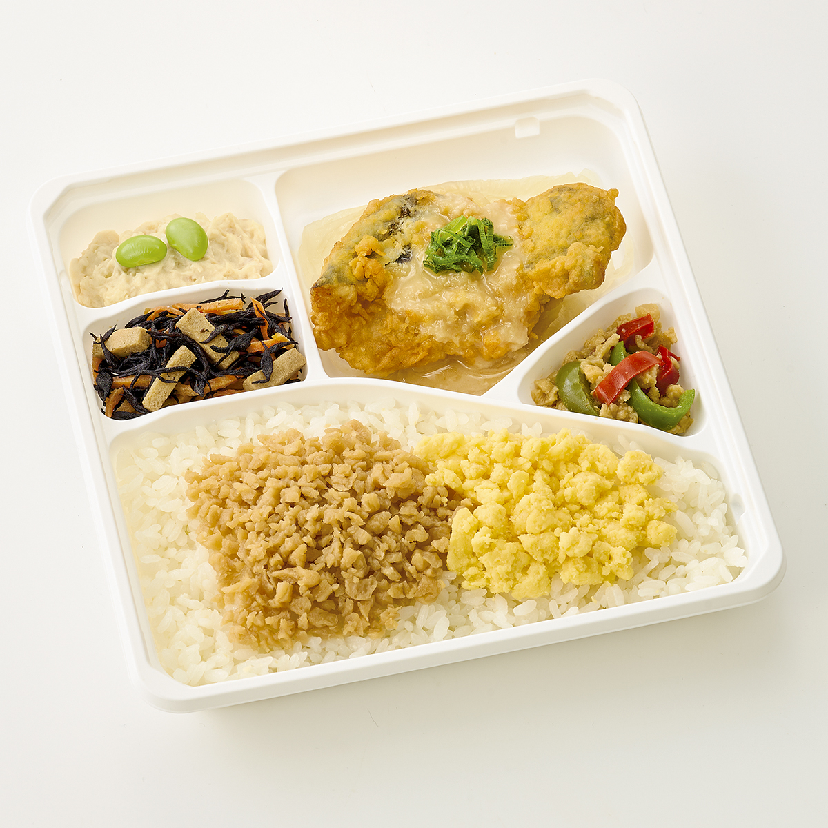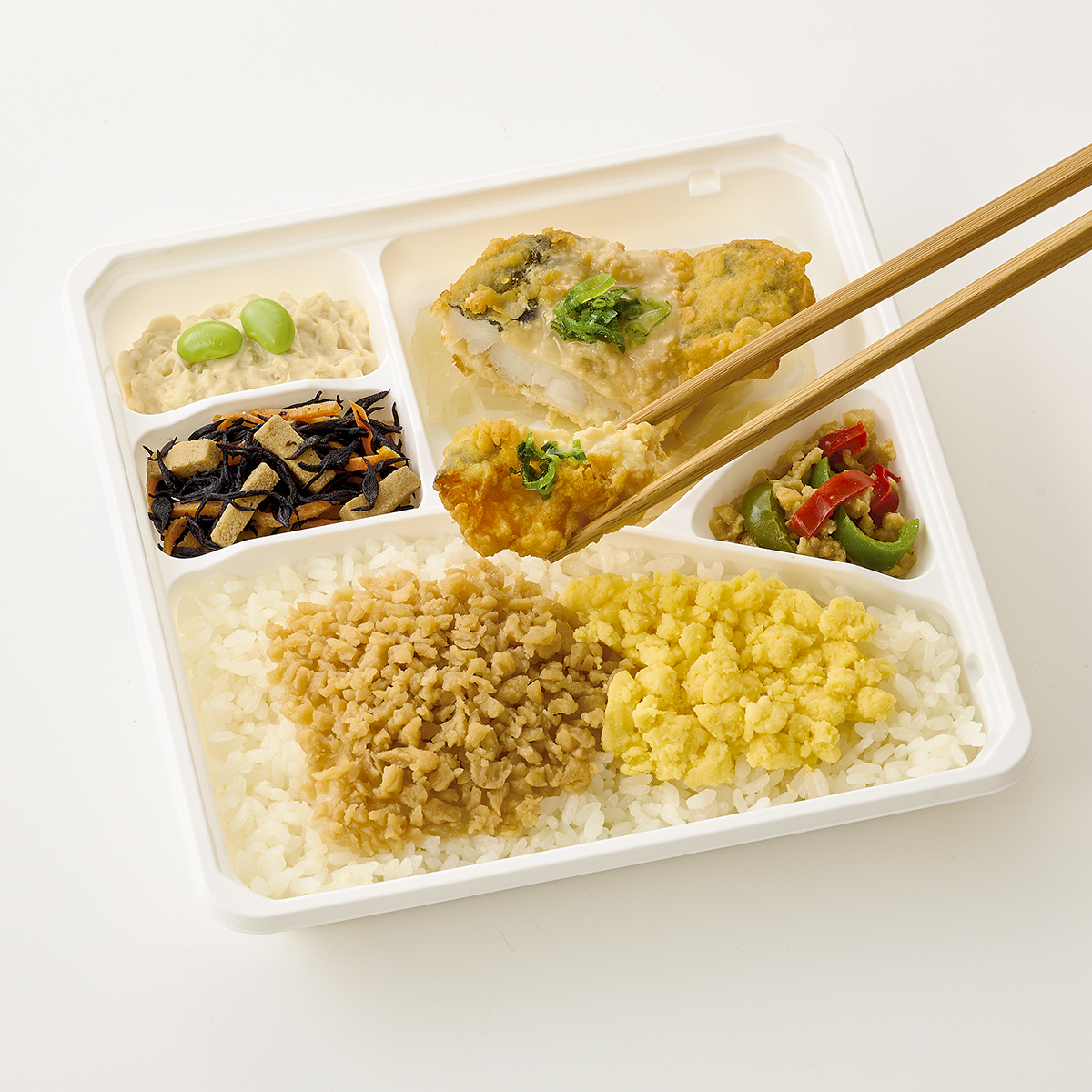 | 原材料名 | うるち米(日本産)、ホキ(ニュージーランド産)、ポテトサラダ、卵、ピーマン、人参、砂糖、ひじき、玉ねぎ、植物油、粒状植物性たん白、醤油、ホエイたんぱく濃縮物、大根おろし、天ぷら粉、半固体状ドレッシング、ツナフレーク、枝豆、高野豆腐、ねぎ、発酵調味料、みりん風調味料、醤油だし、ごま、食塩、かつお削り節、還元でん粉加水分解物、しょうが/加工でん粉、糊料(加工でん粉、増粘多糖類)、卵殻Ca、膨脹剤、調味料(アミノ酸等)、凝固剤、重曹、酵素、乳化剤、香辛料、酸味料、着色料(カロチノイド)、酸化防止剤(V.C)、pH調整剤、(一部に小麦・卵・乳成分・ごま・さば・大豆・鶏肉・りんご・ゼラチンを含む) 原材料配合割合(仕込み時):ホキ7% | ||