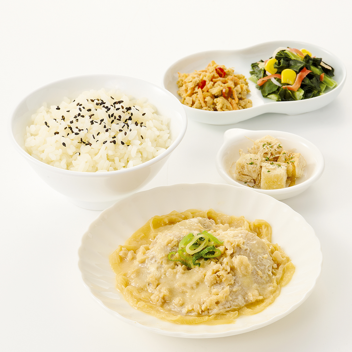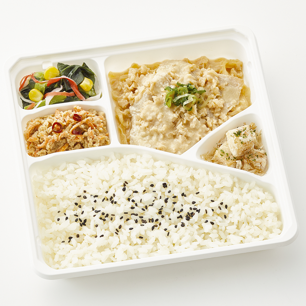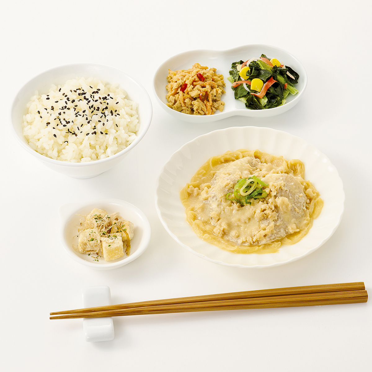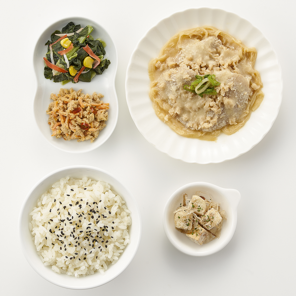 | 原材料名 | うるち米(日本産)、玉ねぎ(日本産)、小松菜(中国産)、じゃがいも、豚肉(アメリカ産)、人参、ホエイたんぱく濃縮物、みりん風調味料、発酵調味料、醤油、ツナフレーク、砂糖、植物油、粒状植物性たん白、しょうが(中国産)、ねぎ、とうもろこし、魚肉ねり製品、醤油だし、にんにく、ごま、調合ごま油、かつお削り節、唐辛子、パセリ/糊料(加工でん粉、増粘多糖類)、卵殻Ca、リン酸塩(Na)、調味料(アミノ酸等)、加工でん粉、炭酸Ca、pH調整剤、酸化防止剤(V.C)、着色料(トマト色素)、酸味料、香料、乳化剤、(一部にかに・小麦・卵・乳成分・ごま・さば・大豆・豚肉を含む) 原材料配合割合(仕込み時):豚肉3%しょうが0.6% | ||