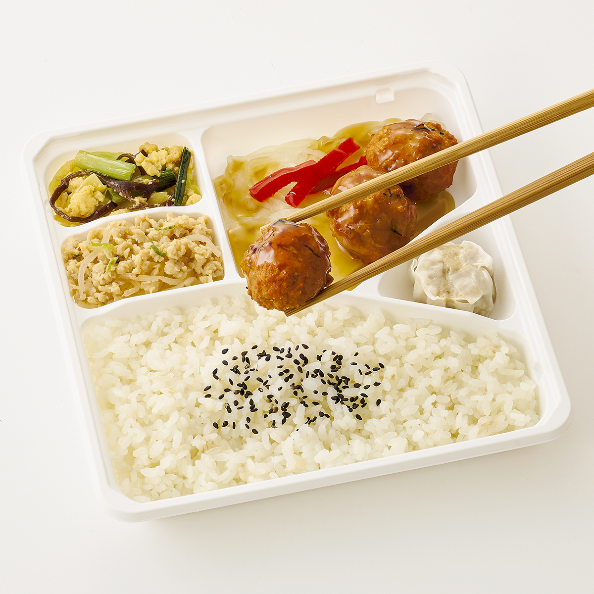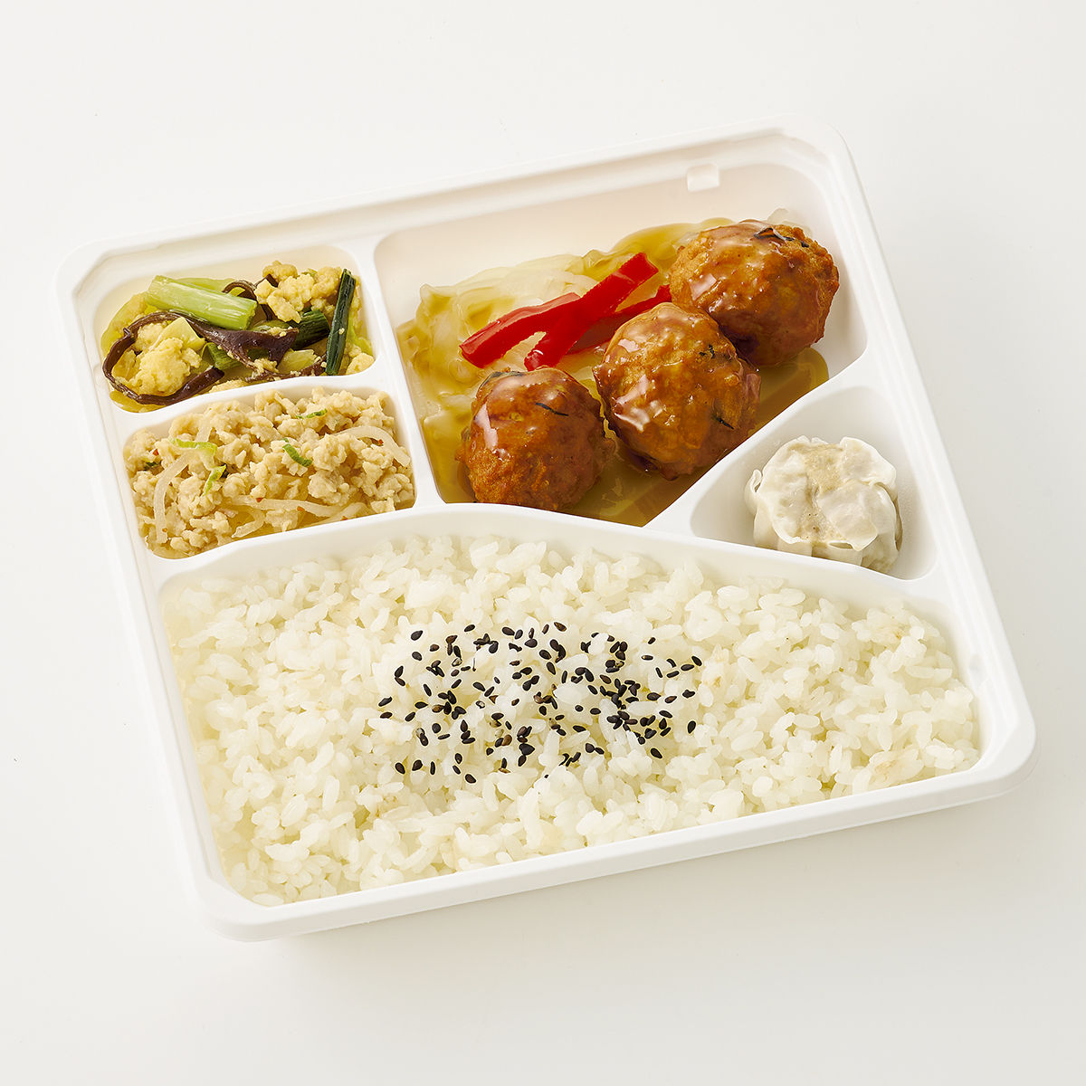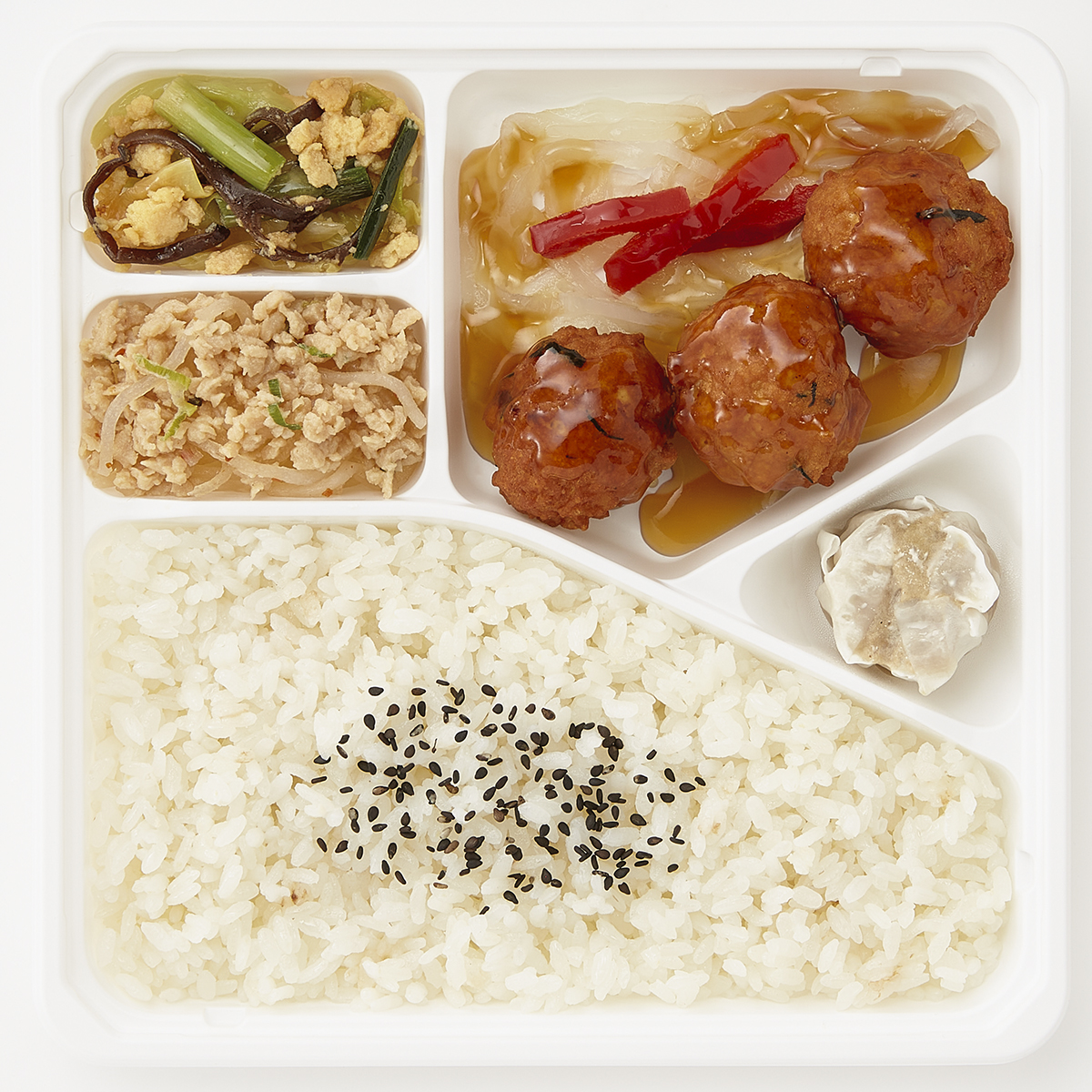 | 原材料名 | うるち米(日本産)、シュウマイ、鶏ひき肉(日本産)、キャベツ、春雨、卵、豆腐、ホエイたんぱく濃縮物、玉ねぎ、黒酢、砂糖、醤油、植物油、ピーマン、粒状植物性たん白、ニラ、人参、粉末調味料、調合ごま油、発酵調味料、ひじき(中国産)、ごま、しょうが、みりん風調味料、きくらげ、ねぎ、にんにく、みそ、塩こしょう、トウバンジャン/糊料(加工でん粉、CMC、増粘多糖類)、調味料(アミノ酸等)、pH調整剤、凝固剤、ミョウバン、ピロリン酸鉄、グリシン、酸化防止剤(V.C)、着色料(カラメル)、酸味料、香料、(一部にえび・かに・小麦・卵・乳成分・牛肉・ごま・大豆・鶏肉・豚肉・ゼラチンを含む) 原材料配合割合(仕込み時):鶏ひき肉4%黒酢1%ひじき0.1% | ||