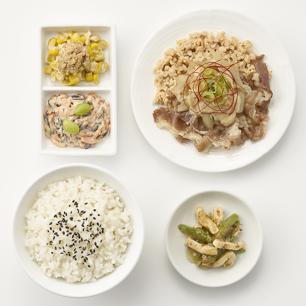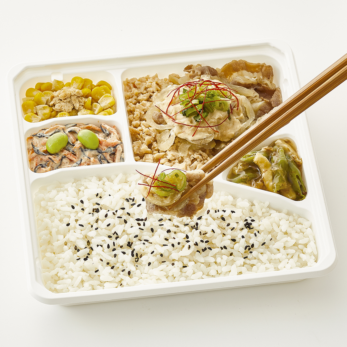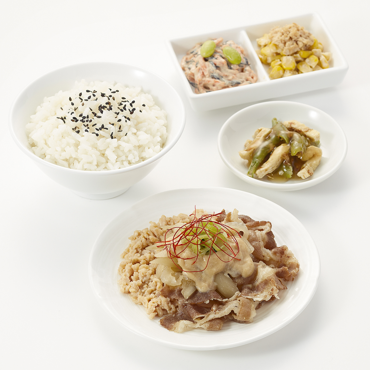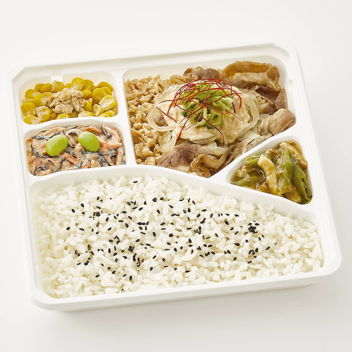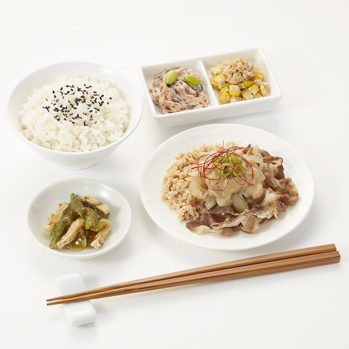 | 原材料名 | うるち米(日本産)、とうもろこし(タイ産)、牛肉(アメリカ産)、ホエイたんぱく濃縮物、人参、醤油、ごぼう(中国産)、玉ねぎ、砂糖、半固体状ドレッシング、粒状植物性たん白、みりん風調味料、油揚げ、いんげん、ひじき、ツナフレーク、植物油、発酵調味料、枝豆、ねぎ、醤油だし、ごま、しょうが、かつお削り節、唐辛子、塩こしょう/糊料(加工でん粉、増粘多糖類)、調味料(アミノ酸等)、ピロリン酸鉄、凝固剤、酸化防止剤(V.C)、pH調整剤、香辛料、酸味料、酒精、(一部に小麦・卵・乳成分・牛肉・ごま・さば・大豆・りんご・ゼラチンを含む) 原材料配合割合(仕込み時):牛肉5%ごぼう1% | ||