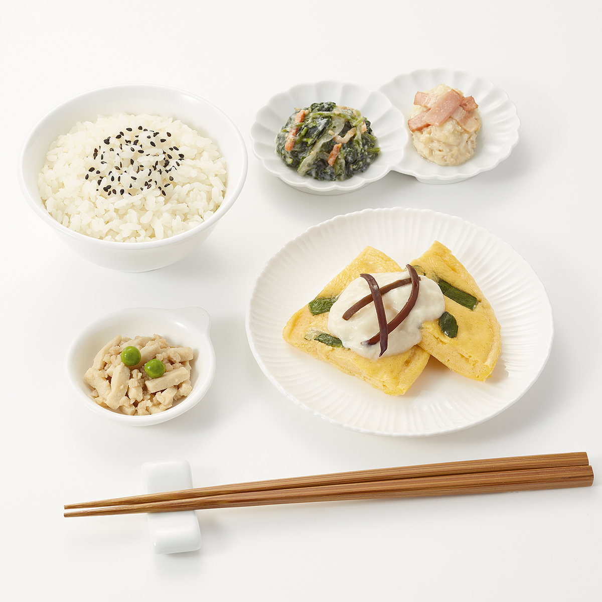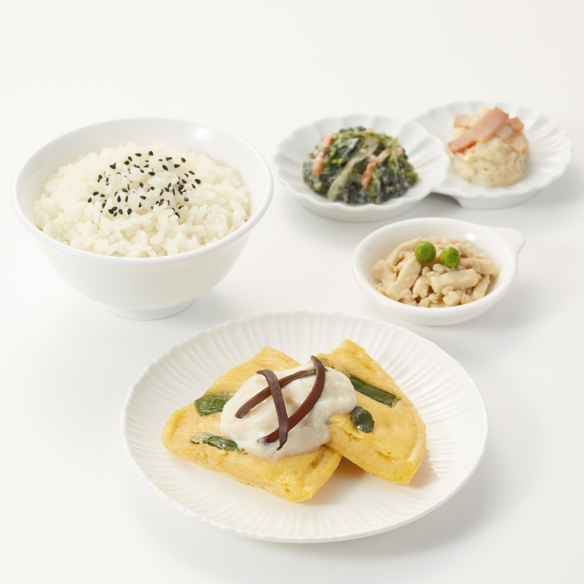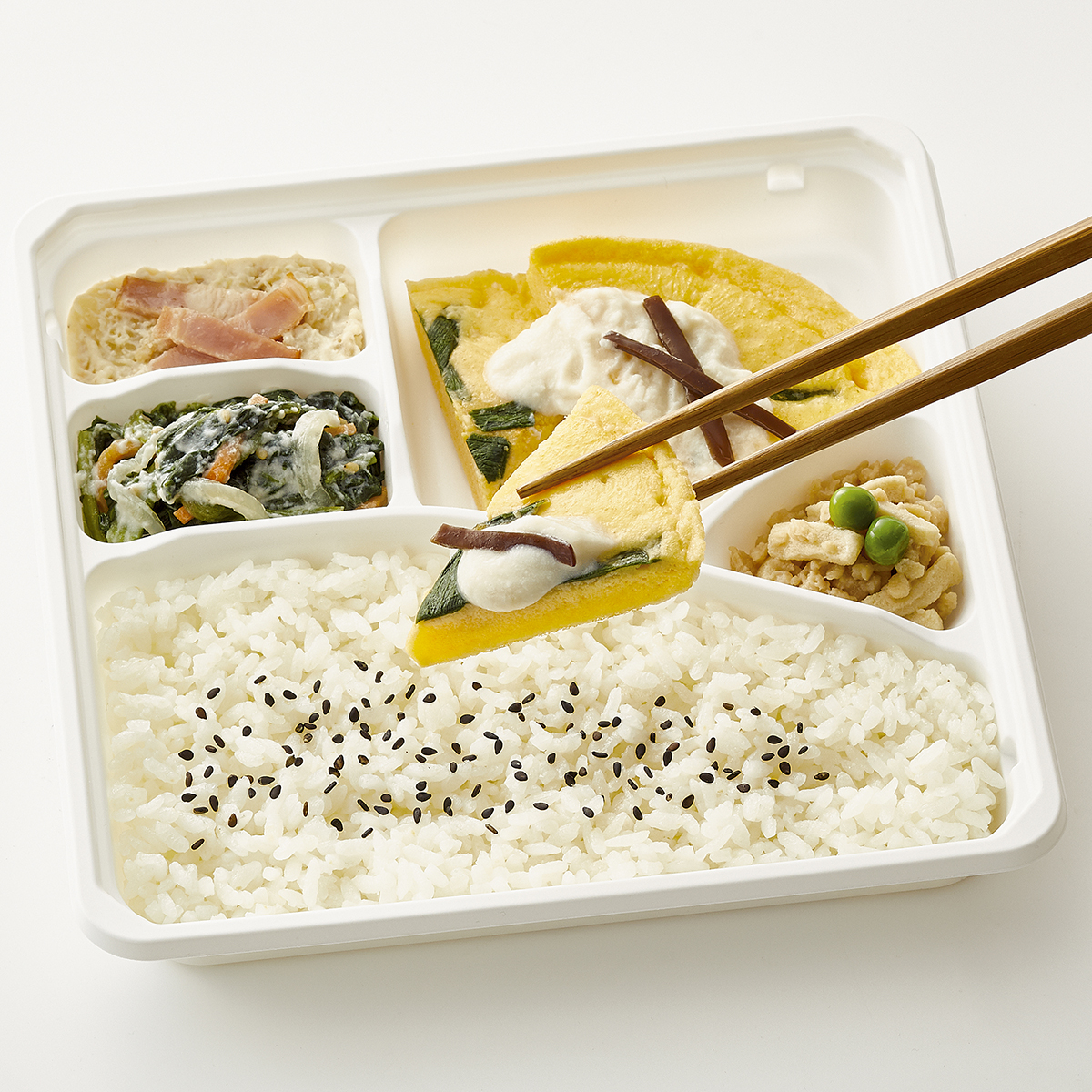 | 原材料名 | うるち米(日本産)、卵(日本産)、ポテトサラダ、ホエイたんぱく濃縮物、高野豆腐、ほうれん草、人参、ベーコン、植物油、半固体状ドレッシング、発酵調味料、玉ねぎ、醤油だし、ニラ(中国産)、きくらげ、醤油、粒状植物性たん白、砂糖、還元でん粉加水分解物、グリーンピース、粉末調味料、ごま塩、調合ごま油、みりん風調味料、オイスターソース、かつお削り節、ごま、しょうが/糊料(加工でん粉、増粘多糖類)、トレハロース、塩化マグネシウム、調味料(アミノ酸等)、凝固剤、加工でん粉、重曹、カゼインNa、リン酸塩(Na)、酒精、くん液、酸化防止剤(V.C)、酵素、着色料(クチナシ)、発色剤(亜硝酸Na)、酸味料、香辛料、pH調整剤、香料、(一部に小麦・卵・乳成分・牛肉・ごま・さば・大豆・鶏肉・豚肉・りんご・ゼラチンを含む) 原材料配合割合(仕込み時):卵11%ニラ0.6% | ||