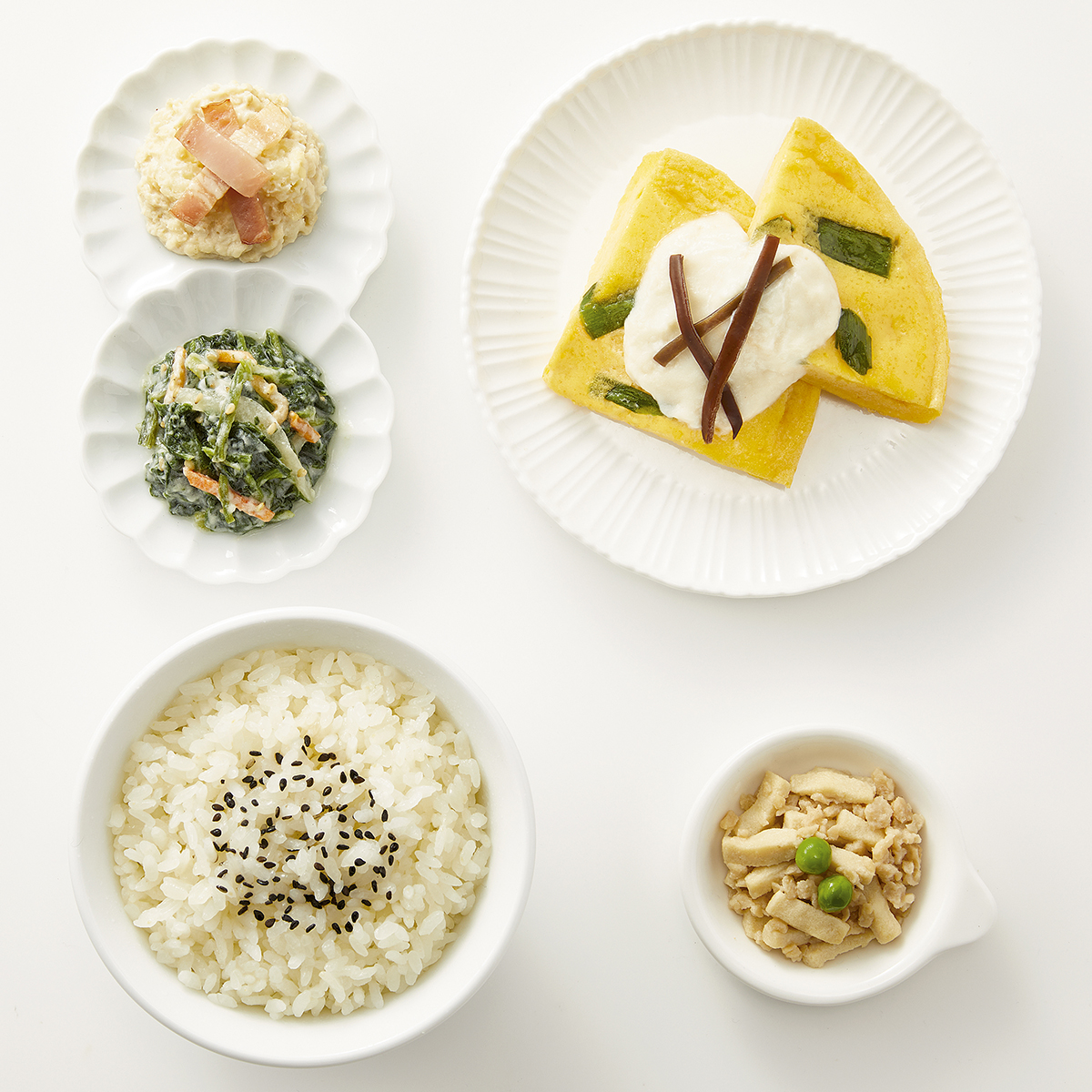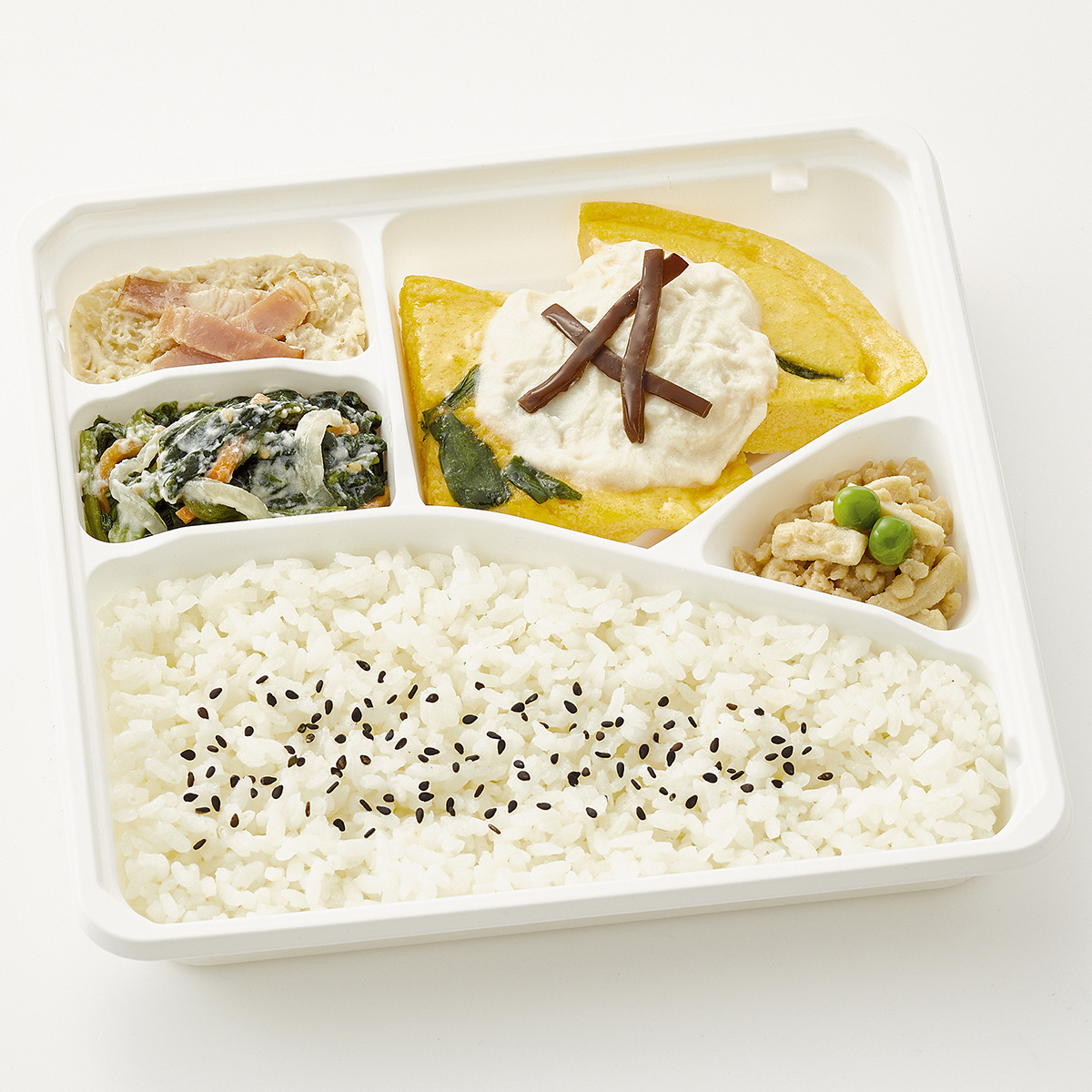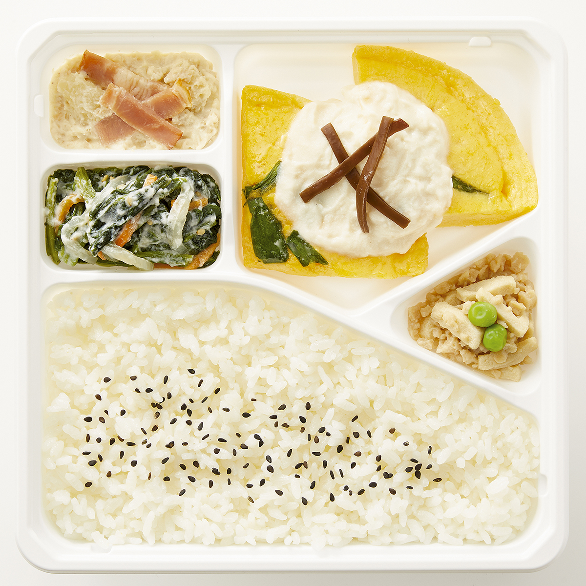 | 原材料名 | うるち米(日本産)、卵(日本産)、ポテトサラダ、ホエイたんぱく濃縮物、高野豆腐、ほうれん草、人参、ベーコン、植物油、半固体状ドレッシング、発酵調味料、玉ねぎ、醤油だし、ニラ(中国産)、きくらげ、醤油、粒状植物性たん白、砂糖、還元でん粉加水分解物、グリーンピース、粉末調味料、ごま塩、調合ごま油、みりん風調味料、オイスターソース、かつお削り節、ごま、しょうが/糊料(加工でん粉、増粘多糖類)、トレハロース、塩化マグネシウム、調味料(アミノ酸等)、凝固剤、加工でん粉、重曹、カゼインNa、リン酸塩(Na)、酒精、くん液、酸化防止剤(V.C)、酵素、着色料(クチナシ)、発色剤(亜硝酸Na)、酸味料、香辛料、pH調整剤、香料、(一部に小麦・卵・乳成分・牛肉・ごま・さば・大豆・鶏肉・豚肉・りんご・ゼラチンを含む) 原材料配合割合(仕込み時):卵11%ニラ0.6% | ||