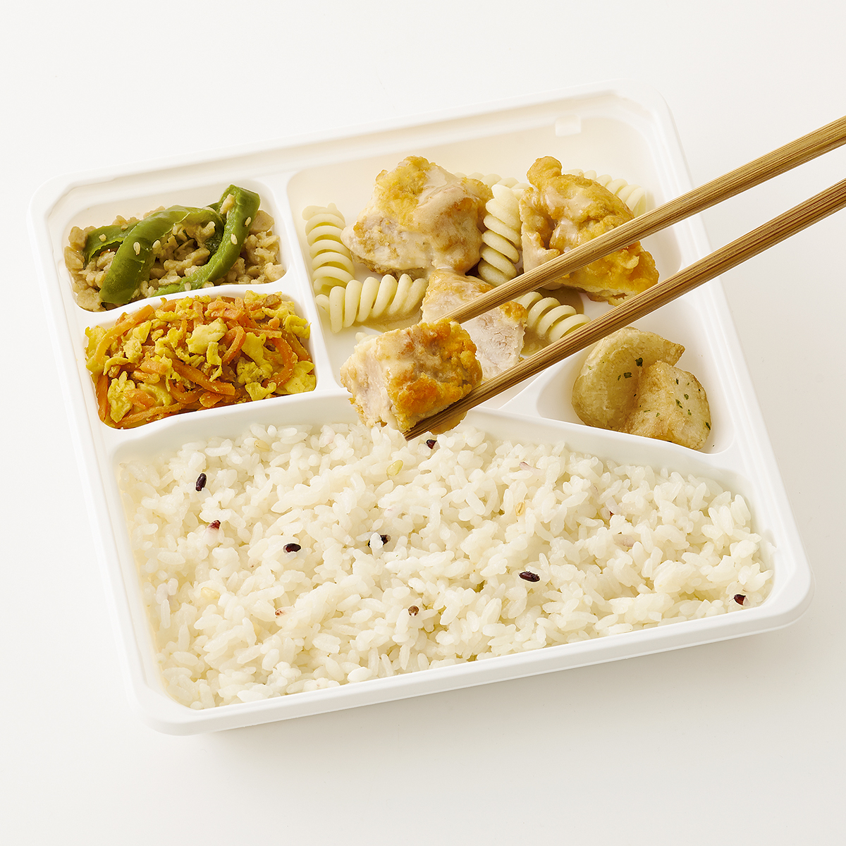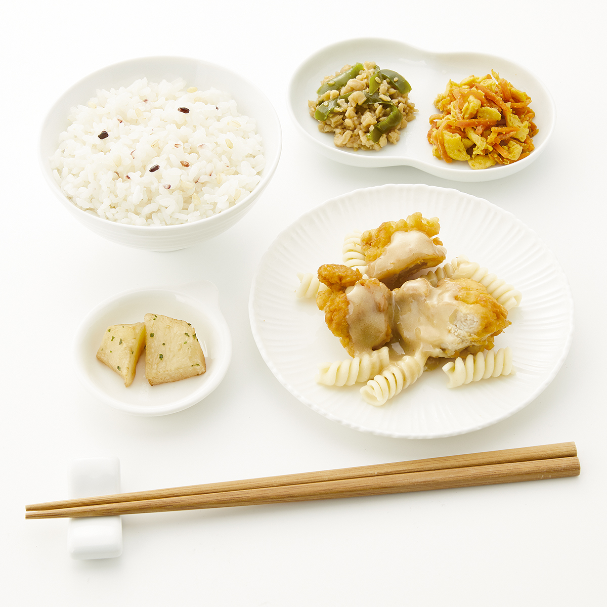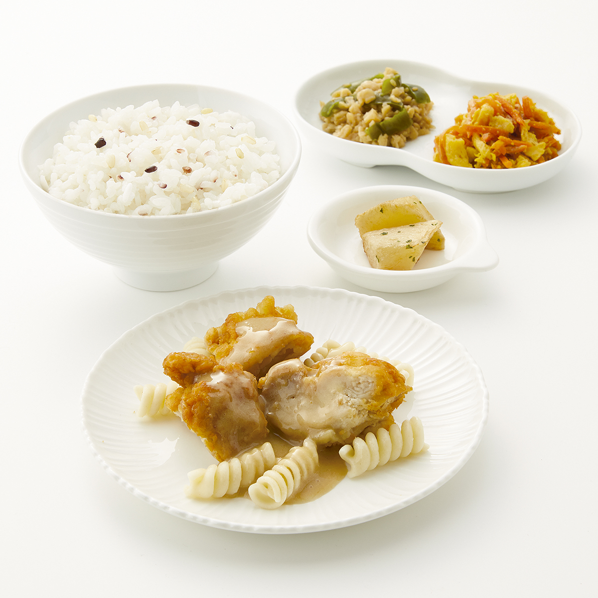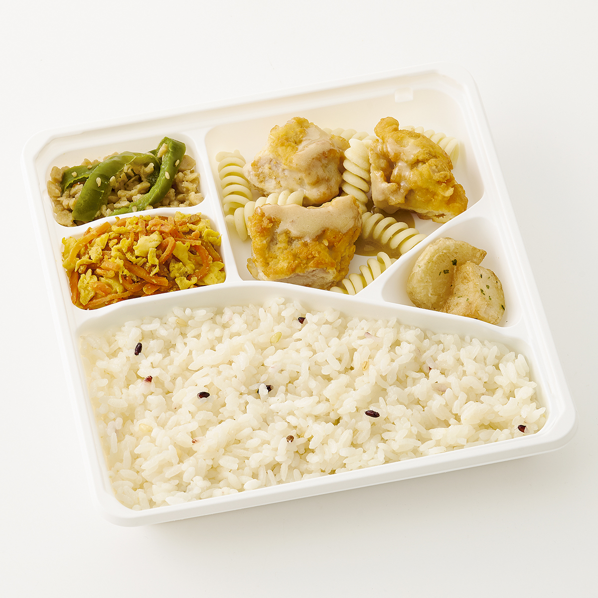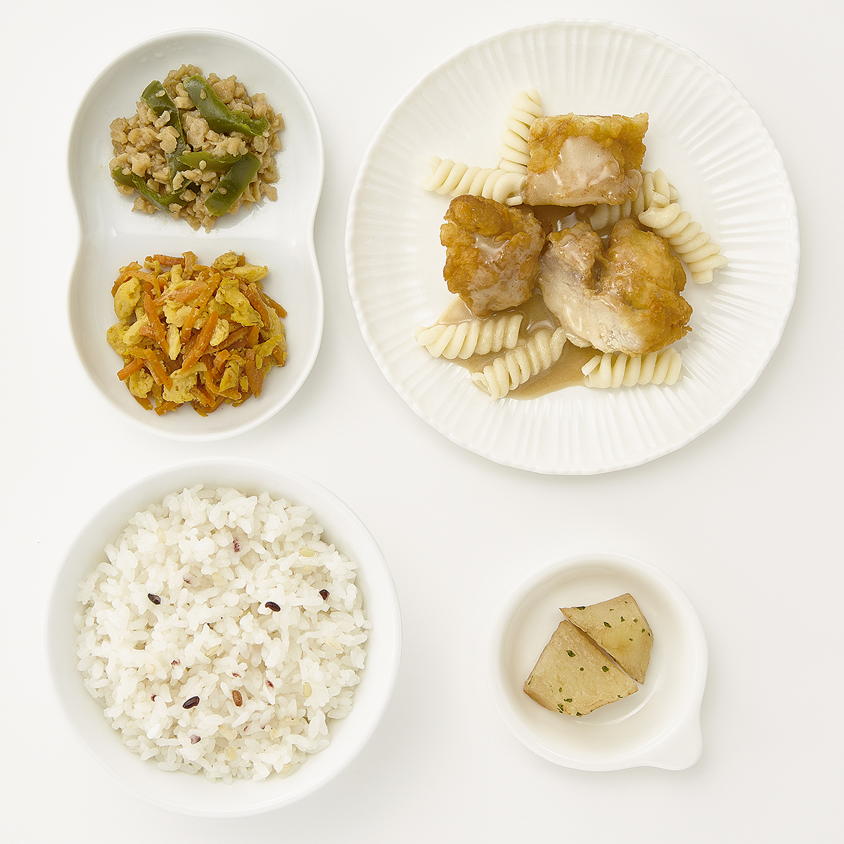| 原材料名 | うるち米(日本産)、鶏肉(ブラジル産)、マカロニ、じゃがいも、人参、ピーマン、卵、ホエイたんぱく濃縮物、加工酢、砂糖、醤油、植物油、天ぷら粉、粒状植物性たん白、発酵調味料、雑穀(日本産米)、調合ごま油、醤油だし、みりん風調味料、食塩、しょうが、ごま、アオサ/糊料(加工でん粉、増粘多糖類)、加工でん粉、塩化マグネシウム、調味料(アミノ酸等)、膨脹剤、pH調整剤、乳化剤、酸化防止剤(V.C)、酸味料、着色料(カロチノイド)、(一部に小麦・卵・乳成分・オレンジ・ごま・さば・大豆・鶏肉を含む)原材料配合割合(仕込み時):鶏肉8% | ||