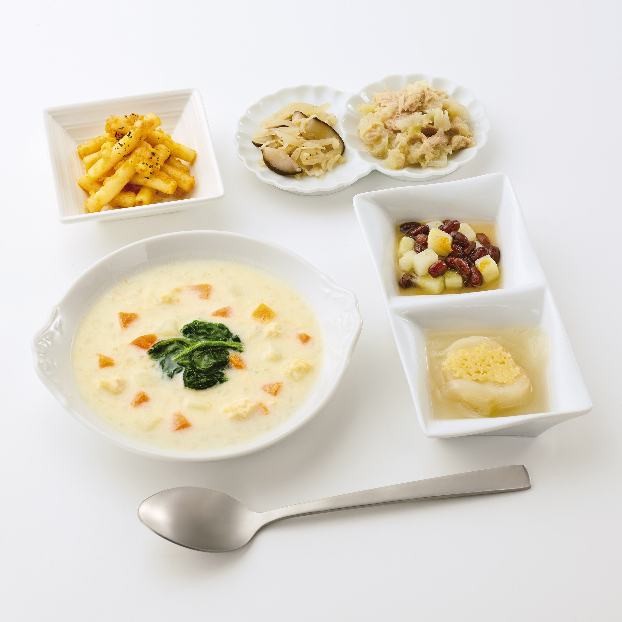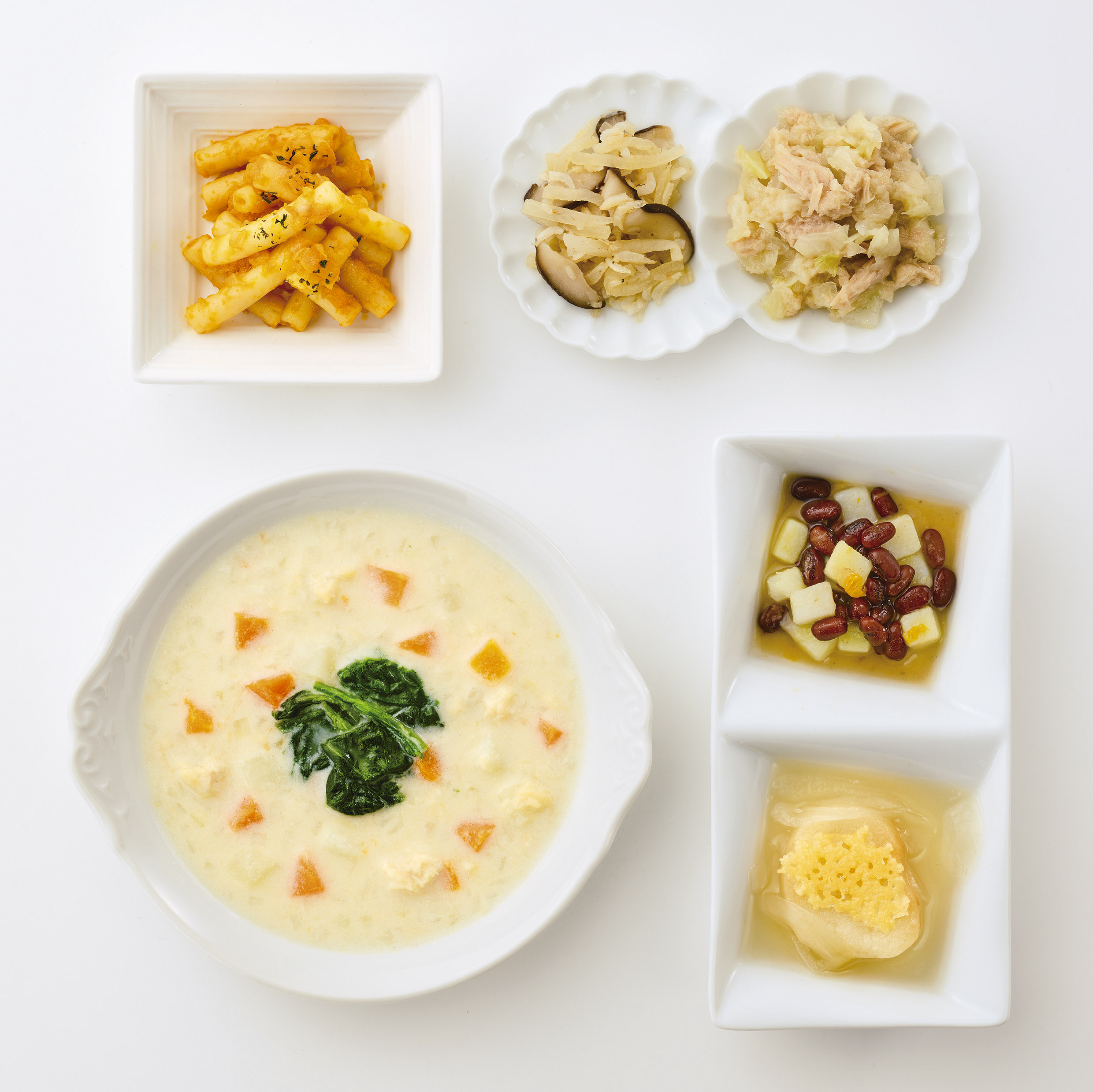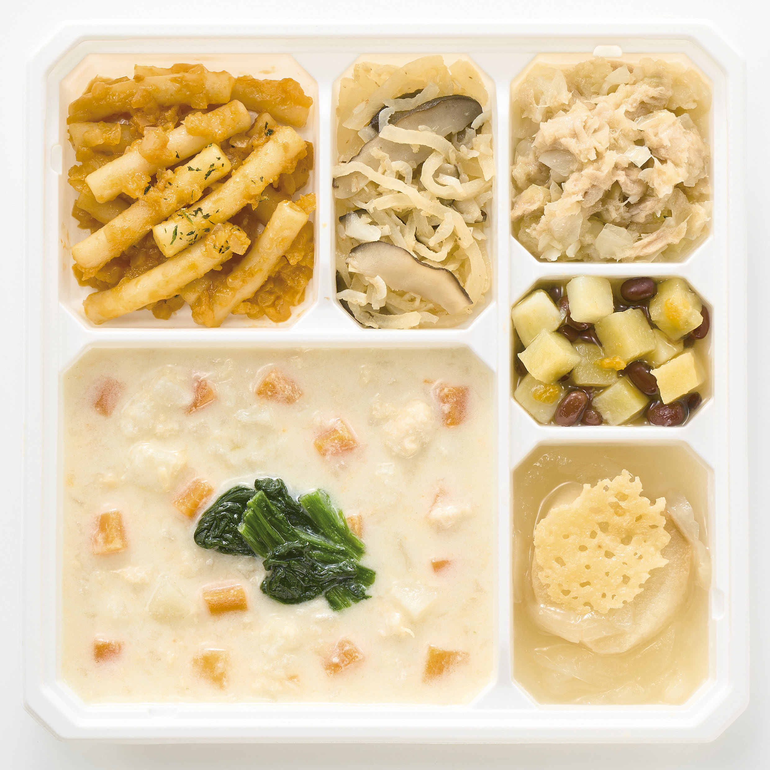| 原材料名 | 牛乳(国内製造)、たまねぎ、鶏ささみ肉水煮・ほぐし肉、キャベツ、だいこん、じゃがいも、にんじん、まぐろ水煮(フレーク)、ほうれんそう、トマトケチャップ、トマトピューレ、パスタ、しいたけ、食用オリーブ油、さつまいも、蒸し小豆、バター、砂糖、小麦粉、ナチュラルチーズ、焼麸、洋風だし(コンソメ)、リキュール、小海老、チーズフード、にんにく、乾燥スープ(コンソメ)、パセリ、食塩、ホワイトペッパー/増粘剤(加工でん粉、増粘多糖類)、調味料(アミノ酸等)、セルロース、クエン酸Na、pH調整剤、酸味料、カラメル色素、安定剤(増粘多糖類)、香料、酸化防止剤(V.E)、(一部にえび・小麦・乳成分・牛肉・ごま・大豆・鶏肉・ゼラチンを含む) 原材料配合割合 鶏肉7%(仕込み時) | ||