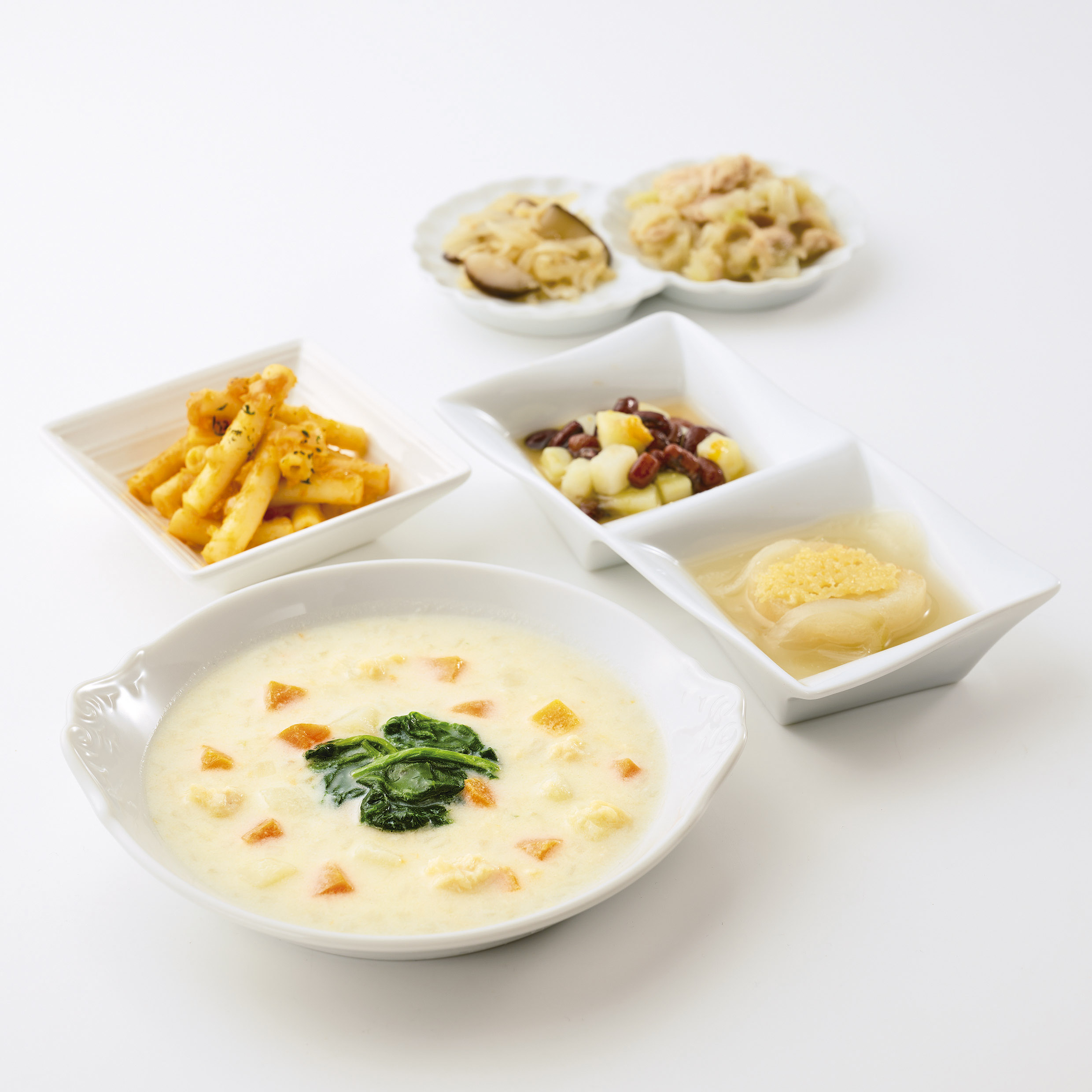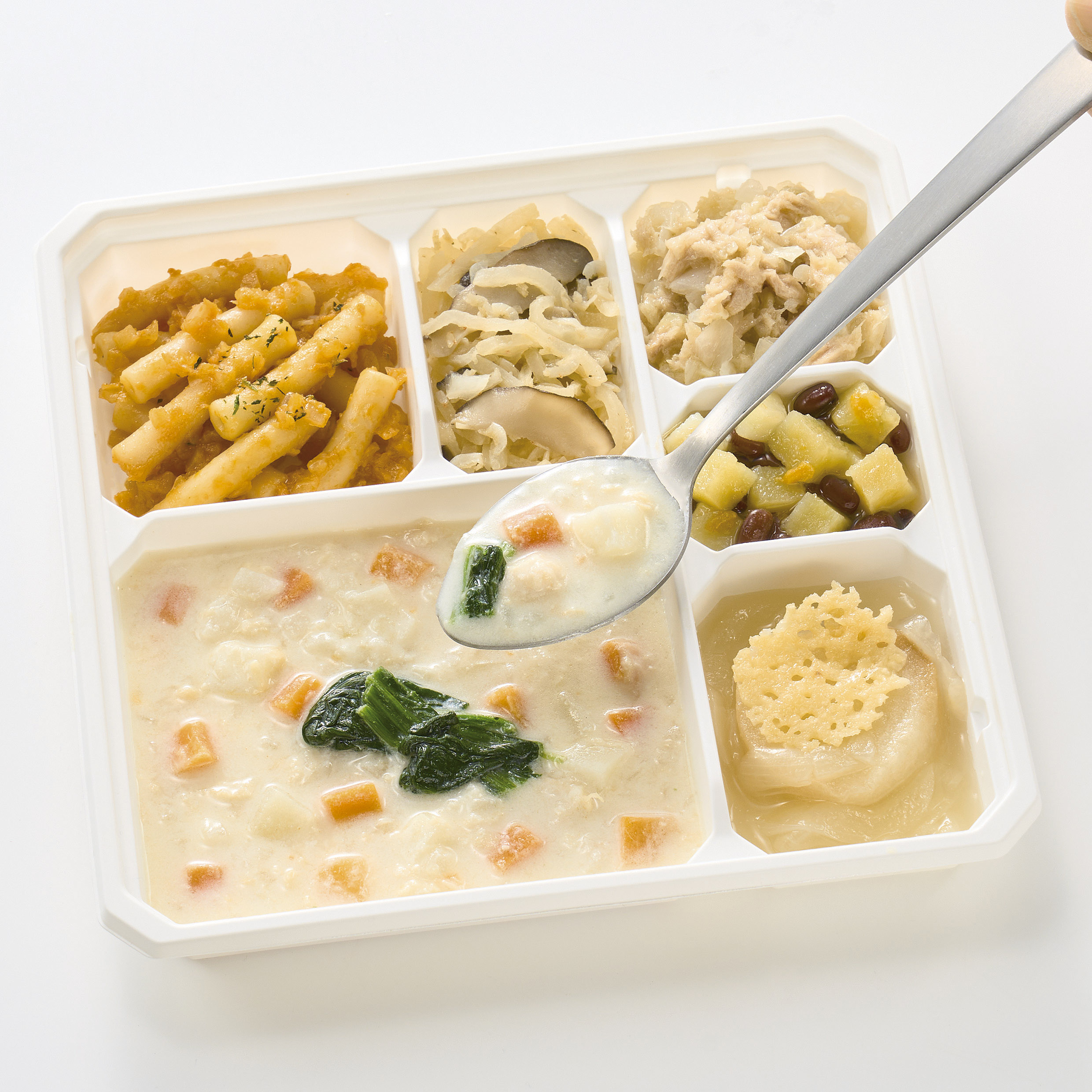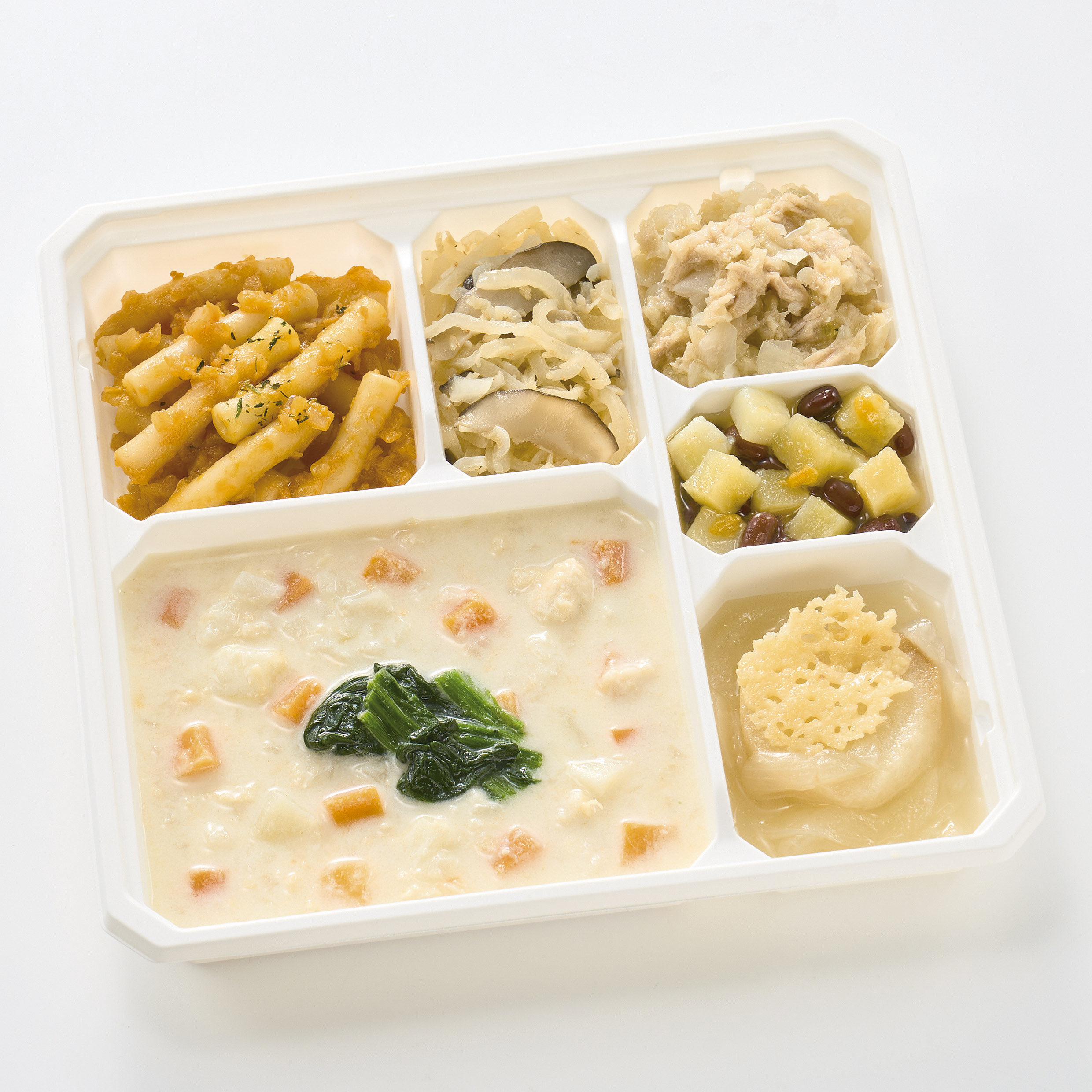| 原材料名 | 牛乳(国内製造)、たまねぎ、鶏ささみ肉水煮・ほぐし肉、キャベツ、だいこん、じゃがいも、にんじん、まぐろ水煮(フレーク)、ほうれんそう、トマトケチャップ、トマトピューレ、パスタ、しいたけ、食用オリーブ油、さつまいも、蒸し小豆、バター、砂糖、小麦粉、ナチュラルチーズ、焼麸、洋風だし(コンソメ)、リキュール、小海老、チーズフード、にんにく、乾燥スープ(コンソメ)、パセリ、食塩、ホワイトペッパー/増粘剤(加工でん粉、増粘多糖類)、調味料(アミノ酸等)、セルロース、クエン酸Na、pH調整剤、酸味料、カラメル色素、安定剤(増粘多糖類)、香料、酸化防止剤(V.E)、(一部にえび・小麦・乳成分・牛肉・ごま・大豆・鶏肉・ゼラチンを含む) 原材料配合割合 鶏肉7%(仕込み時) | ||