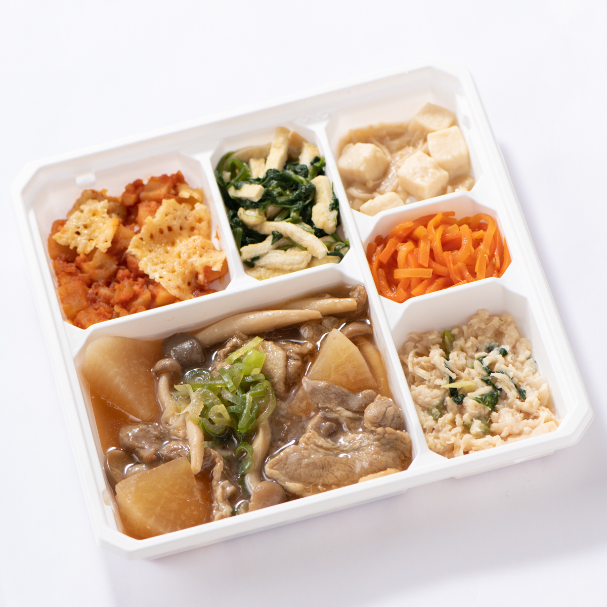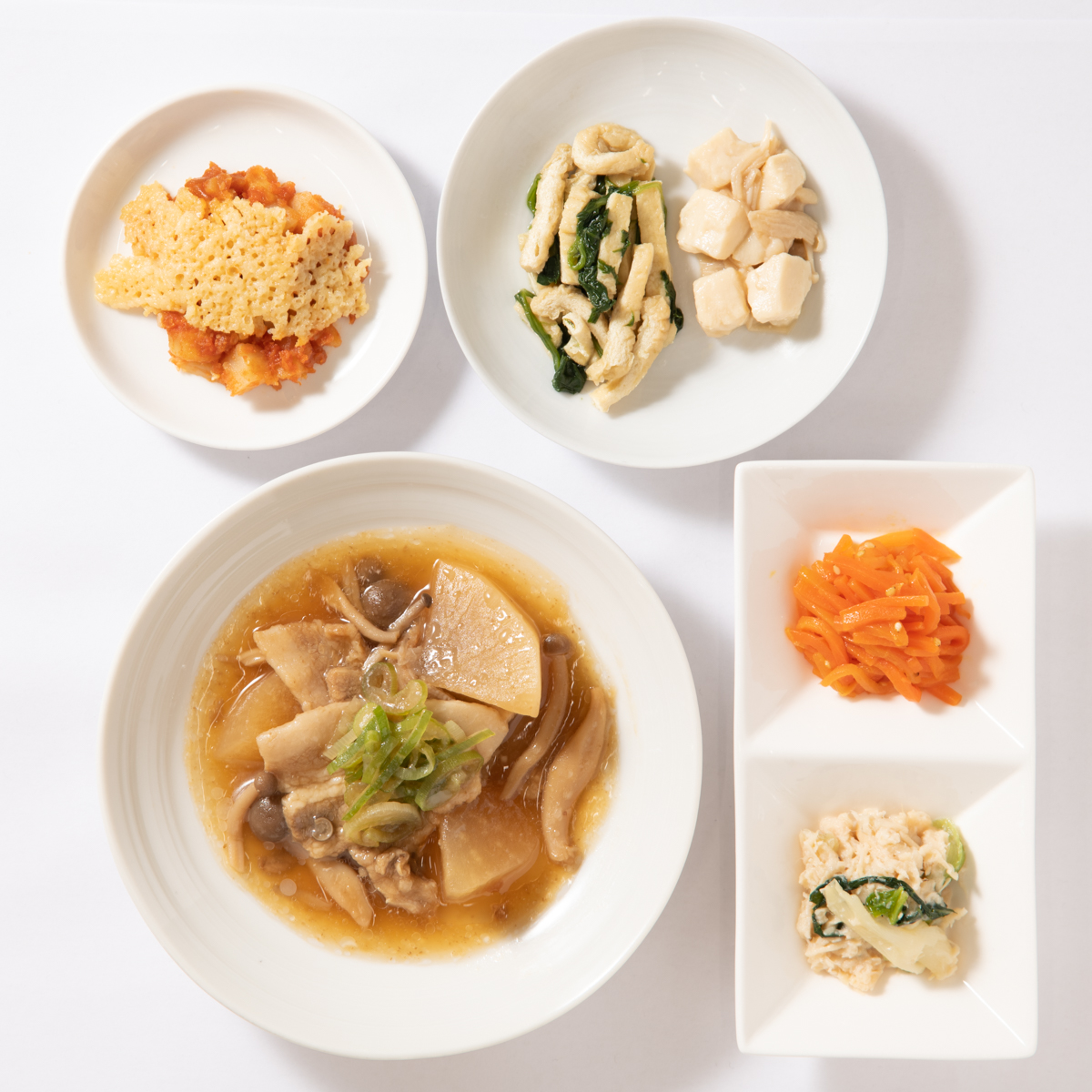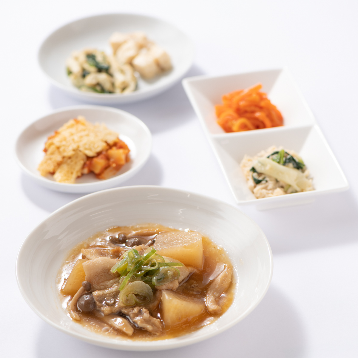 | 原材料名 | だいこん(国産)、豆腐、にんじん、豚バラ肉、鶏ささみ肉水煮・ほぐし肉、ぶなしめじ、ほうれんそう、さつまいも、じゃがいも、油揚げ、たまねぎ、長ねぎ、えのきたけ、ナチュラルチーズ、砂糖、みりん、トマトピューレ、しょうゆ(本醸造)、清酒、こまつな、トマトケチャップ、塩こうじ、食用なたね油、食用調合油(ごま油、大豆油)、液体昆布だし、オイスターソース、米みそ、バター、中国しょうゆ、中濃ソース、液体鰹だし、チーマージャン、洋風だし(コンソメ)、しょうが、にんにく、食塩、いりごま、ブラックペッパー、ホワイトペッパー/増粘剤(加工でん粉、増粘多糖類)、調味料(アミノ酸等)、安定剤(加工でん粉)、酒精、カラメル色素、セルロース、豆腐用凝固剤、pH調整剤、乳化剤、香料、(一部に小麦・乳成分・ごま・大豆・鶏肉・豚肉・りんごを含む) | ||