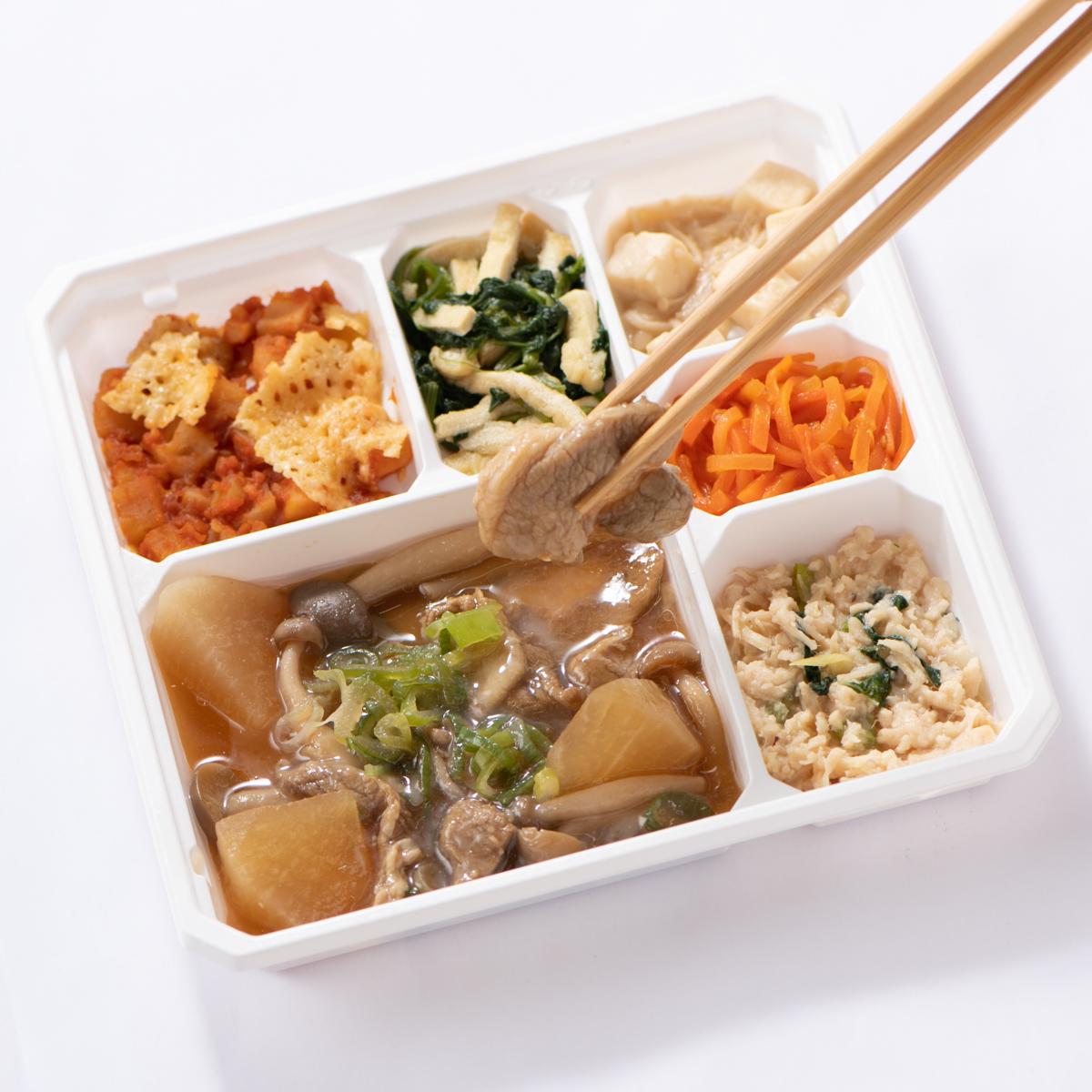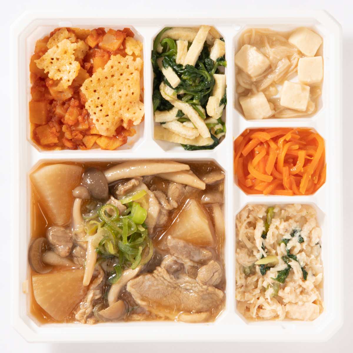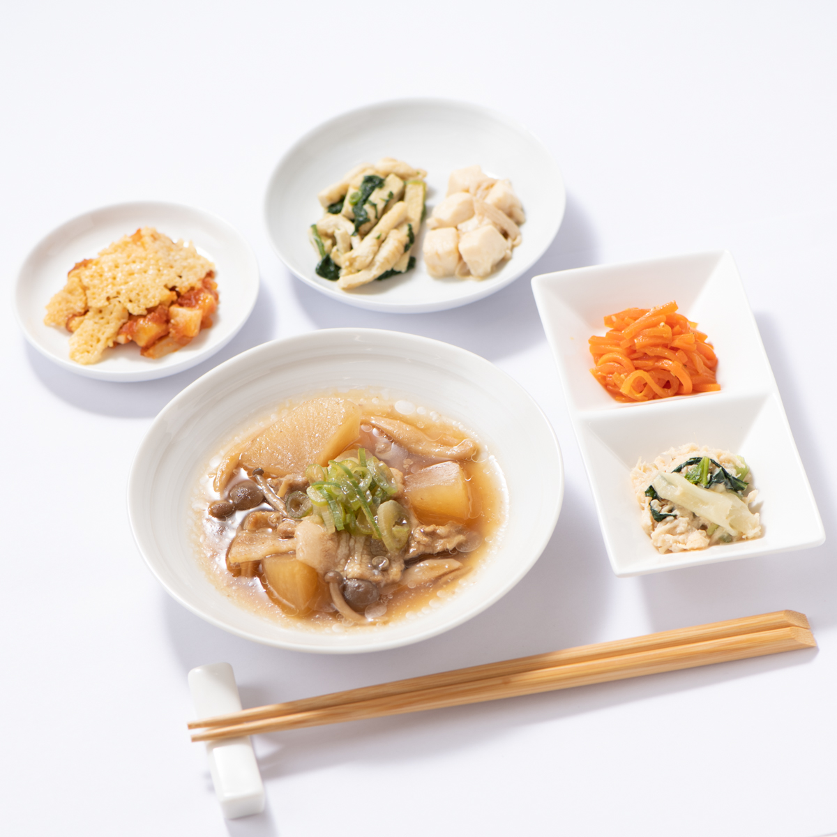 | 原材料名 | だいこん(国産)、豆腐、にんじん、豚バラ肉、鶏ささみ肉水煮・ほぐし肉、ぶなしめじ、ほうれんそう、さつまいも、じゃがいも、油揚げ、たまねぎ、長ねぎ、えのきたけ、ナチュラルチーズ、砂糖、みりん、トマトピューレ、しょうゆ(本醸造)、清酒、こまつな、トマトケチャップ、塩こうじ、食用なたね油、食用調合油(ごま油、大豆油)、液体昆布だし、オイスターソース、米みそ、バター、中国しょうゆ、中濃ソース、液体鰹だし、チーマージャン、洋風だし(コンソメ)、しょうが、にんにく、食塩、いりごま、ブラックペッパー、ホワイトペッパー/増粘剤(加工でん粉、増粘多糖類)、調味料(アミノ酸等)、安定剤(加工でん粉)、酒精、カラメル色素、セルロース、豆腐用凝固剤、pH調整剤、乳化剤、香料、(一部に小麦・乳成分・ごま・大豆・鶏肉・豚肉・りんごを含む) | ||