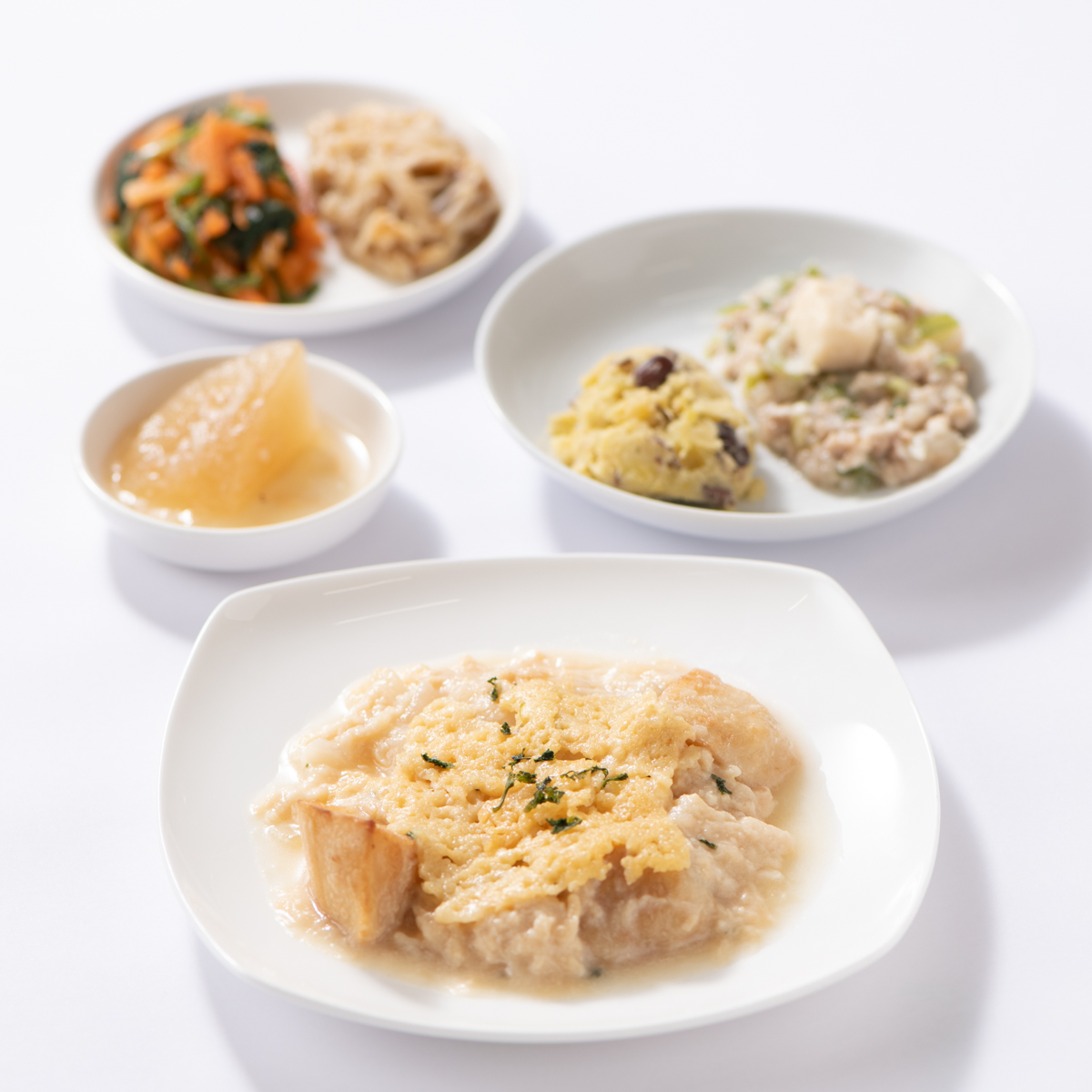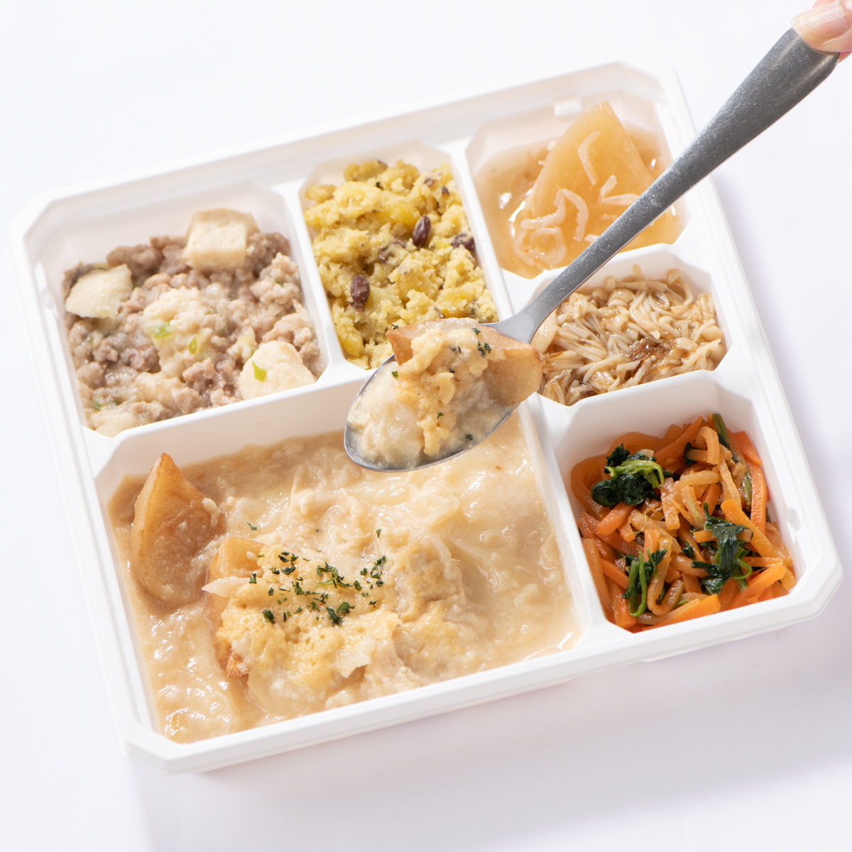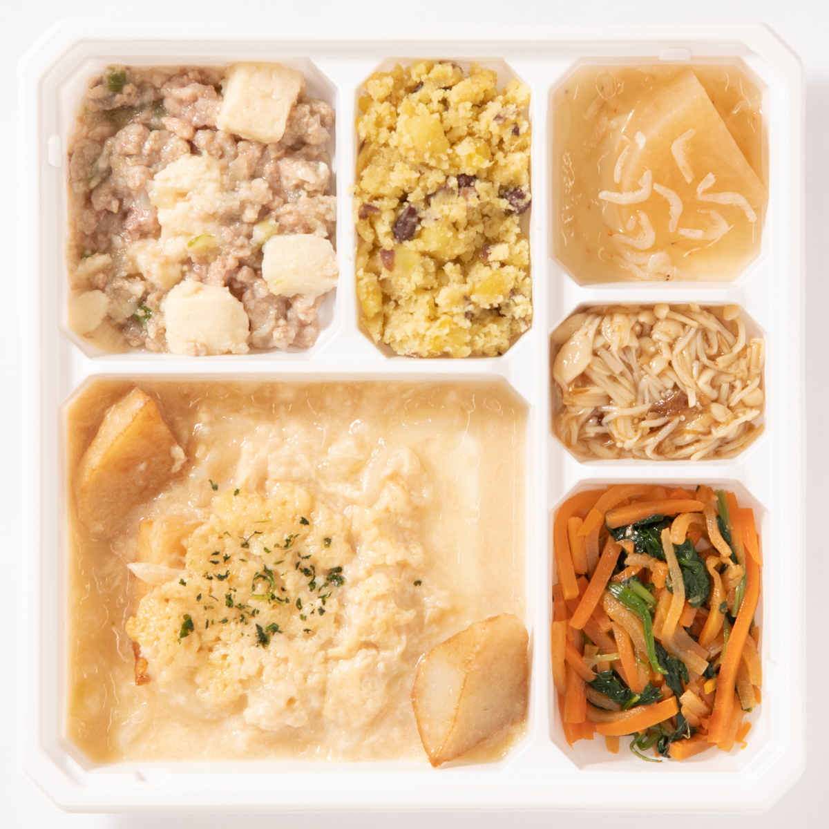 | 原材料名 | たまねぎ(国産)、じゃがいも、えのきたけ、鶏ささみ肉水煮・ほぐし肉、にんじん、豚肉、さつまいも、豆腐、だいこん、ほうれんそう、ナチュラルチーズ、みりん、クリーム、長ねぎ、しょうゆ(本醸造)、蒸し小豆、食用なたね油、りんご酢、バター、砂糖、液体昆布だし、液体鰹だし、米みそ、食用調合油(ごま油、大豆油)、かつお削りぶし、梅肉、干し小エビ、しょうが、パセリ、食塩/増粘剤(加工でん粉、キサンタンガム)、調味料(アミノ酸等)、安定剤(加工でん粉)、セルロース、酒精、豆腐用凝固剤、乳化剤、(一部にえび・小麦・乳成分・ごま・大豆・鶏肉・豚肉・りんごを含む) | ||