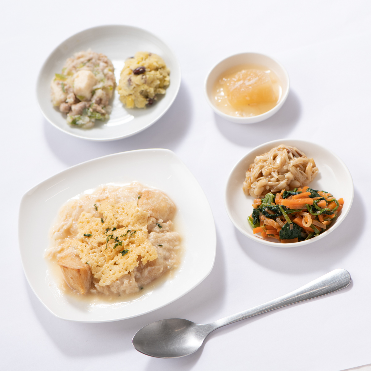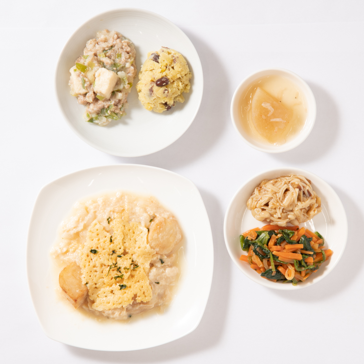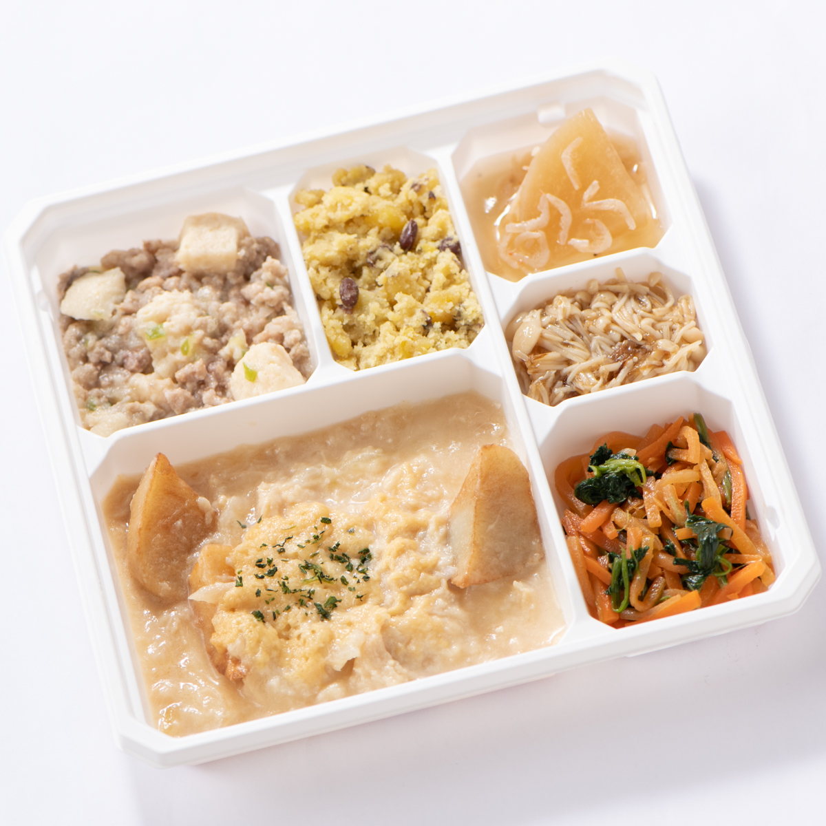 | 原材料名 | たまねぎ(国産)、じゃがいも、えのきたけ、鶏ささみ肉水煮・ほぐし肉、にんじん、豚肉、さつまいも、豆腐、だいこん、ほうれんそう、ナチュラルチーズ、みりん、クリーム、長ねぎ、しょうゆ(本醸造)、蒸し小豆、食用なたね油、りんご酢、バター、砂糖、液体昆布だし、液体鰹だし、米みそ、食用調合油(ごま油、大豆油)、かつお削りぶし、梅肉、干し小エビ、しょうが、パセリ、食塩/増粘剤(加工でん粉、キサンタンガム)、調味料(アミノ酸等)、安定剤(加工でん粉)、セルロース、酒精、豆腐用凝固剤、乳化剤、(一部にえび・小麦・乳成分・ごま・大豆・鶏肉・豚肉・りんごを含む) | ||