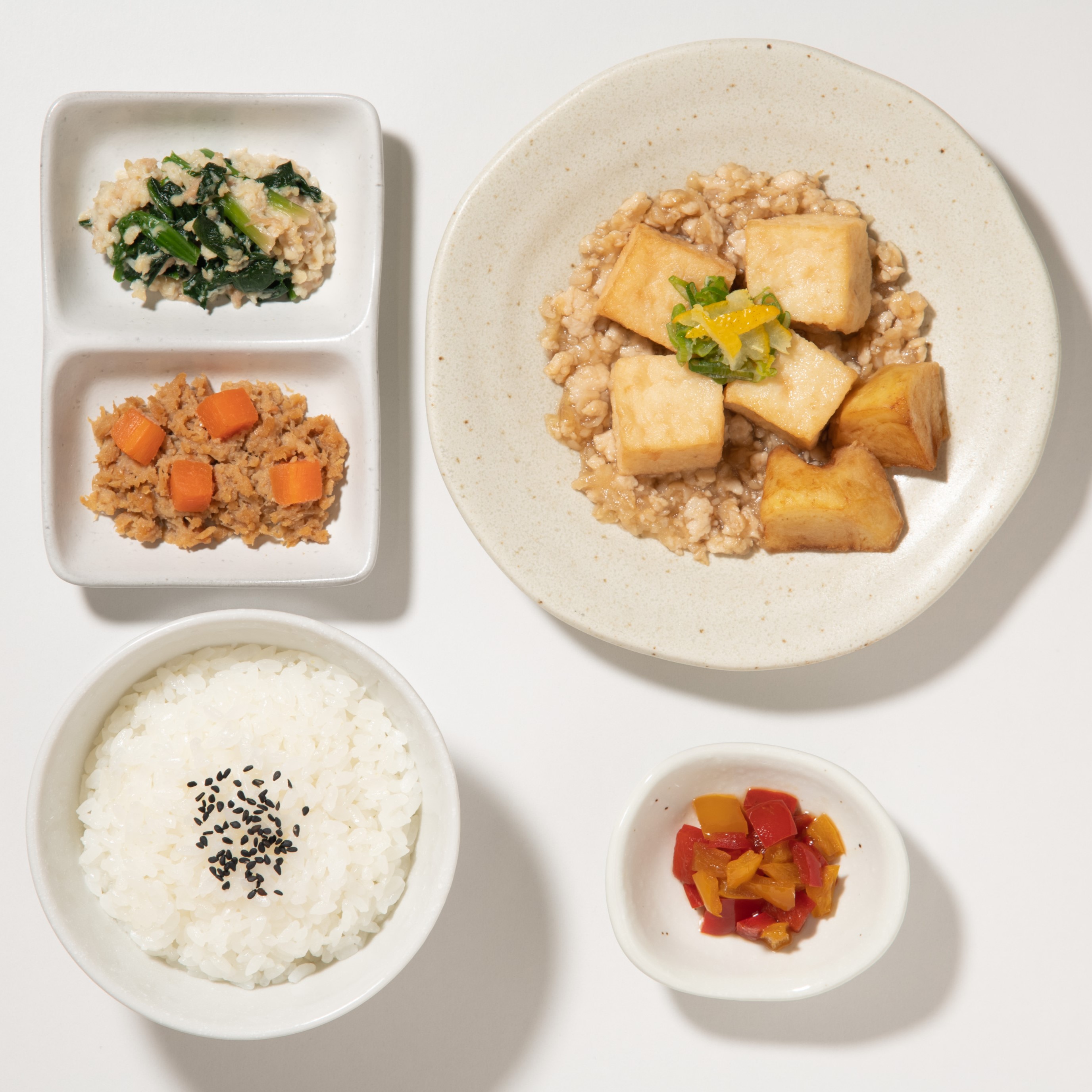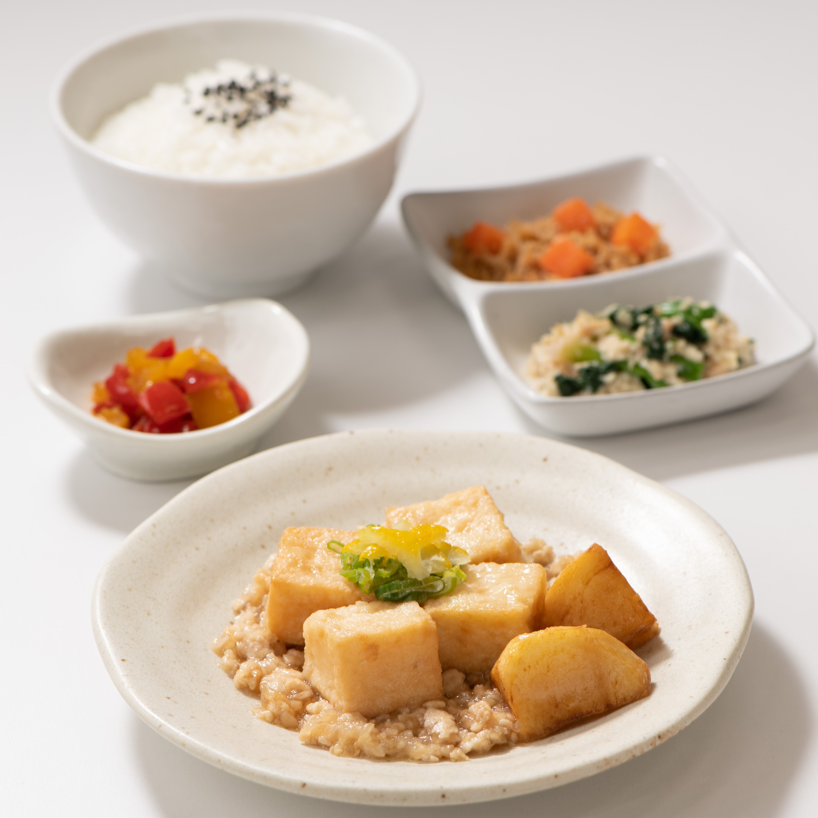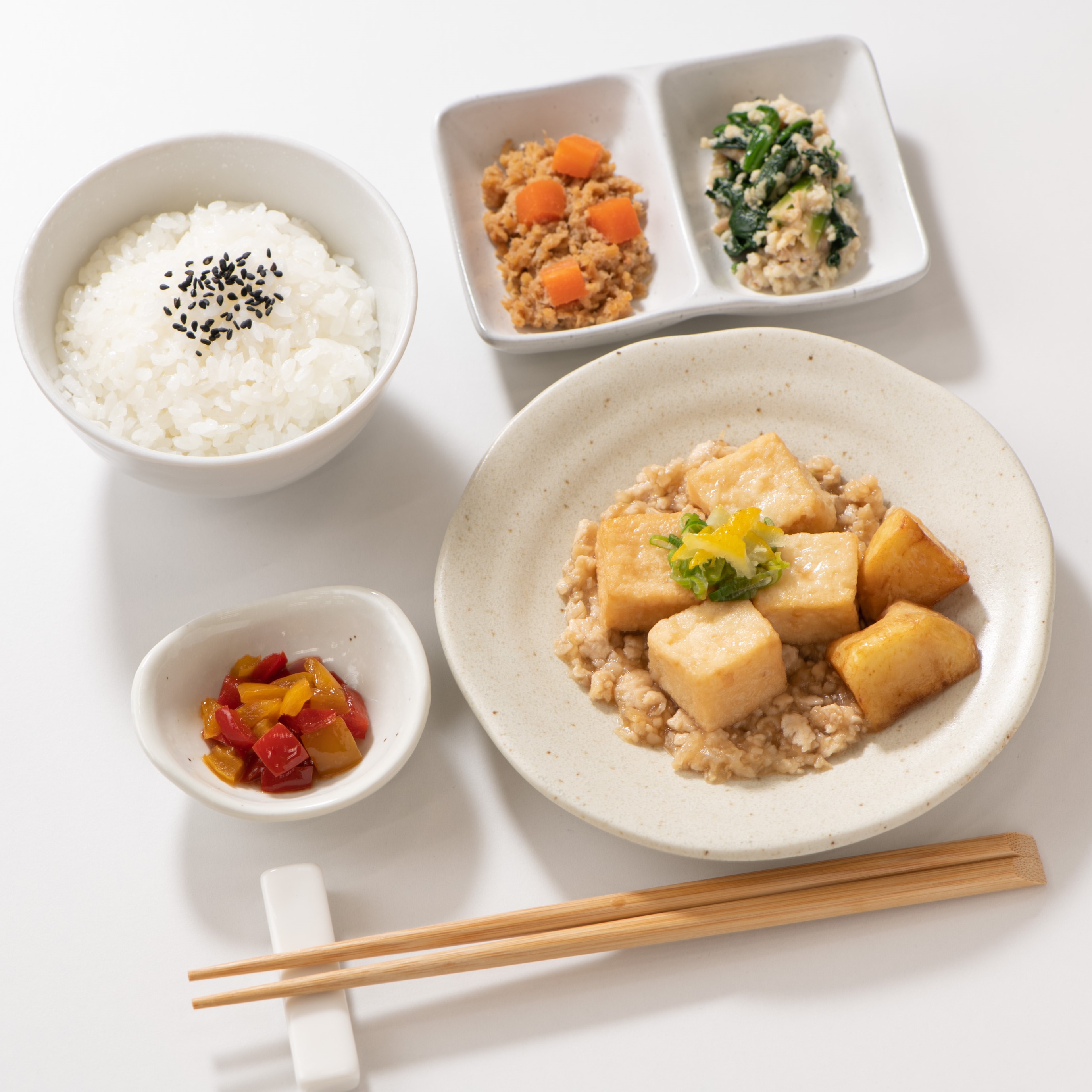 | 原材料名 | 白米(国産)、厚揚げ、鶏肉、じゃがいも、豆腐、にんじん、黄パプリカ、赤パプリカ、ほうれんそう、蒸し大豆、しょうゆ(本醸造)、砂糖、えのきたけ、ぶなしめじ、まぐろ水煮(フレーク)、長ねぎ、食用なたね油、みりん、液体昆布だし、食用調合油(ごま油、大豆油)、柚子、液体鰹だし、清酒、いりごま/増粘剤(加工でん粉、キサンタンガム)、安定剤(加工でん粉)、豆腐用凝固剤、調味料(アミノ酸等)、加工でん粉、酒精、乳化剤、(一部に小麦・ごま・大豆・鶏肉を含む) | ||