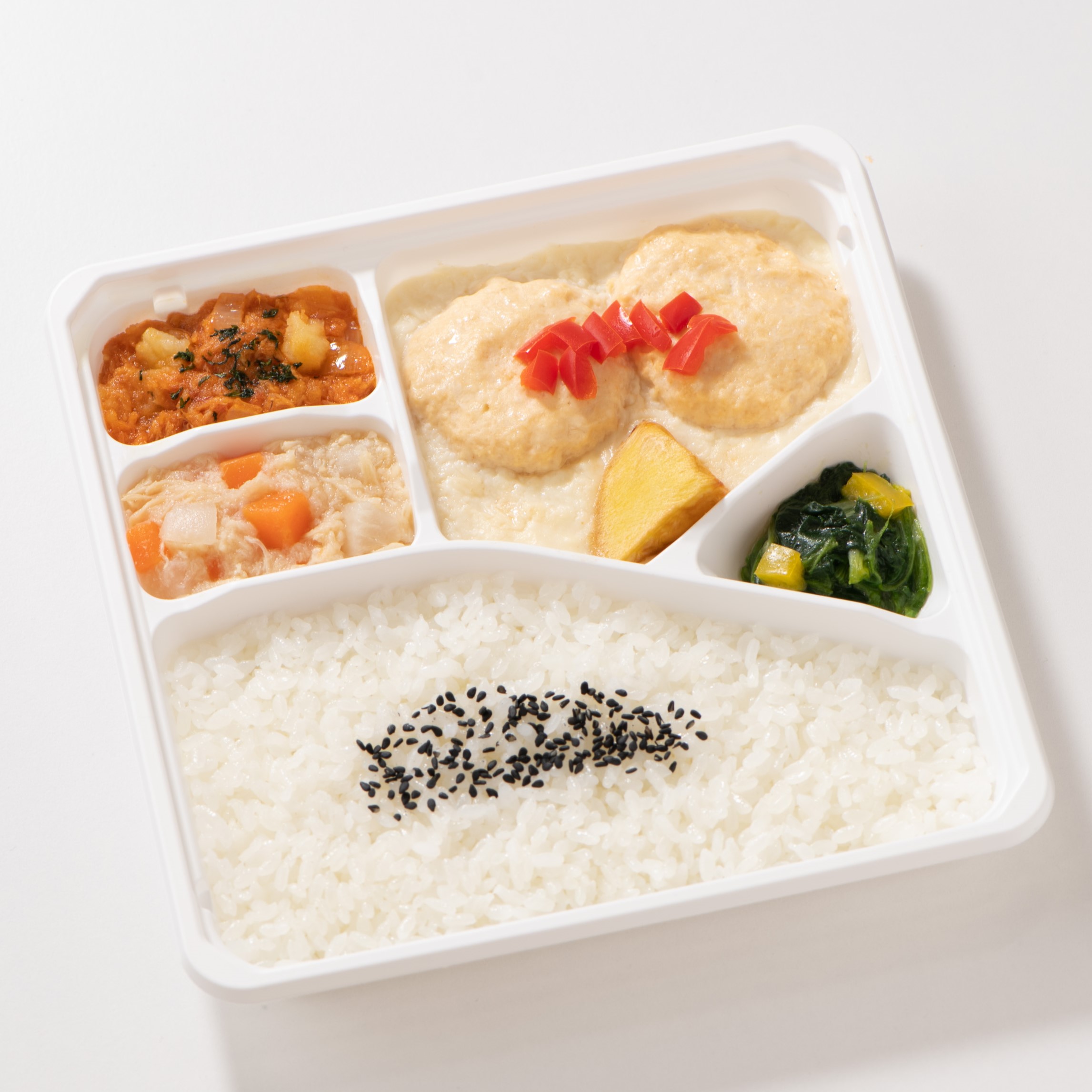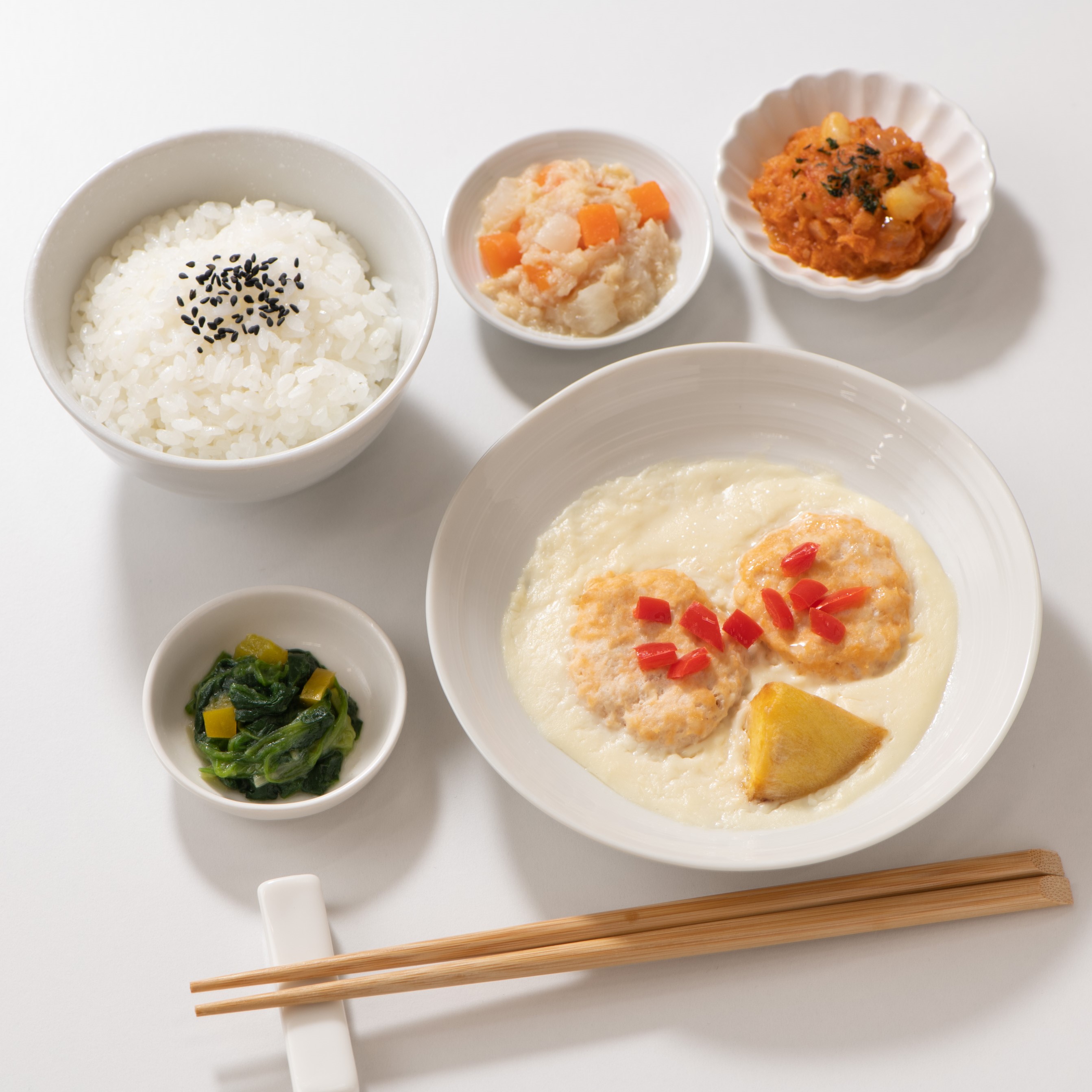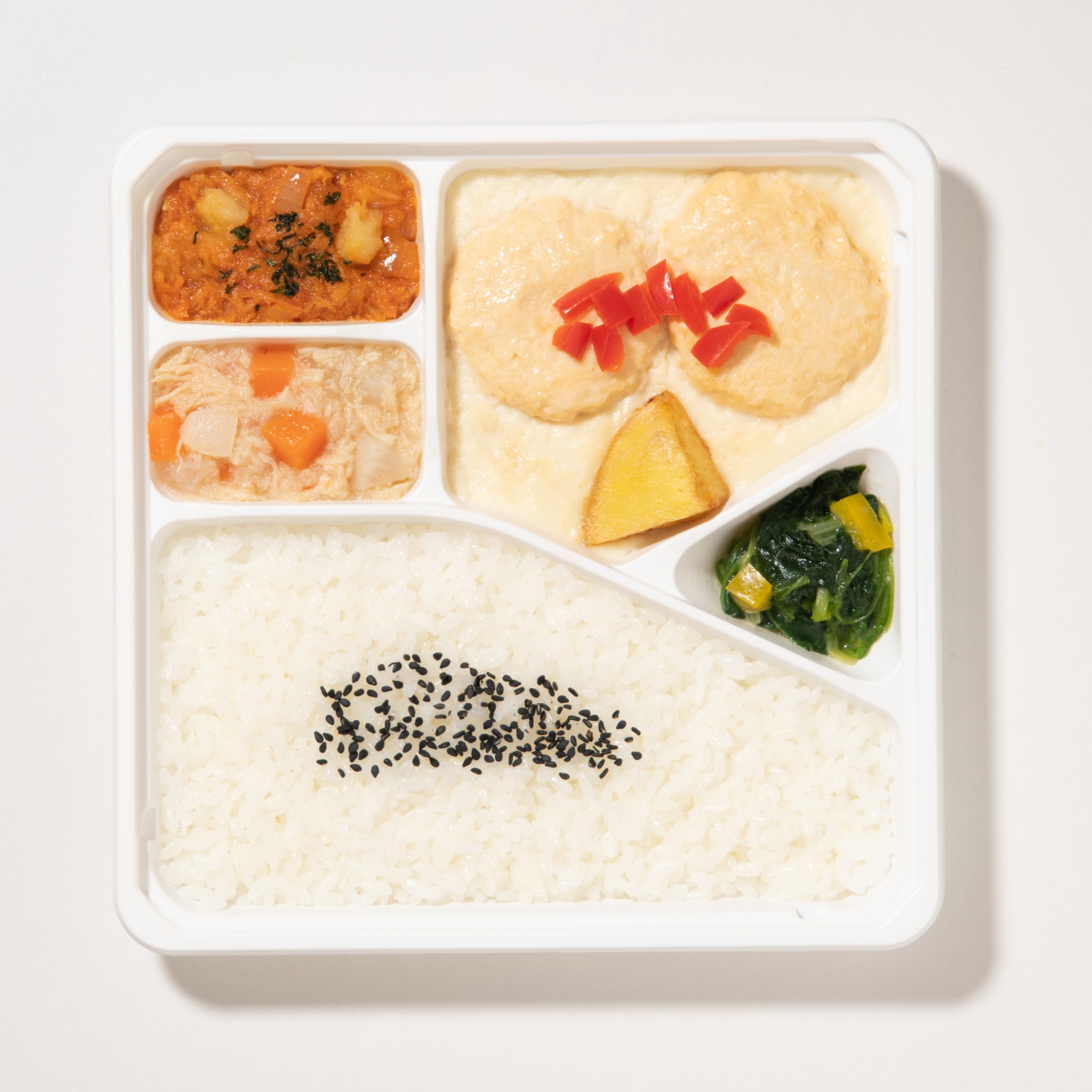 | 原材料名 | 白米(国産)、牛乳、鶏肉、ほうれんそう、豆腐、さつまいも、じゃがいも、トマトケチャップ、まぐろ水煮(フレーク)、鶏卵、にんじん、パン粉、だいこん、食用なたね油、たまねぎ、黄パプリカ、小麦粉、赤パプリカ、バター、チーズフード、トマトピューレ、食用オリーブ油、乾燥スープ(コンソメ)、食塩、砂糖、いりごま、パセリ、ホワイトペッパー/増粘剤(加工でん粉、増粘多糖類)、安定剤(加工でん粉、増粘多糖類)、クエン酸Na、豆腐用凝固剤、酸味料、pH調整剤、乳化剤、酸化防止剤(V.E)、(一部に小麦・卵・乳成分・牛肉・ごま・大豆・鶏肉・ゼラチンを含む) | ||