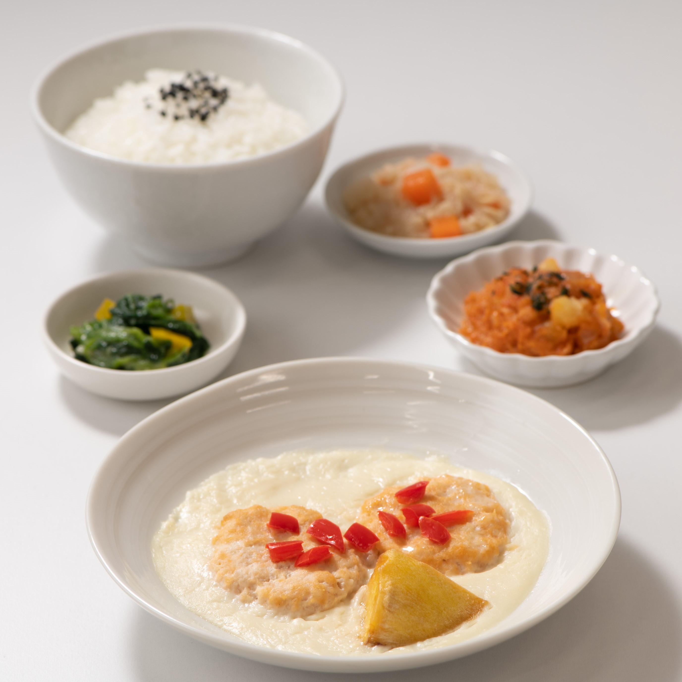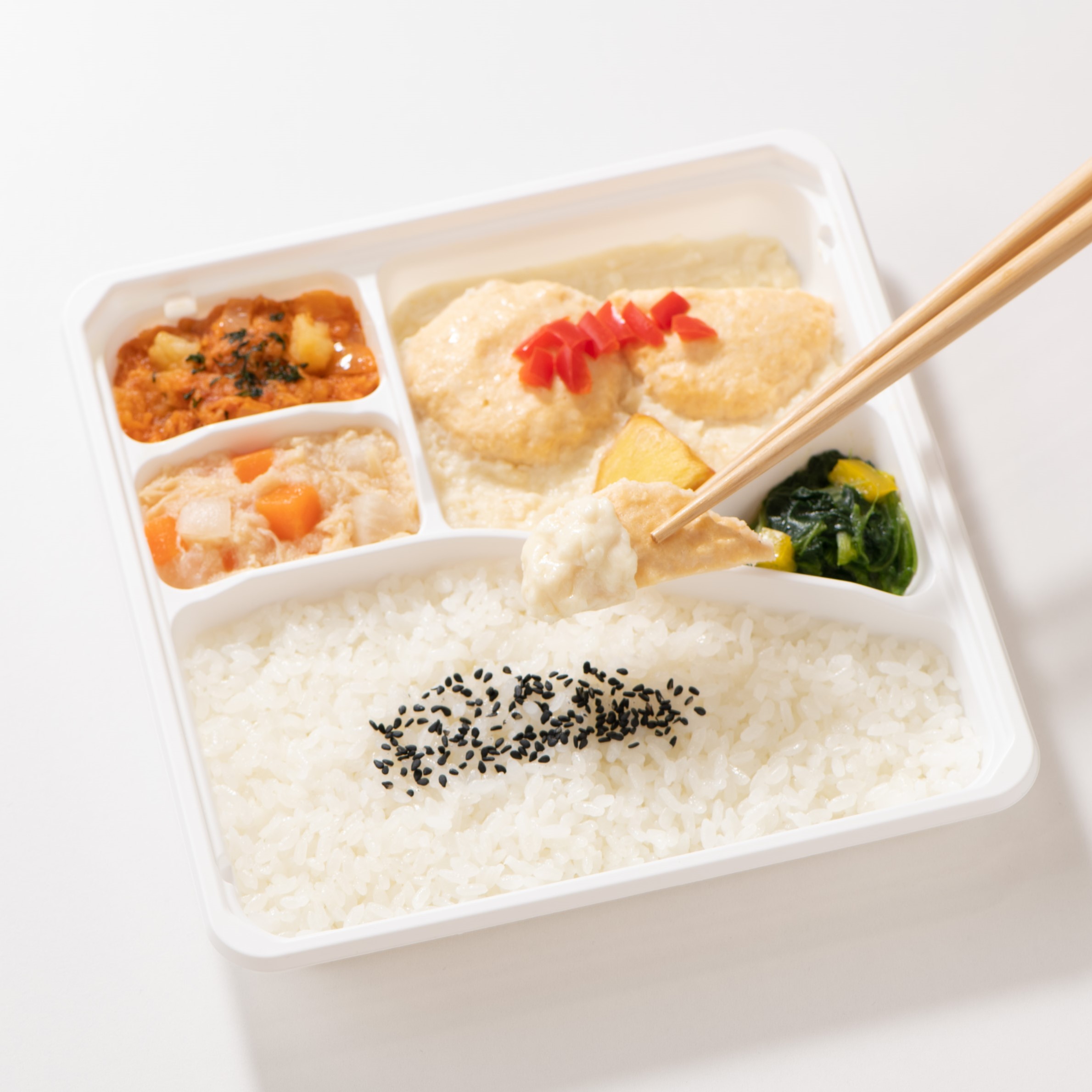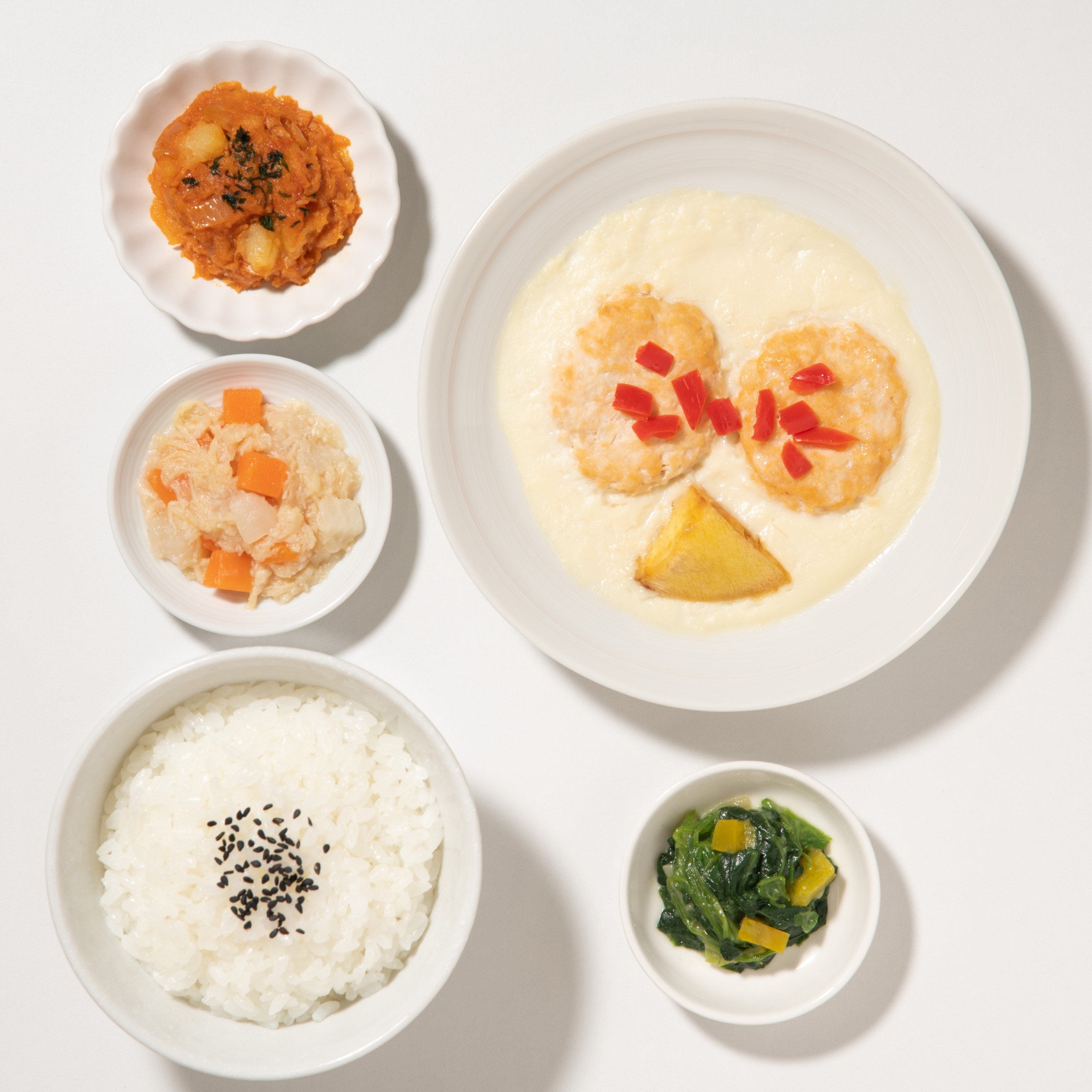 | 原材料名 | 白米(国産)、牛乳、鶏肉、ほうれんそう、豆腐、さつまいも、じゃがいも、トマトケチャップ、まぐろ水煮(フレーク)、鶏卵、にんじん、パン粉、だいこん、食用なたね油、たまねぎ、黄パプリカ、小麦粉、赤パプリカ、バター、チーズフード、トマトピューレ、食用オリーブ油、乾燥スープ(コンソメ)、食塩、砂糖、いりごま、パセリ、ホワイトペッパー/増粘剤(加工でん粉、増粘多糖類)、安定剤(加工でん粉、増粘多糖類)、クエン酸Na、豆腐用凝固剤、酸味料、pH調整剤、乳化剤、酸化防止剤(V.E)、(一部に小麦・卵・乳成分・牛肉・ごま・大豆・鶏肉・ゼラチンを含む) | ||