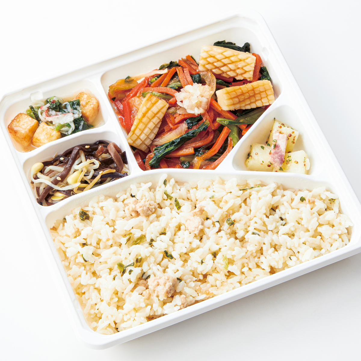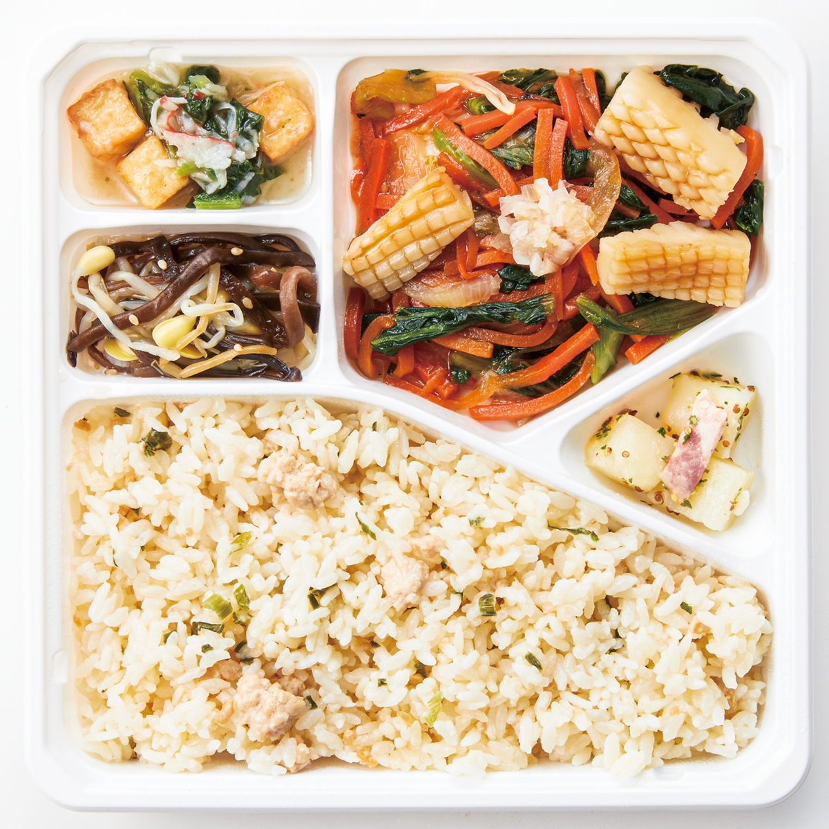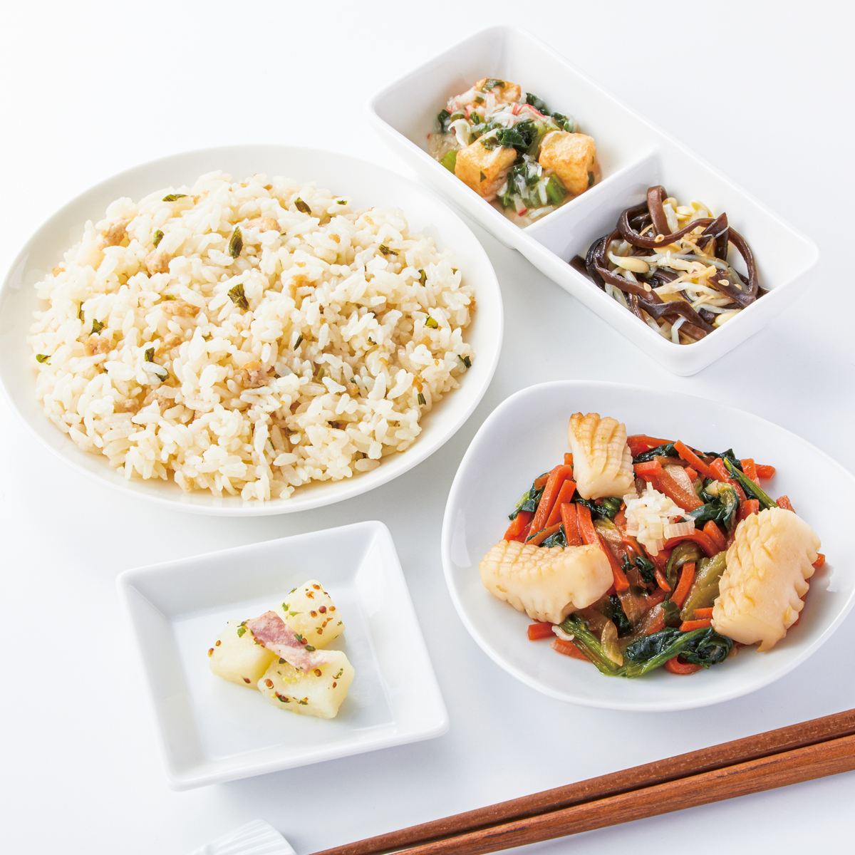 | 原材料名 | ご飯(国産米)、いか、チンゲン菜、鶏肉、じゃがいも、大豆もやし、人参、厚揚げ、玉ねぎ、ねぎ、濃口醤油、ショートニング、なたね油、オイスターソース、大根葉、清酒、かに風味かまぼこ、砂糖、ベーコン、減塩醤油、乾燥きくらげ、おろししょうが、粒入マスタード、ごま油、果実調味料、顆粒中華風だし、食塩、煎り白ごま、顆粒洋風だし、顆粒和風だし、パセリ粉、白こしょう、黒こしょう/増粘剤(加工デンプン、キサンタン)、調味料(アミノ酸等)、トレハロース、加工デンプン、凝固剤、乳化剤、pH調整剤、炭酸Ca、リン酸塩(Na)、香料、酸化防止剤(V.C)、酸味料、発色剤(亜硝酸Na)、着色料(コチニール、カラメル、紅麹、カロチノイド、ラック)、香辛料、(一部に小麦・卵・乳成分・かに・いか・牛肉・ごま・大豆・鶏肉・豚肉・りんご・ゼラチンを含む) | ||