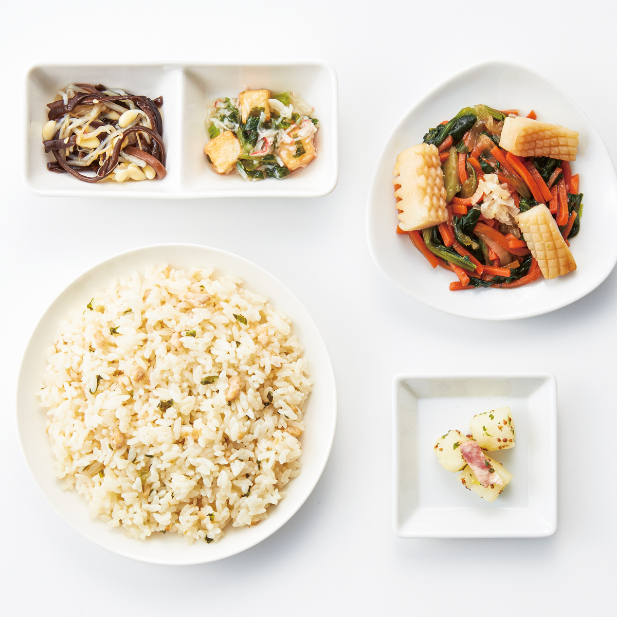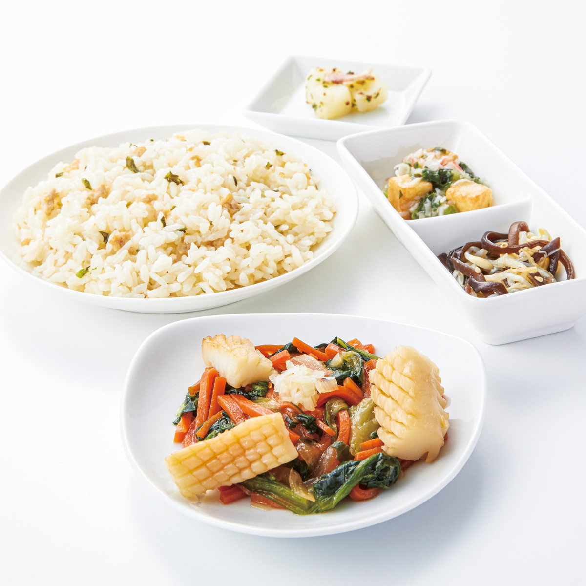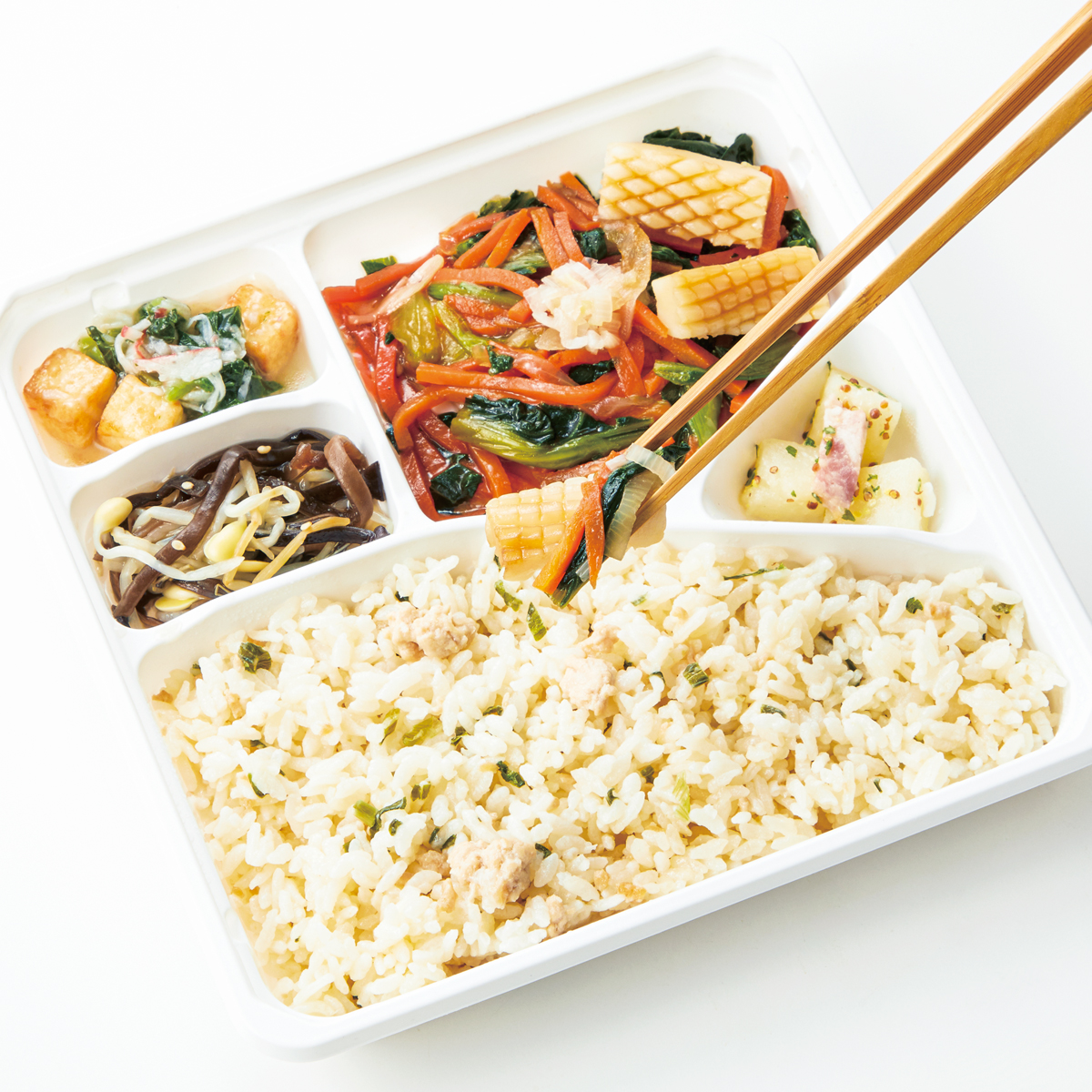 | 原材料名 | ご飯(国産米)、いか、チンゲン菜、鶏肉、じゃがいも、大豆もやし、人参、厚揚げ、玉ねぎ、ねぎ、濃口醤油、ショートニング、なたね油、オイスターソース、大根葉、清酒、かに風味かまぼこ、砂糖、ベーコン、減塩醤油、乾燥きくらげ、おろししょうが、粒入マスタード、ごま油、果実調味料、顆粒中華風だし、食塩、煎り白ごま、顆粒洋風だし、顆粒和風だし、パセリ粉、白こしょう、黒こしょう/増粘剤(加工デンプン、キサンタン)、調味料(アミノ酸等)、トレハロース、加工デンプン、凝固剤、乳化剤、pH調整剤、炭酸Ca、リン酸塩(Na)、香料、酸化防止剤(V.C)、酸味料、発色剤(亜硝酸Na)、着色料(コチニール、カラメル、紅麹、カロチノイド、ラック)、香辛料、(一部に小麦・卵・乳成分・かに・いか・牛肉・ごま・大豆・鶏肉・豚肉・りんご・ゼラチンを含む) | ||