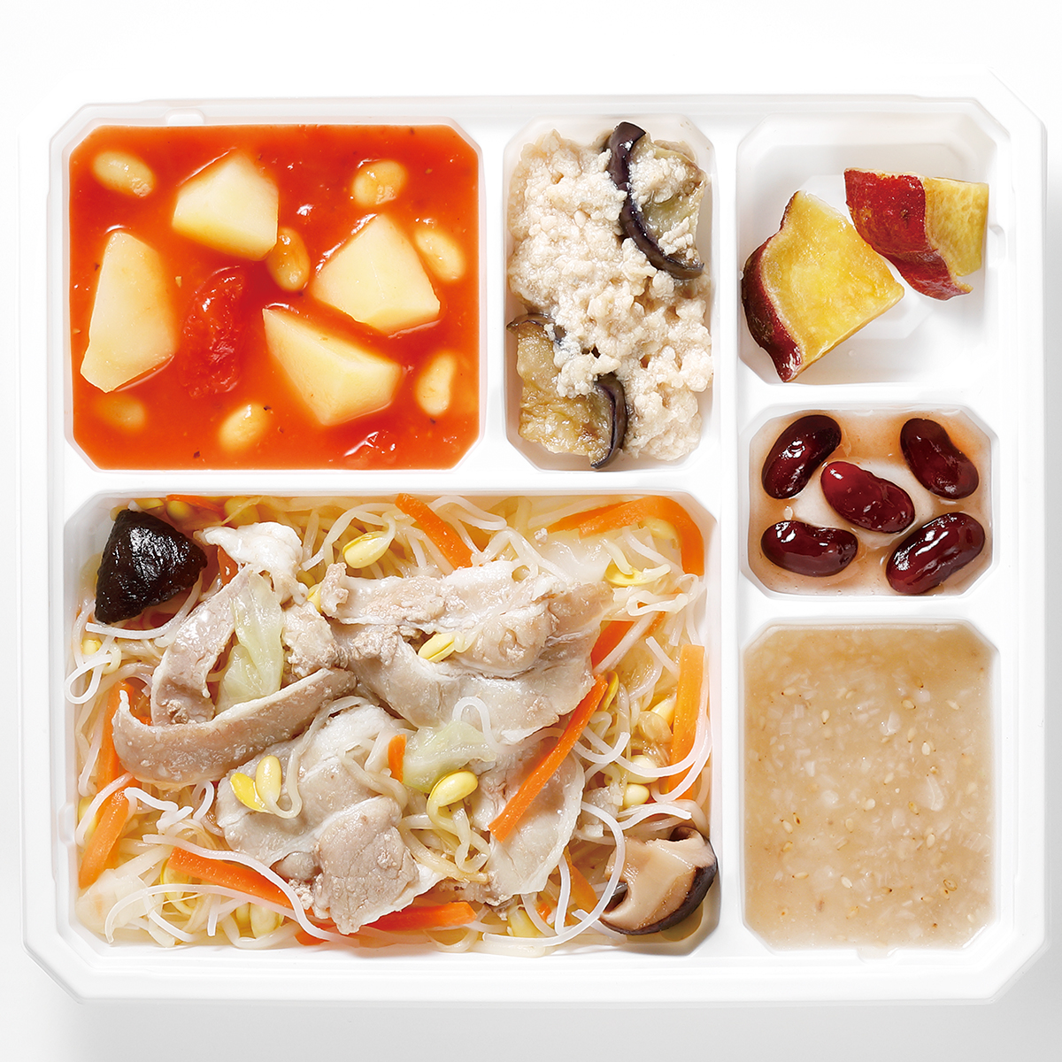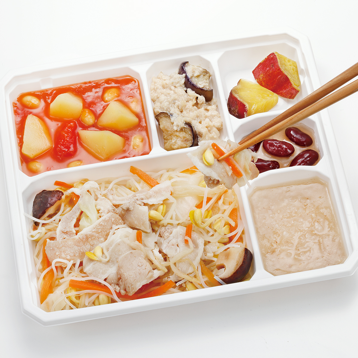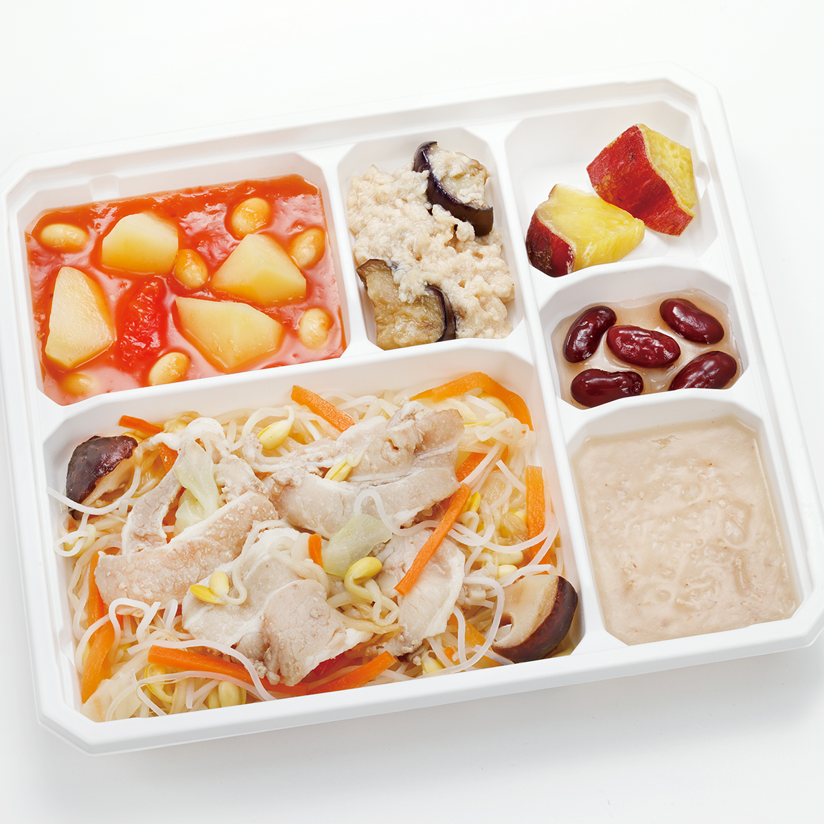 | 原材料名 | 大豆もやし、豚肉、さつまいも、じゃがいも、キャベツ、素揚げなす、鶏肉、人参、トマト・ピューレー漬、ねぎ、赤インゲン豆、大豆、春雨、砂糖、ケチャップ、乾燥しいたけ、トマトソース、濃口醤油、ごま油、食塩、煎り白ごま、発酵調味料、なたね油、果実調味料、はちみつ、おろしにんにく、顆粒和風だし、本みりん、顆粒洋風だし、黒こしょう、白こしょう/増粘剤(加工デンプン)、調味料(アミノ酸等)、pH調整剤、酸味料、(一部に小麦・牛肉・ごま・大豆・鶏肉・豚肉・りんごを含む) | ||