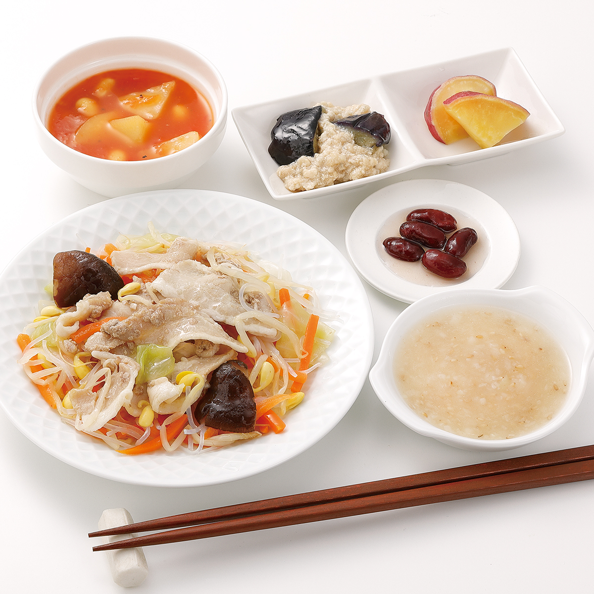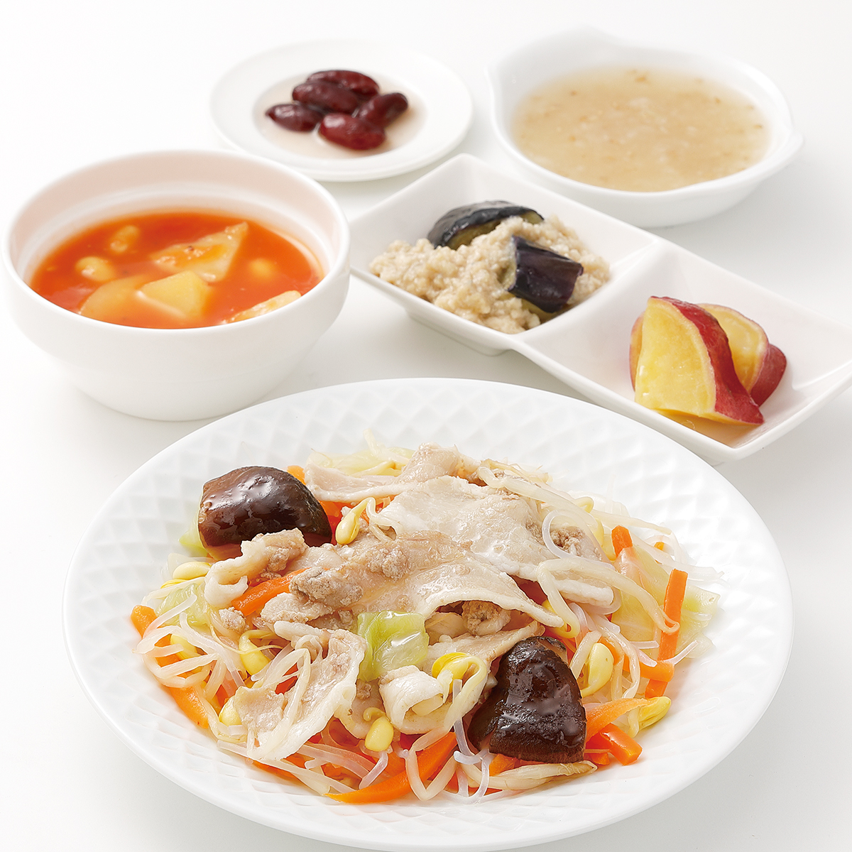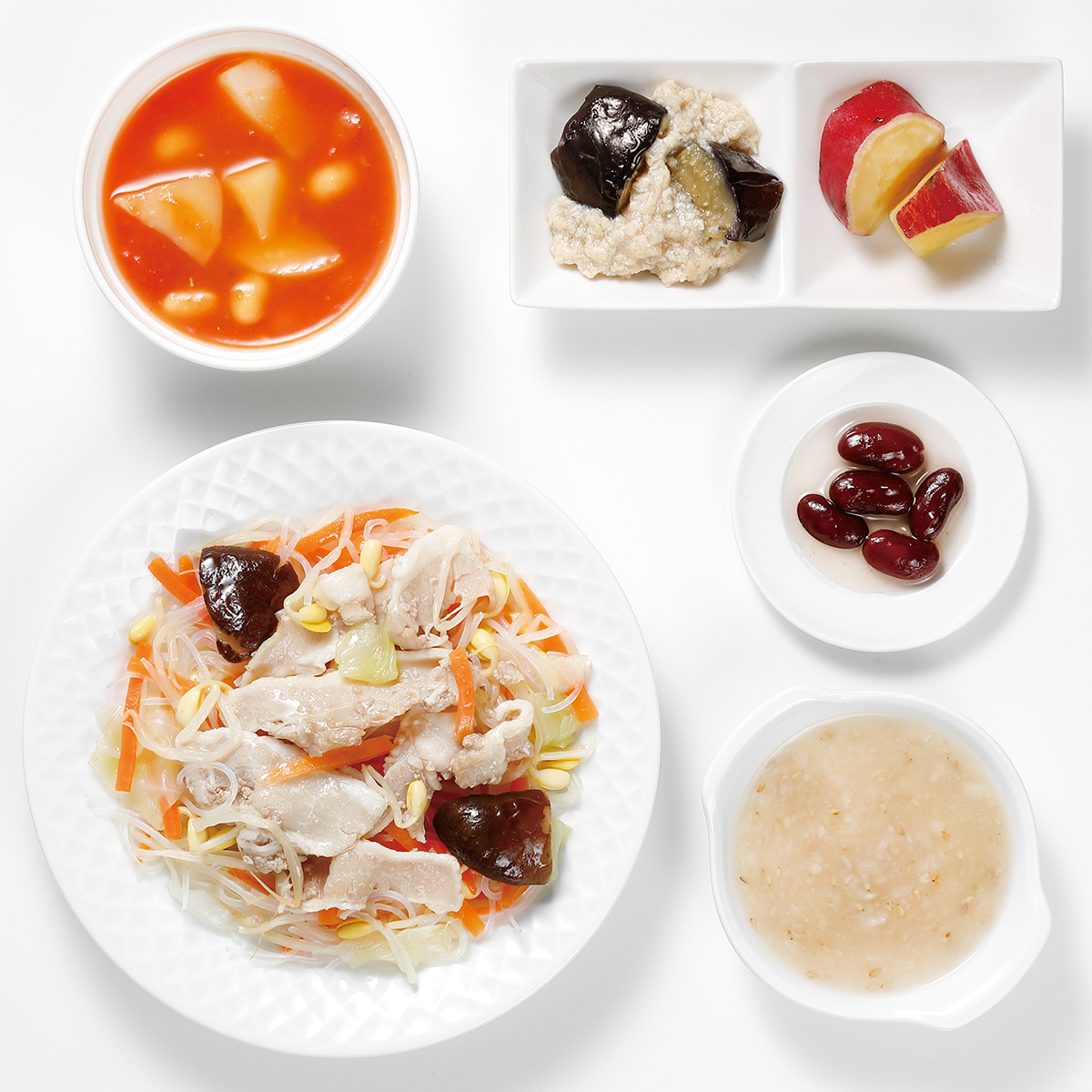 | 原材料名 | 大豆もやし、豚肉、さつまいも、じゃがいも、キャベツ、素揚げなす、鶏肉、人参、トマト・ピューレー漬、ねぎ、赤インゲン豆、大豆、春雨、砂糖、ケチャップ、乾燥しいたけ、トマトソース、濃口醤油、ごま油、食塩、煎り白ごま、発酵調味料、なたね油、果実調味料、はちみつ、おろしにんにく、顆粒和風だし、本みりん、顆粒洋風だし、黒こしょう、白こしょう/増粘剤(加工デンプン)、調味料(アミノ酸等)、pH調整剤、酸味料、(一部に小麦・牛肉・ごま・大豆・鶏肉・豚肉・りんごを含む) | ||