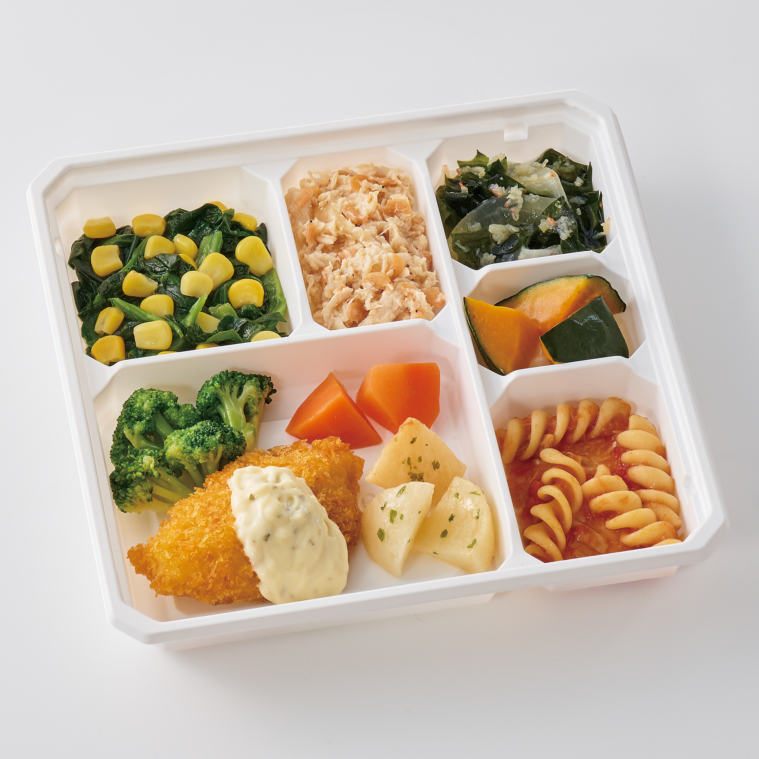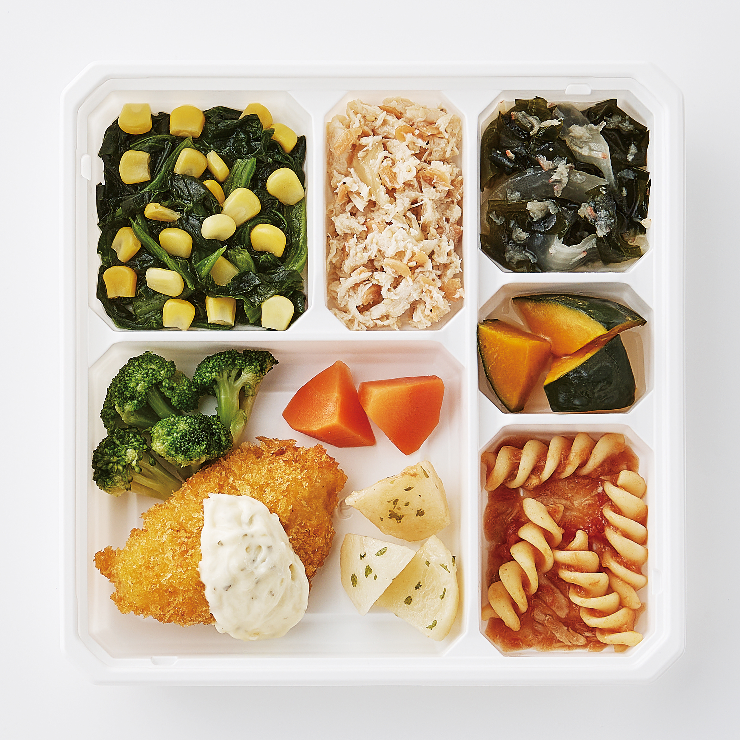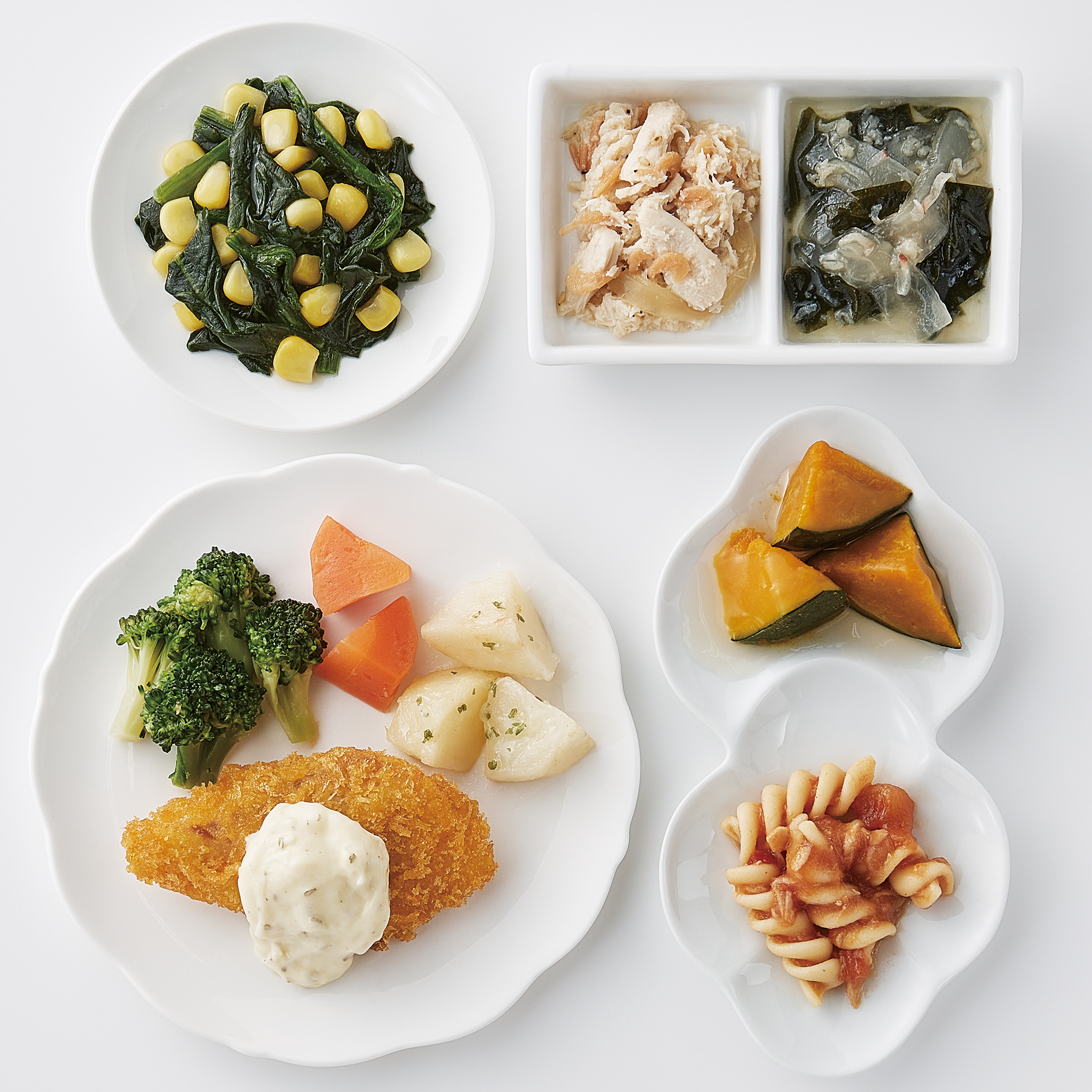| 原材料名 | アブラガレイ(アメリカ)、じゃがいも、ブロッコリー、ほうれん草、かぼちゃ、蒸し鶏、タルタルソース、なたね油、人参、コーン、大根、砂糖、揚げ物用ミックス粉、玉ねぎ、パン粉、トマト・ピューレー漬、マカロニ、ケチャップ、ツナフレーク、かに風味かまぼこ、みそ、醸造酢、バター風味油、乾燥わかめ、乾燥小えび、食塩、濃口醤油、はちみつ、顆粒洋風だし、大豆油、本みりん、ごま、おろしにんにく、パセリ、清酒、こしょう、顆粒和風だし/加工でん粉、増粘剤(加工でん粉、増粘多糖類)、調味料(アミノ酸等)、ポリリン酸Na、酸化防止剤(V.C)、着色料(カロチノイド、紅麹、V.B2、カラメル、ラック)、炭酸Ca、香料、酸味料、乳化剤、香辛料、(一部にえび・かに・小麦・卵・乳成分・牛肉・ごま・大豆・鶏肉・豚肉を含む) | ||