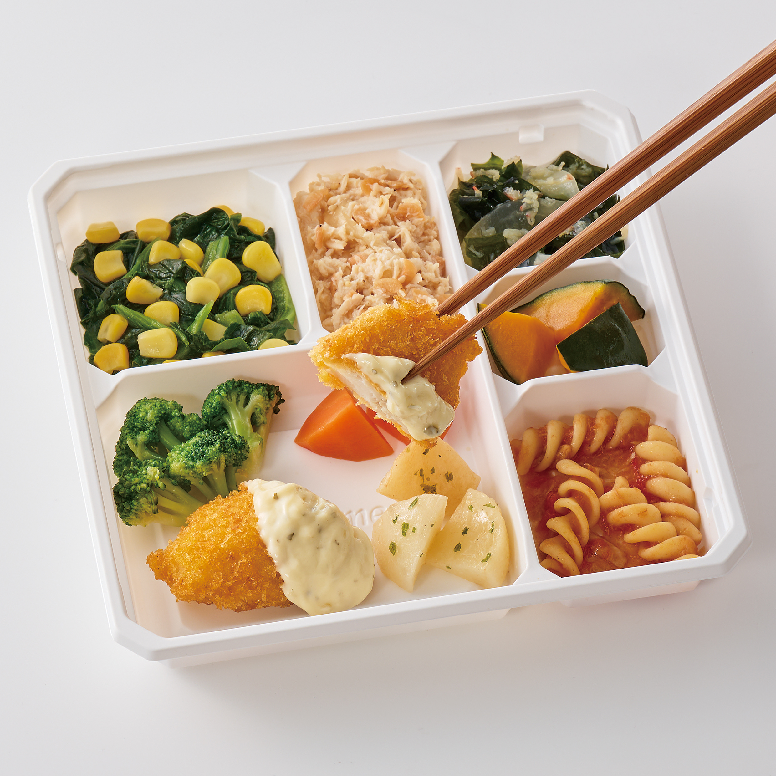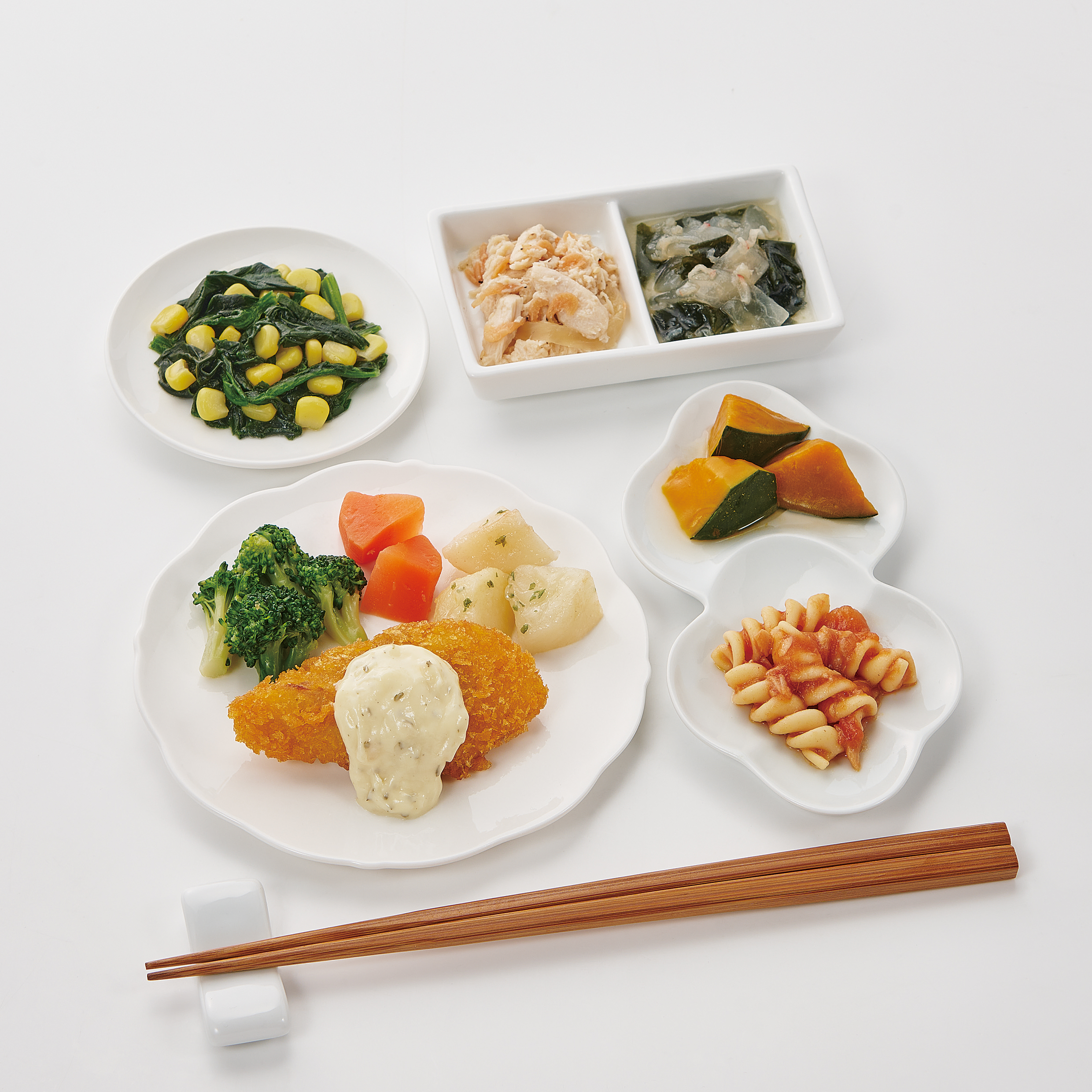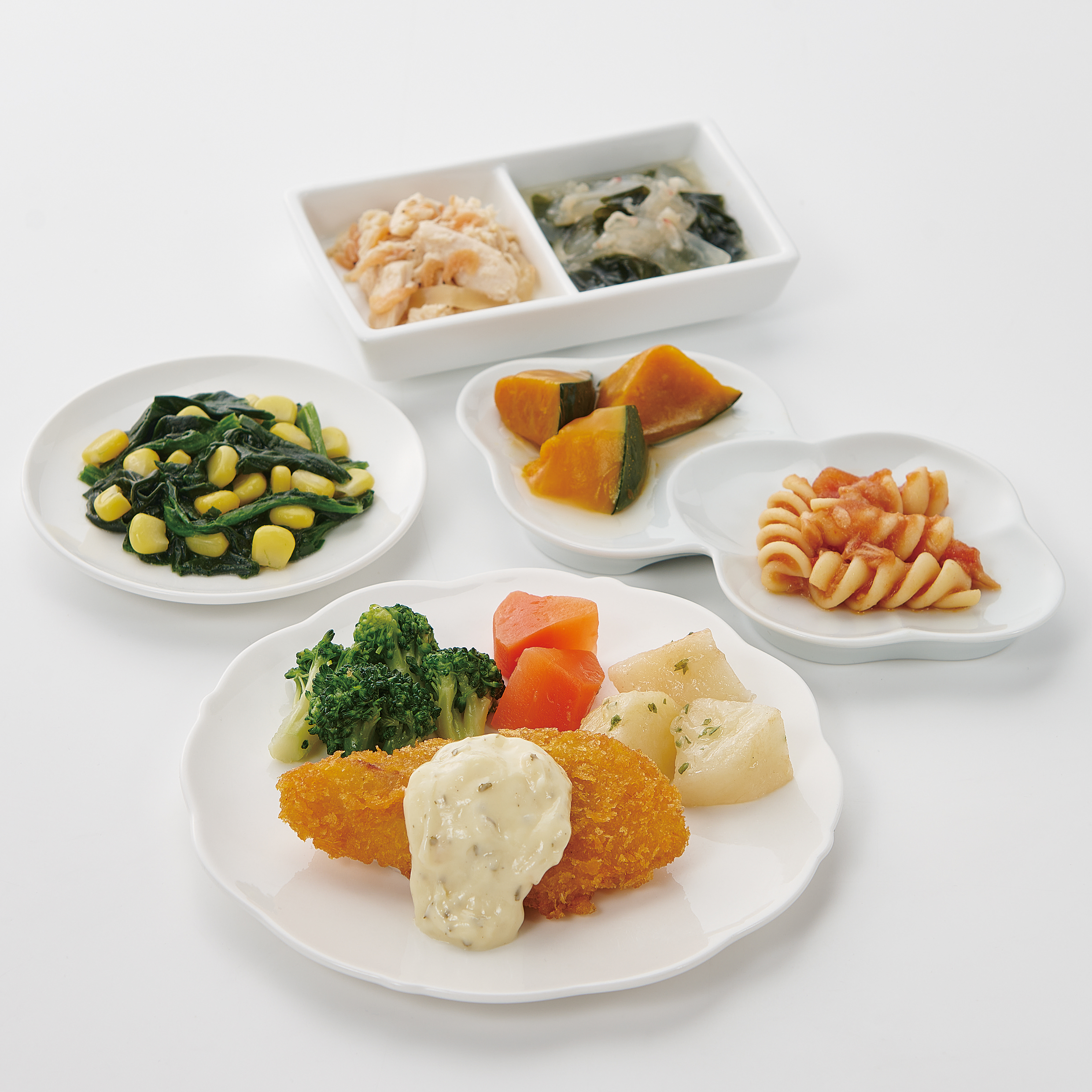 | 原材料名 | アブラガレイ(アメリカ)、じゃがいも、ブロッコリー、ほうれん草、かぼちゃ、蒸し鶏、タルタルソース、なたね油、人参、コーン、大根、砂糖、揚げ物用ミックス粉、玉ねぎ、パン粉、トマト・ピューレー漬、マカロニ、ケチャップ、ツナフレーク、かに風味かまぼこ、みそ、醸造酢、バター風味油、乾燥わかめ、乾燥小えび、食塩、濃口醤油、はちみつ、顆粒洋風だし、大豆油、本みりん、ごま、おろしにんにく、パセリ、清酒、こしょう、顆粒和風だし/加工でん粉、増粘剤(加工でん粉、増粘多糖類)、調味料(アミノ酸等)、ポリリン酸Na、酸化防止剤(V.C)、着色料(カロチノイド、紅麹、V.B2、カラメル、ラック)、炭酸Ca、香料、酸味料、乳化剤、香辛料、(一部にえび・かに・小麦・卵・乳成分・牛肉・ごま・大豆・鶏肉・豚肉を含む) | ||