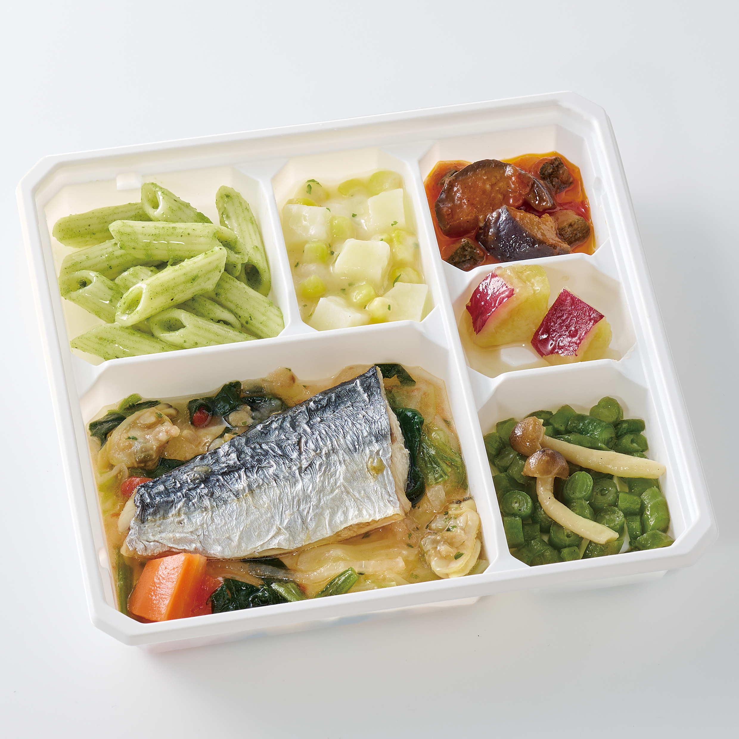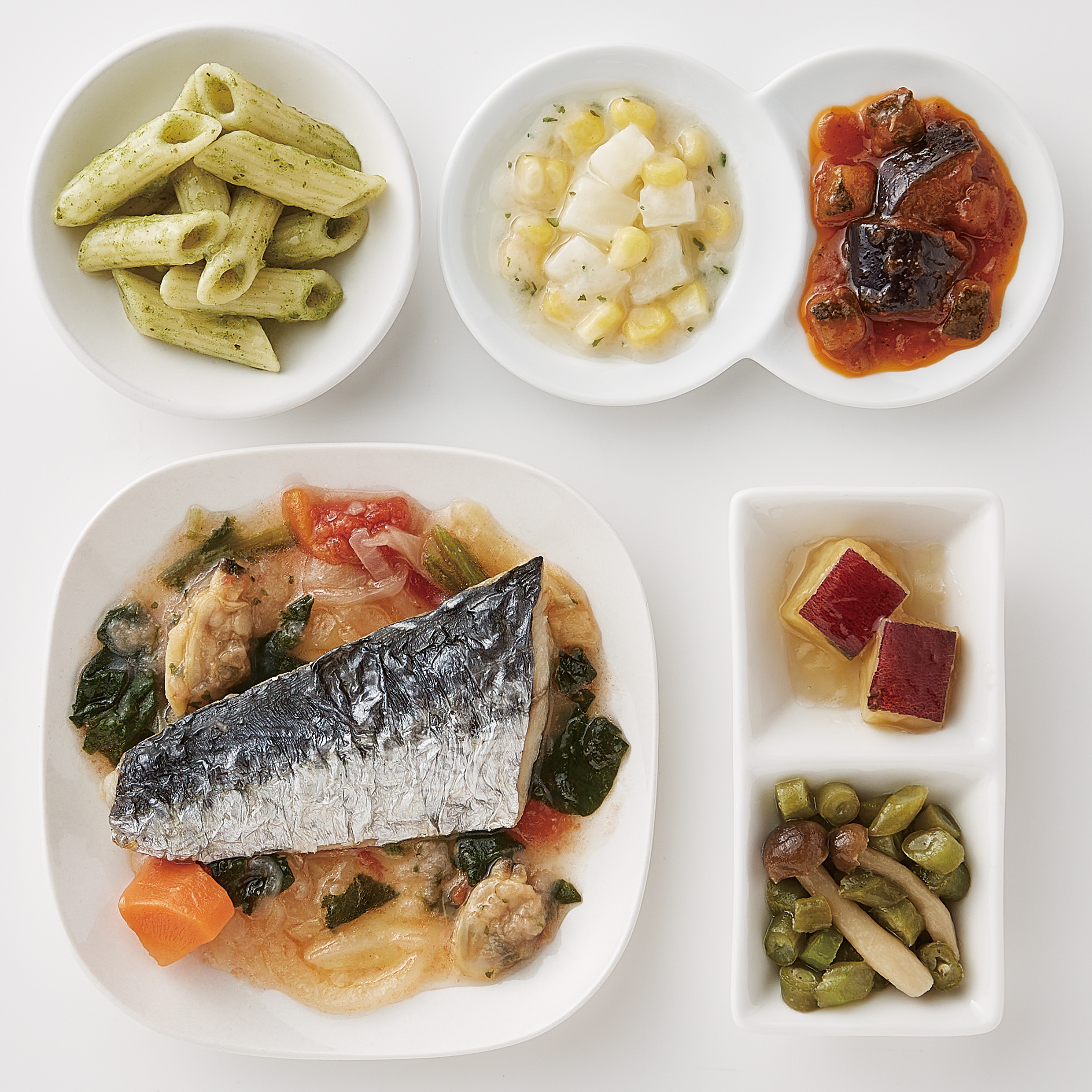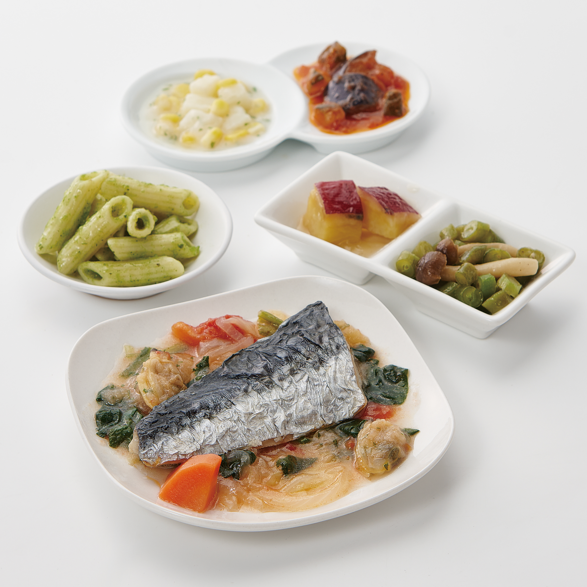 | 原材料名 | さわら(中国)、さやいんげん、トマト・ピューレー漬、さつまいも、キャベツ、マカロニ、じゃがいも、ほうれん草、玉ねぎ、揚げなす、ゆであさり、大豆油、人参、砂糖、ぶなしめじ、コーン、ケチャップ、ズッキーニ、なたね油、牛乳、ホワイトソース、バジルソース、食塩、白ワイン、ほうれん草ピューレ、おろしにんにく、レモン果汁、オリーブ油、顆粒洋風だし、バター風味油、ほたてエキスパウダー、ゼラチン、こしょう、パセリ/増粘剤(加工でん粉)、調味料(アミノ酸等)、香料、酸味料、乳化剤、香辛料、着色料(カロチン)、(一部に小麦・乳成分・牛肉・大豆・鶏肉・豚肉・ゼラチンを含む) | ||