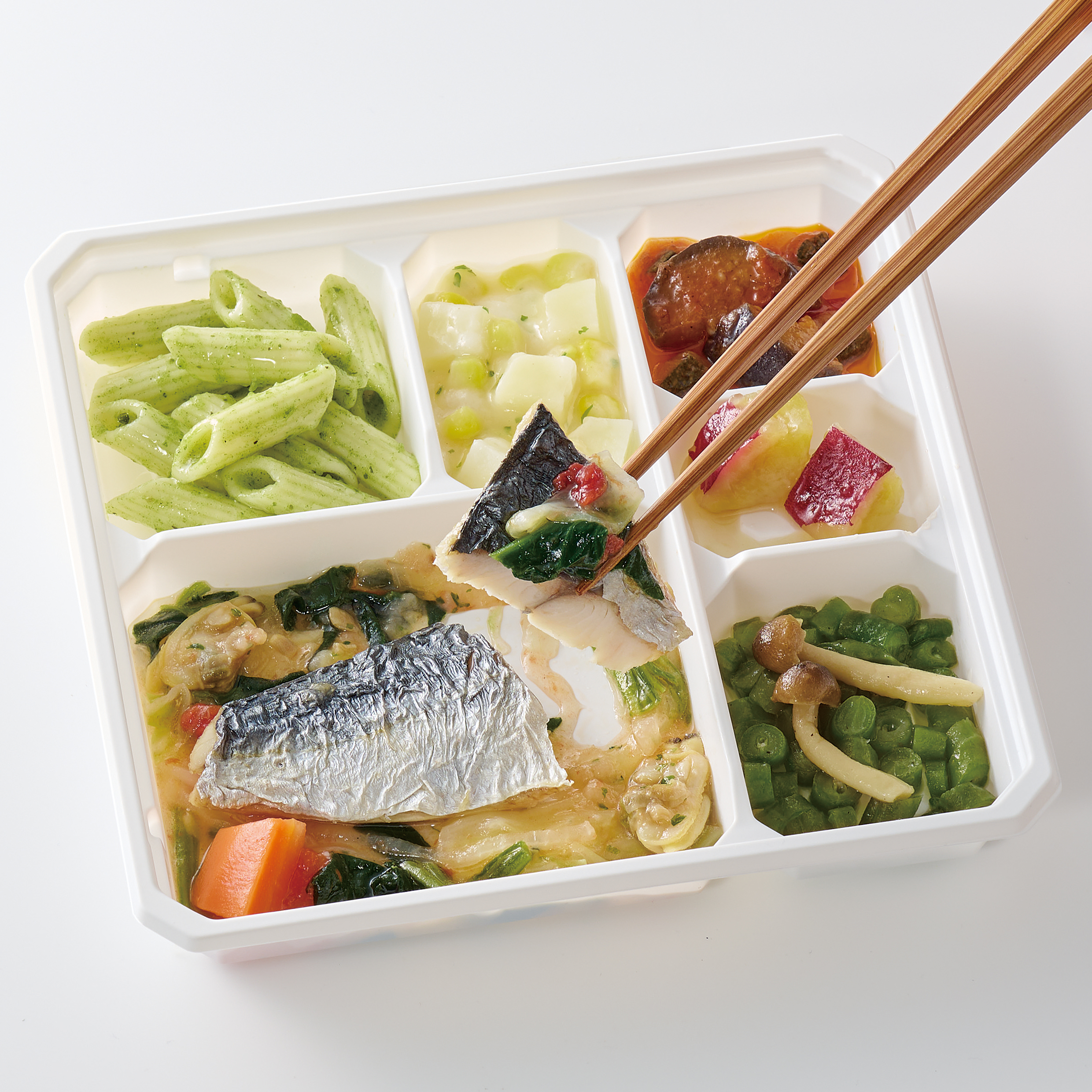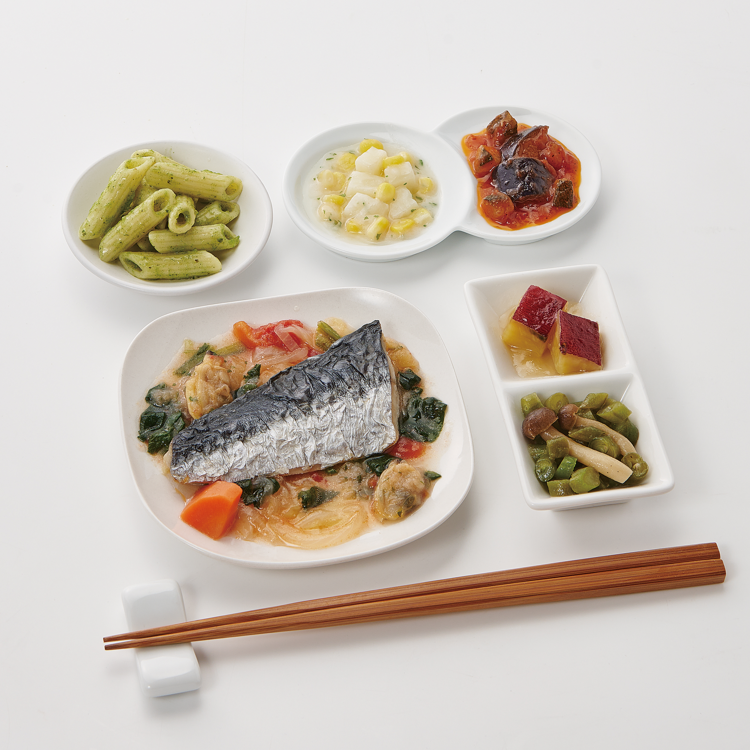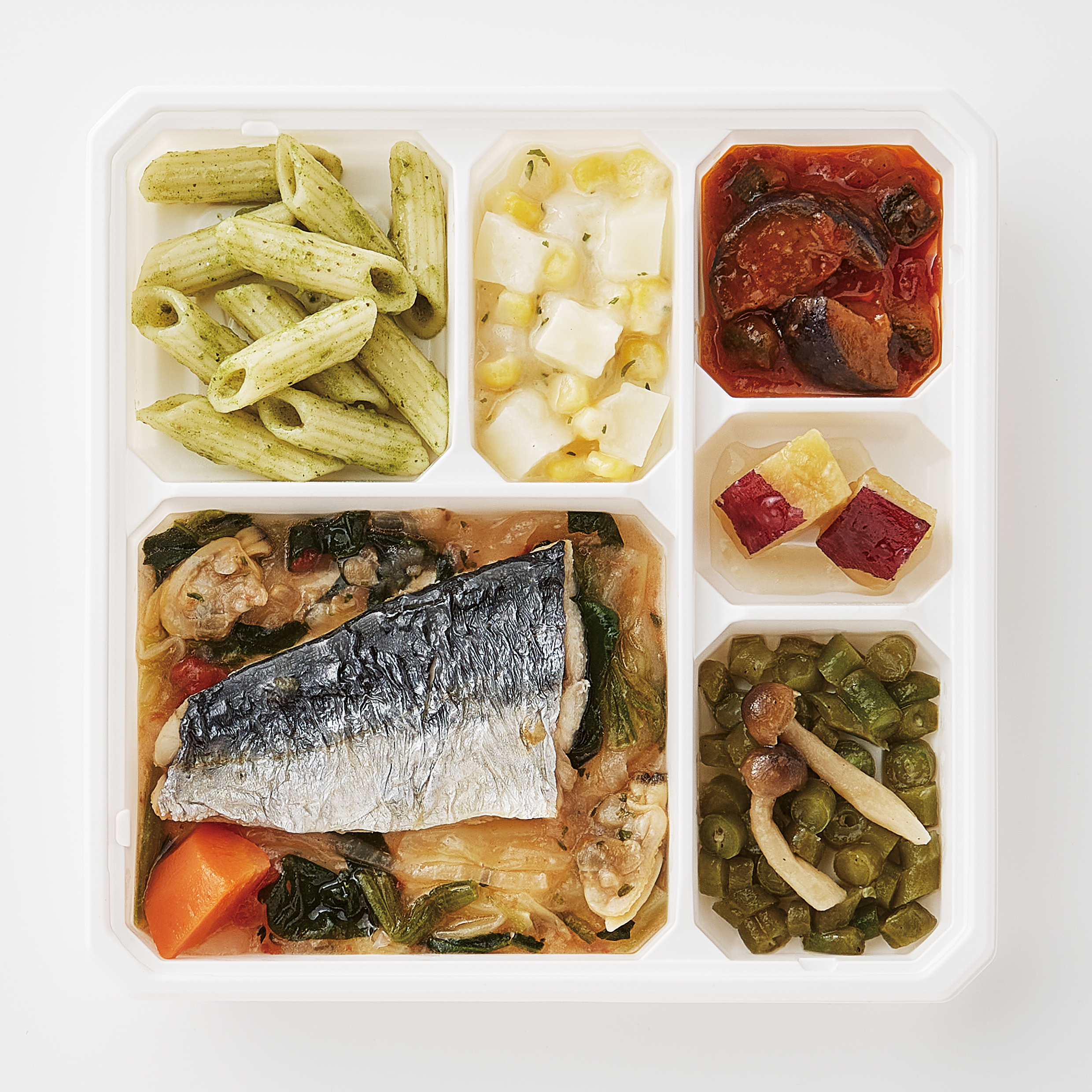 | 原材料名 | さわら(中国)、さやいんげん、トマト・ピューレー漬、さつまいも、キャベツ、マカロニ、じゃがいも、ほうれん草、玉ねぎ、揚げなす、ゆであさり、大豆油、人参、砂糖、ぶなしめじ、コーン、ケチャップ、ズッキーニ、なたね油、牛乳、ホワイトソース、バジルソース、食塩、白ワイン、ほうれん草ピューレ、おろしにんにく、レモン果汁、オリーブ油、顆粒洋風だし、バター風味油、ほたてエキスパウダー、ゼラチン、こしょう、パセリ/増粘剤(加工でん粉)、調味料(アミノ酸等)、香料、酸味料、乳化剤、香辛料、着色料(カロチン)、(一部に小麦・乳成分・牛肉・大豆・鶏肉・豚肉・ゼラチンを含む) | ||